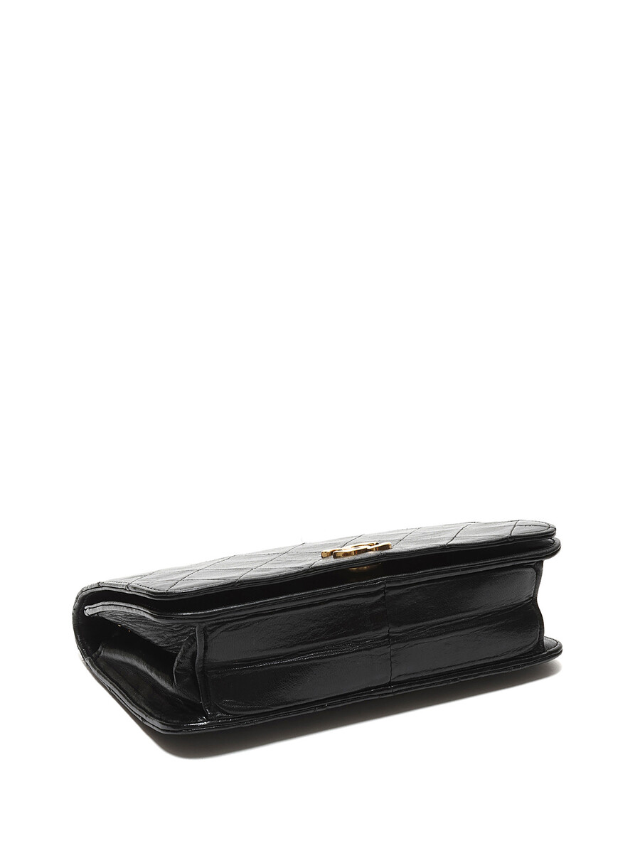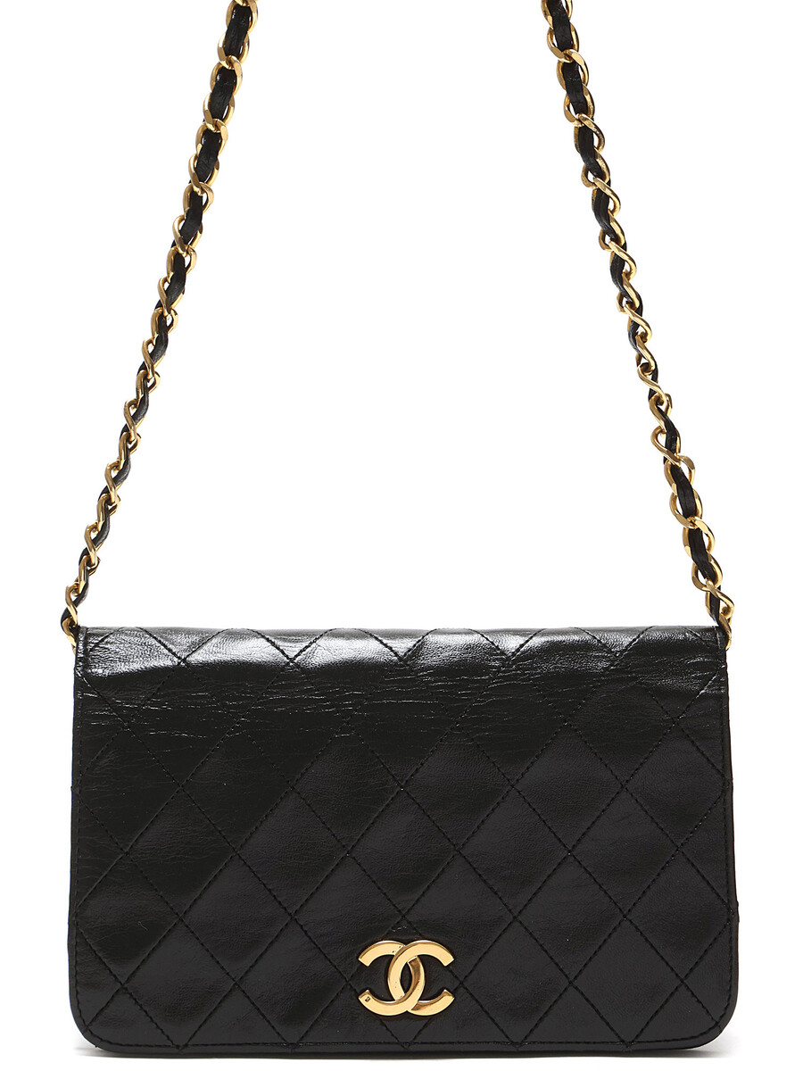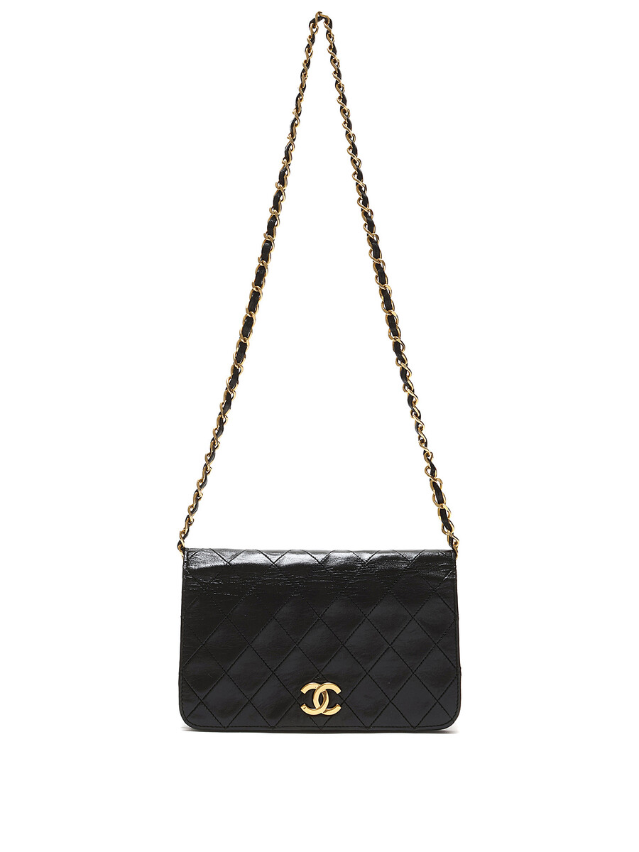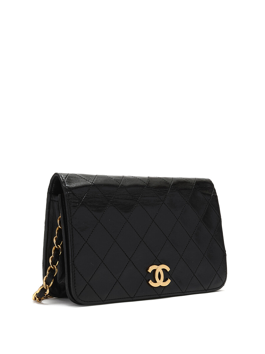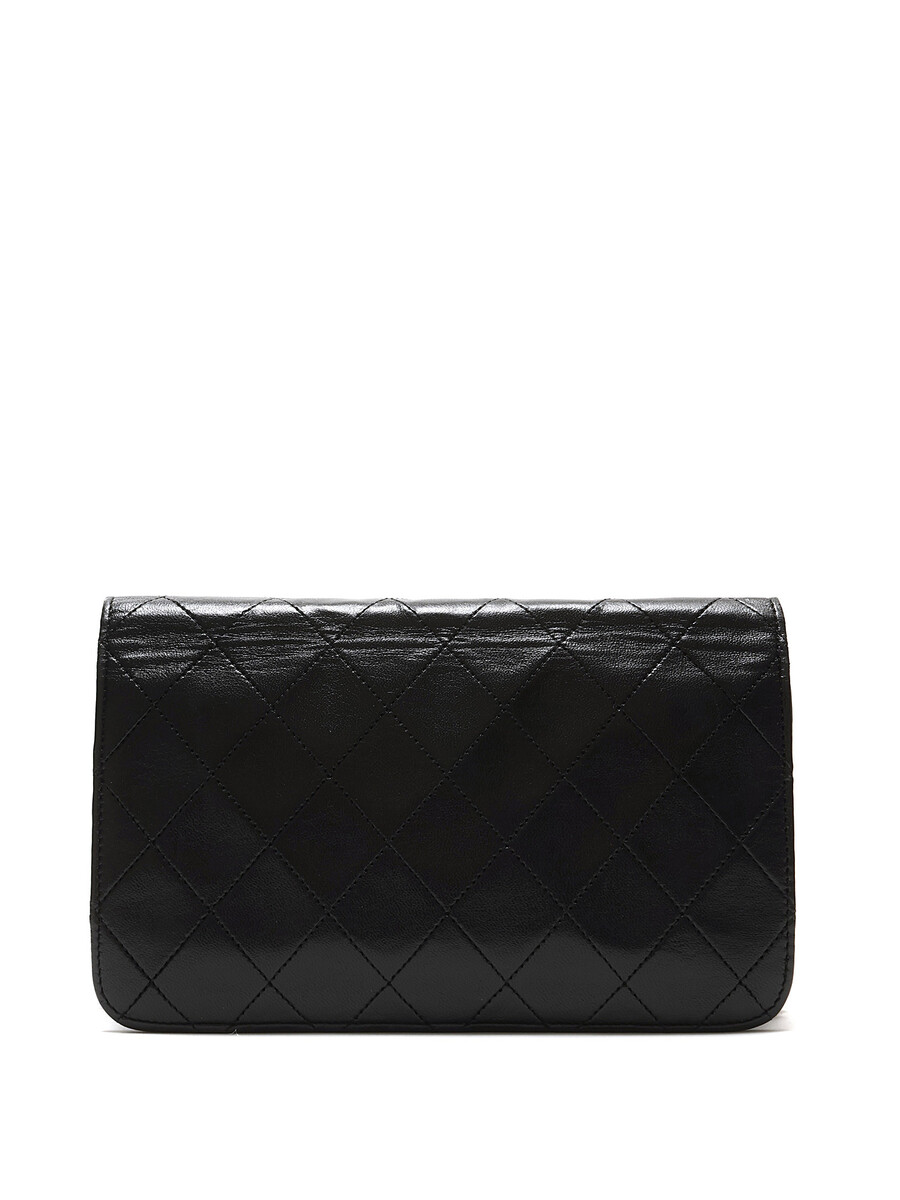 Quilted lambskin wallet on chain in black. Gold-tone hardware featuring a leather intertwined chain strap.