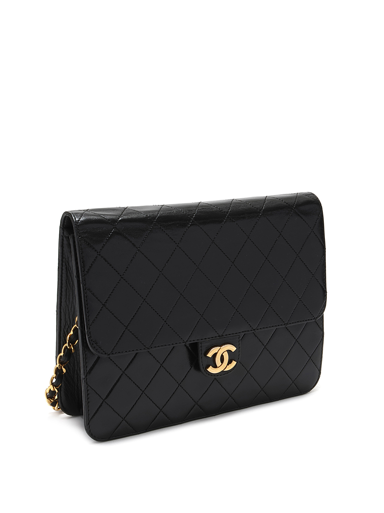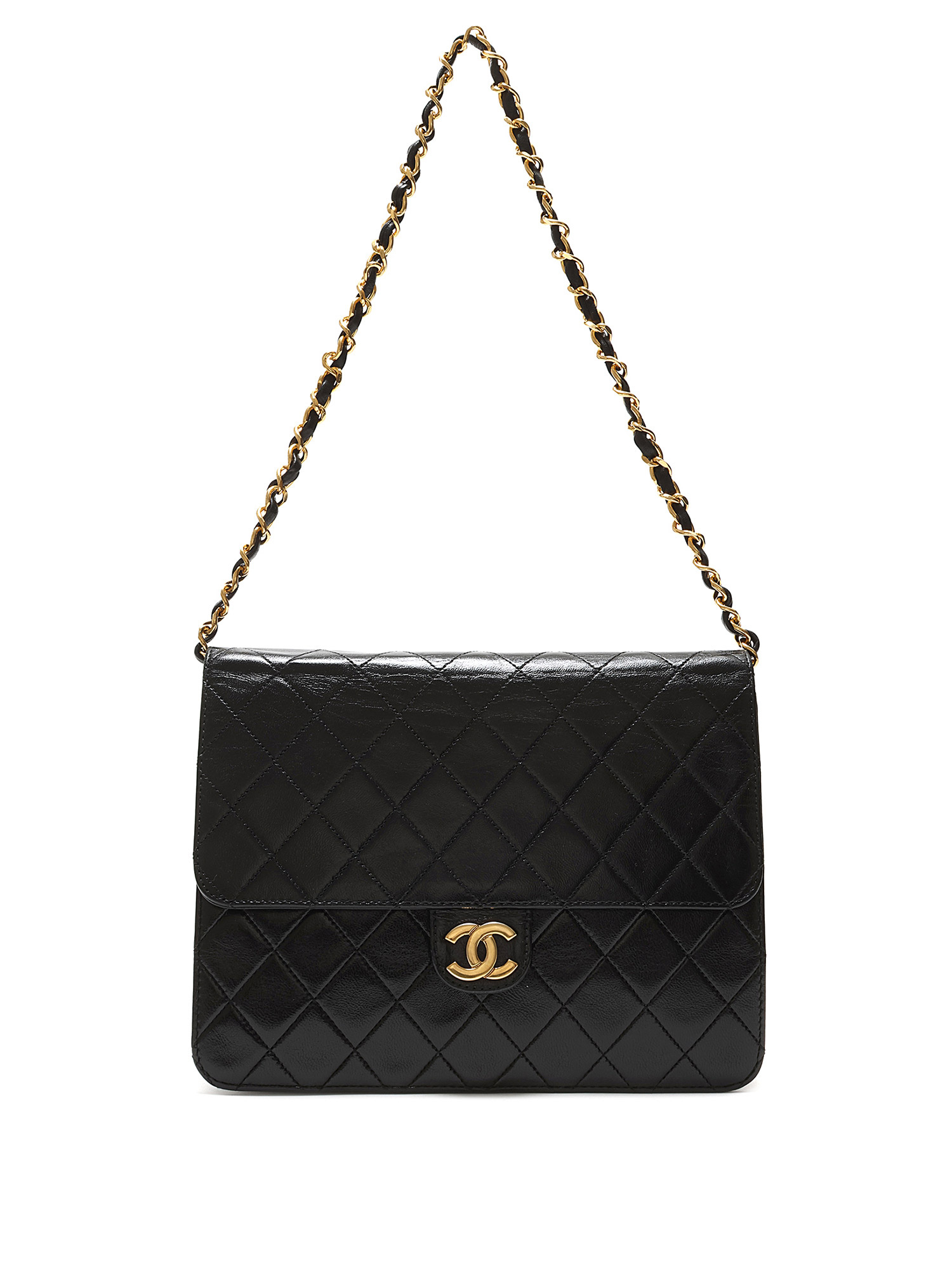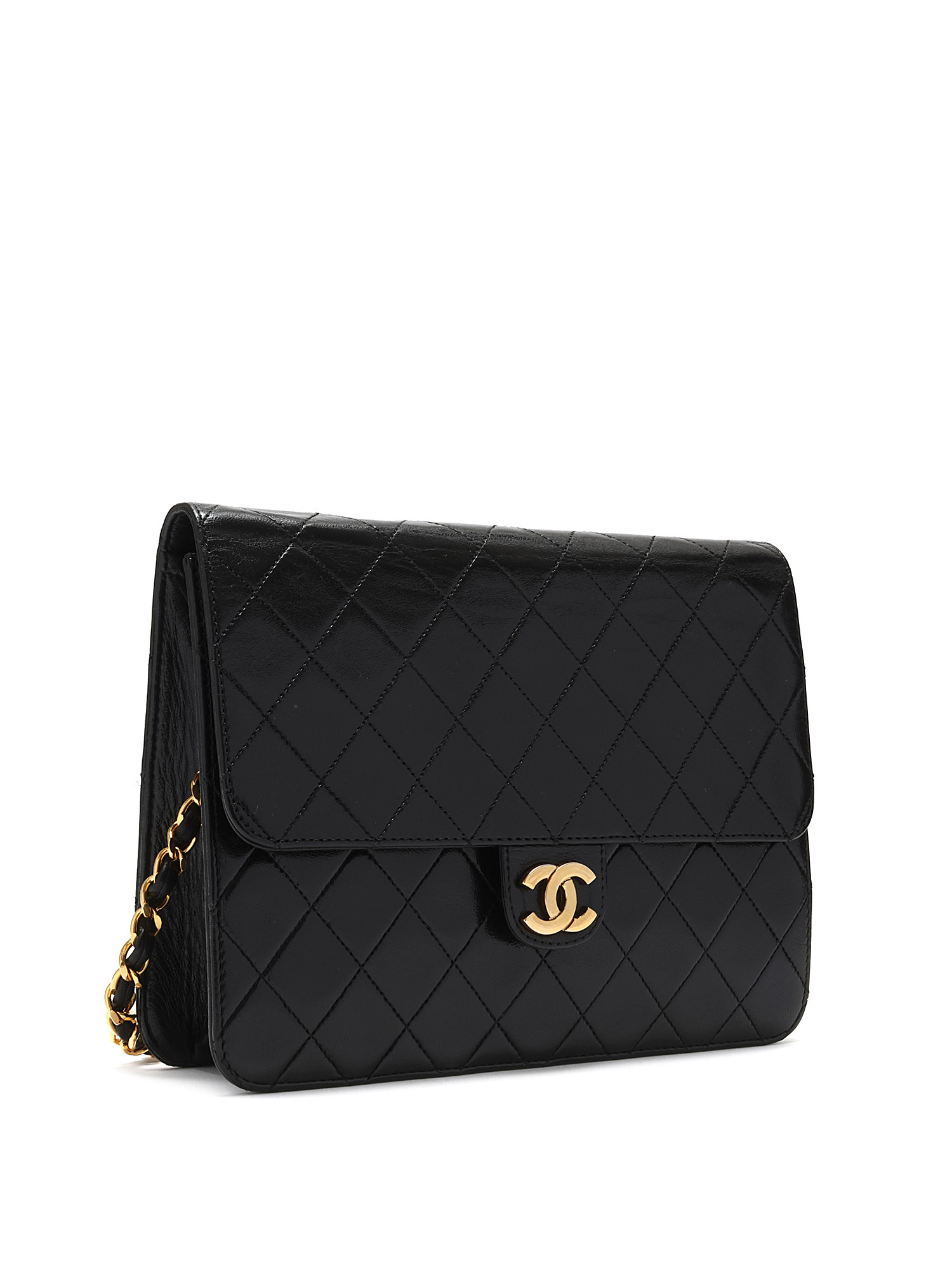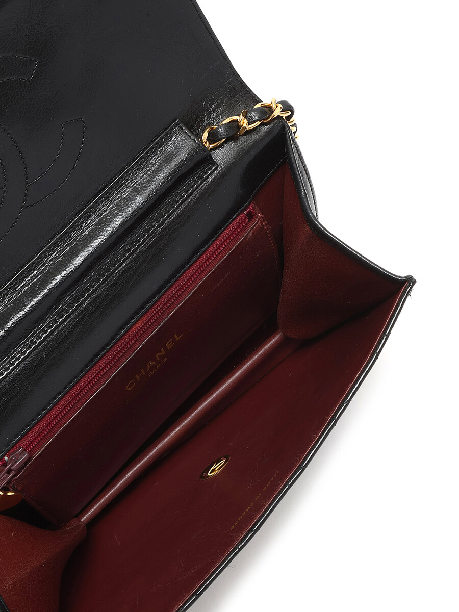 Quilted leather flap bag in black with diamond pattern. CC turn-lock closure. Chain and leather shoulder strap. Gold-tone hardware.