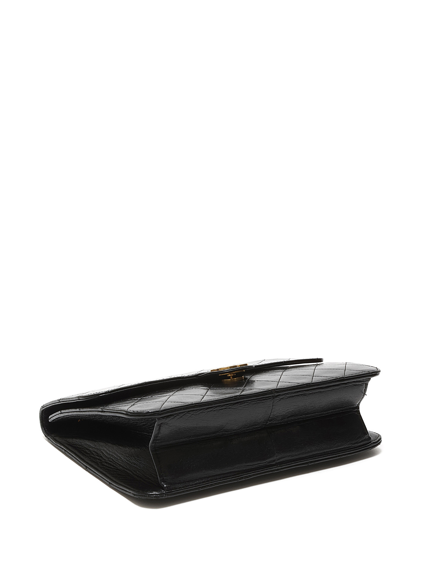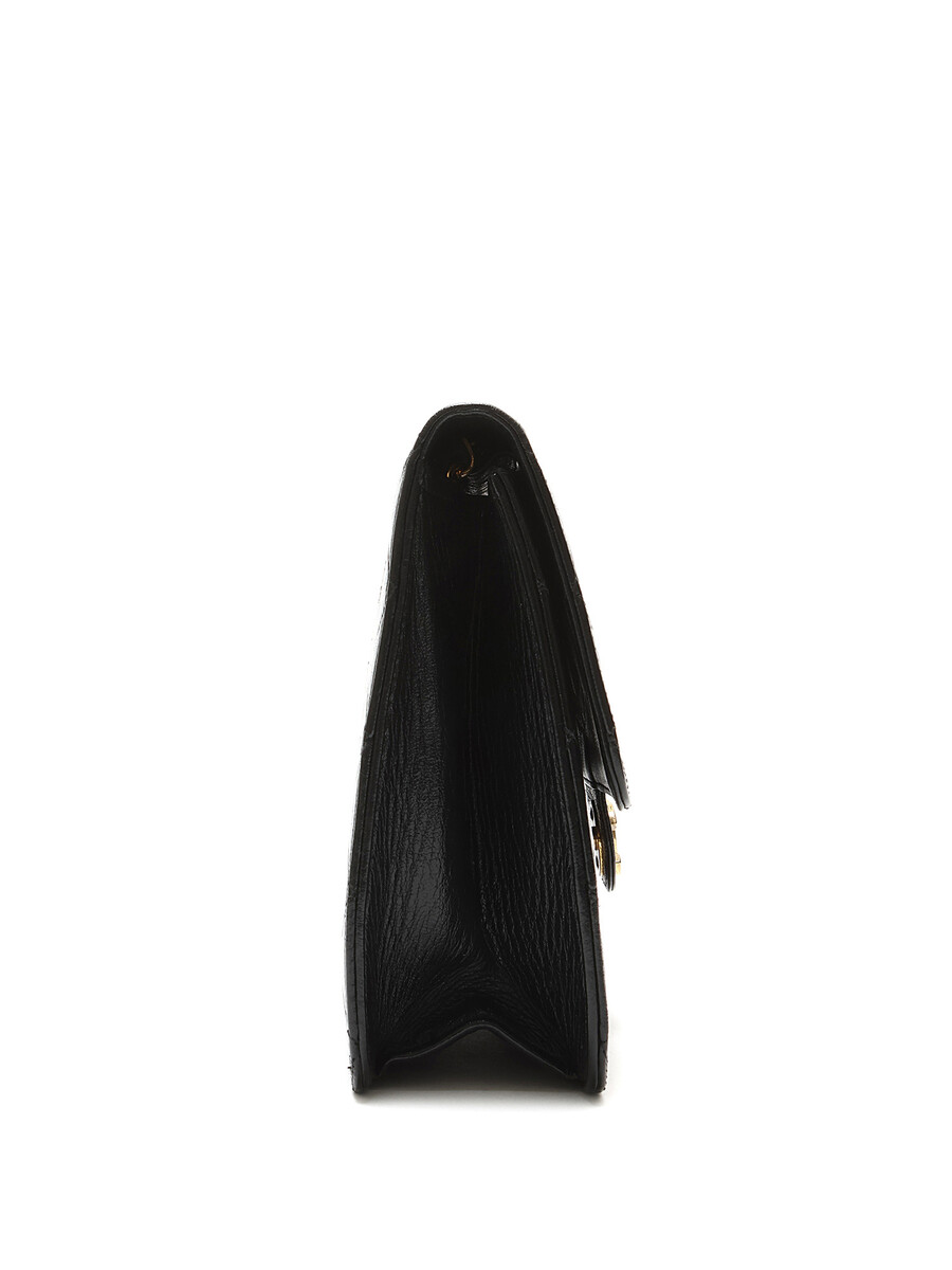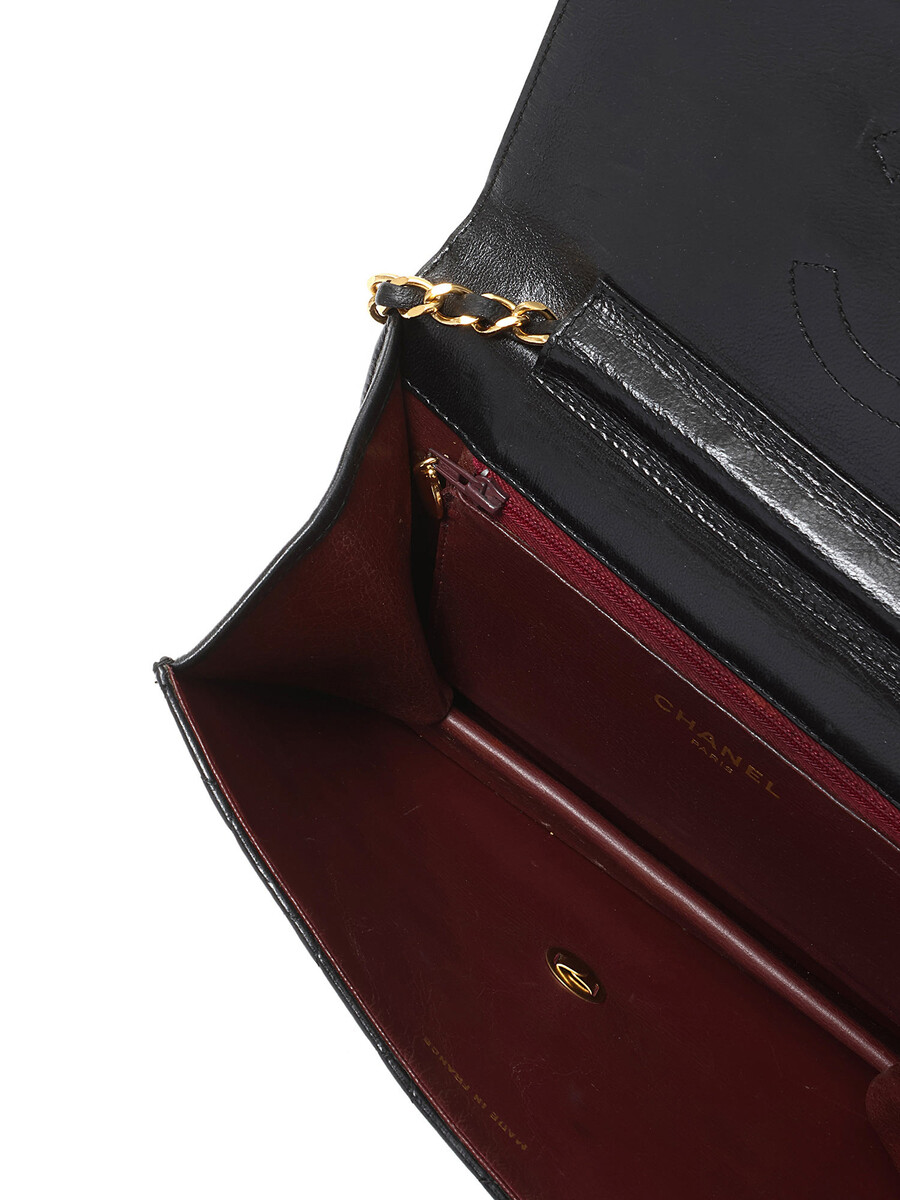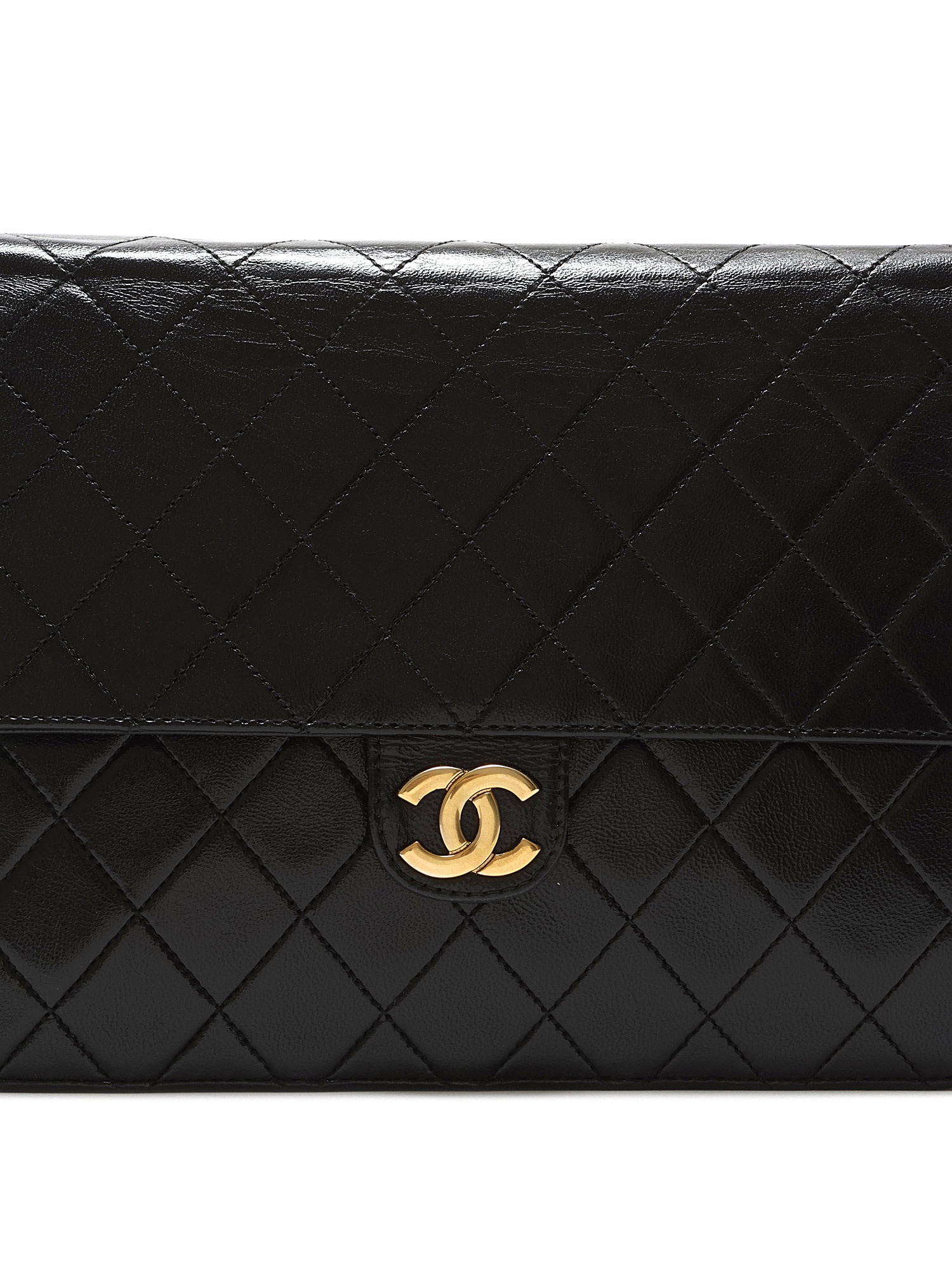 Quilted leather flap bag in black with diamond pattern. CC turn-lock closure. Chain and leather shoulder strap. Gold-tone hardware.