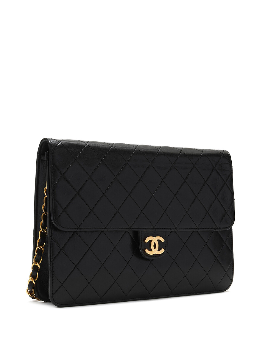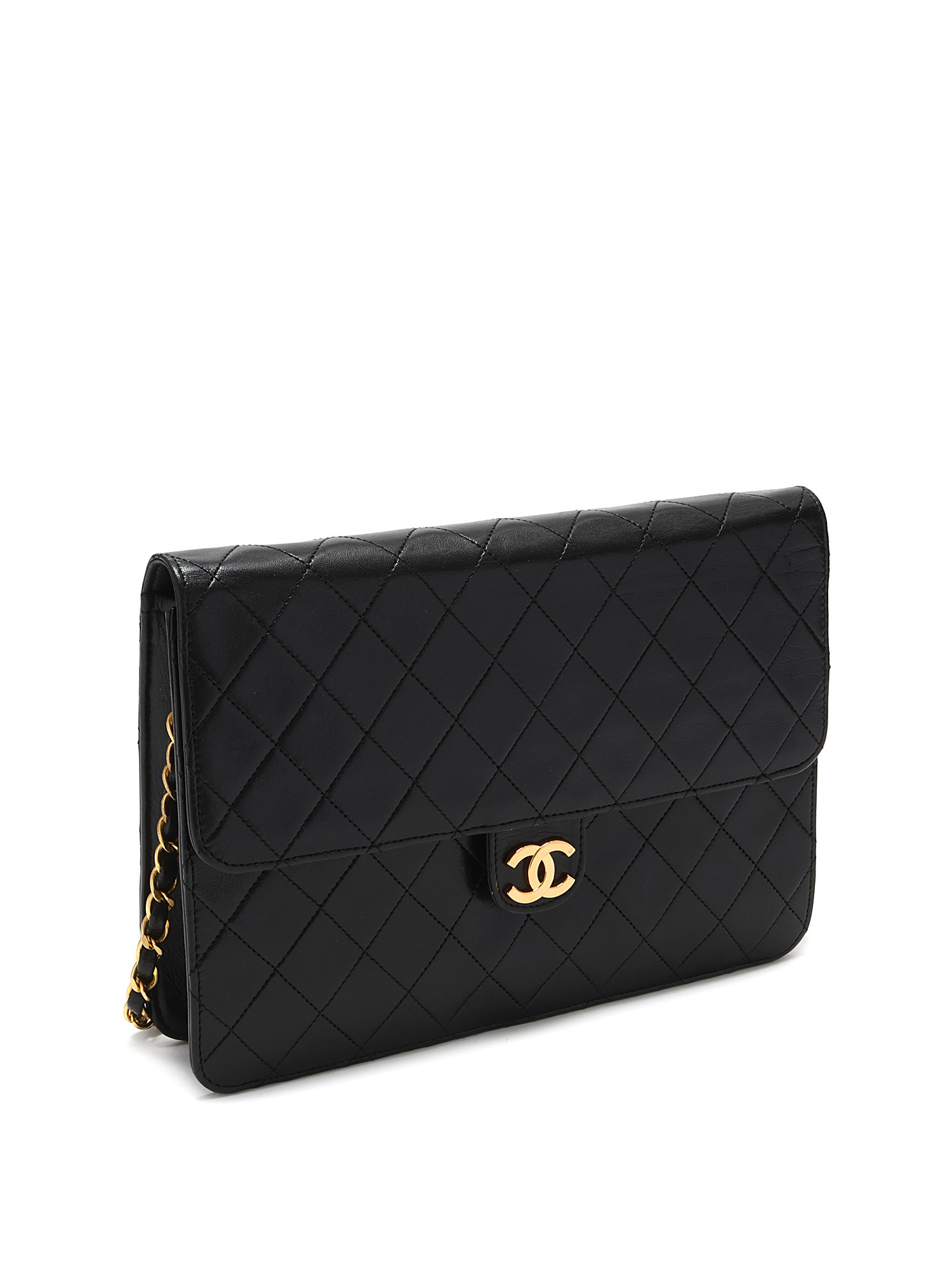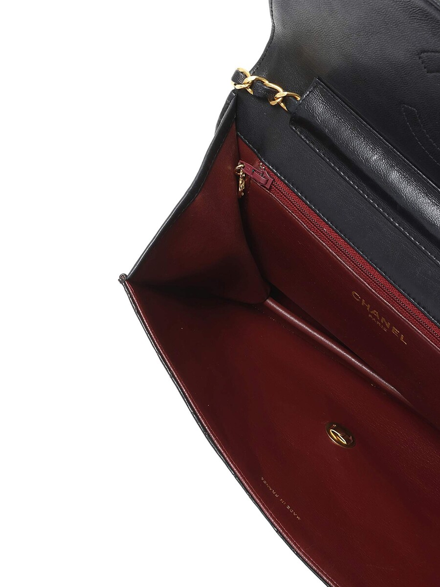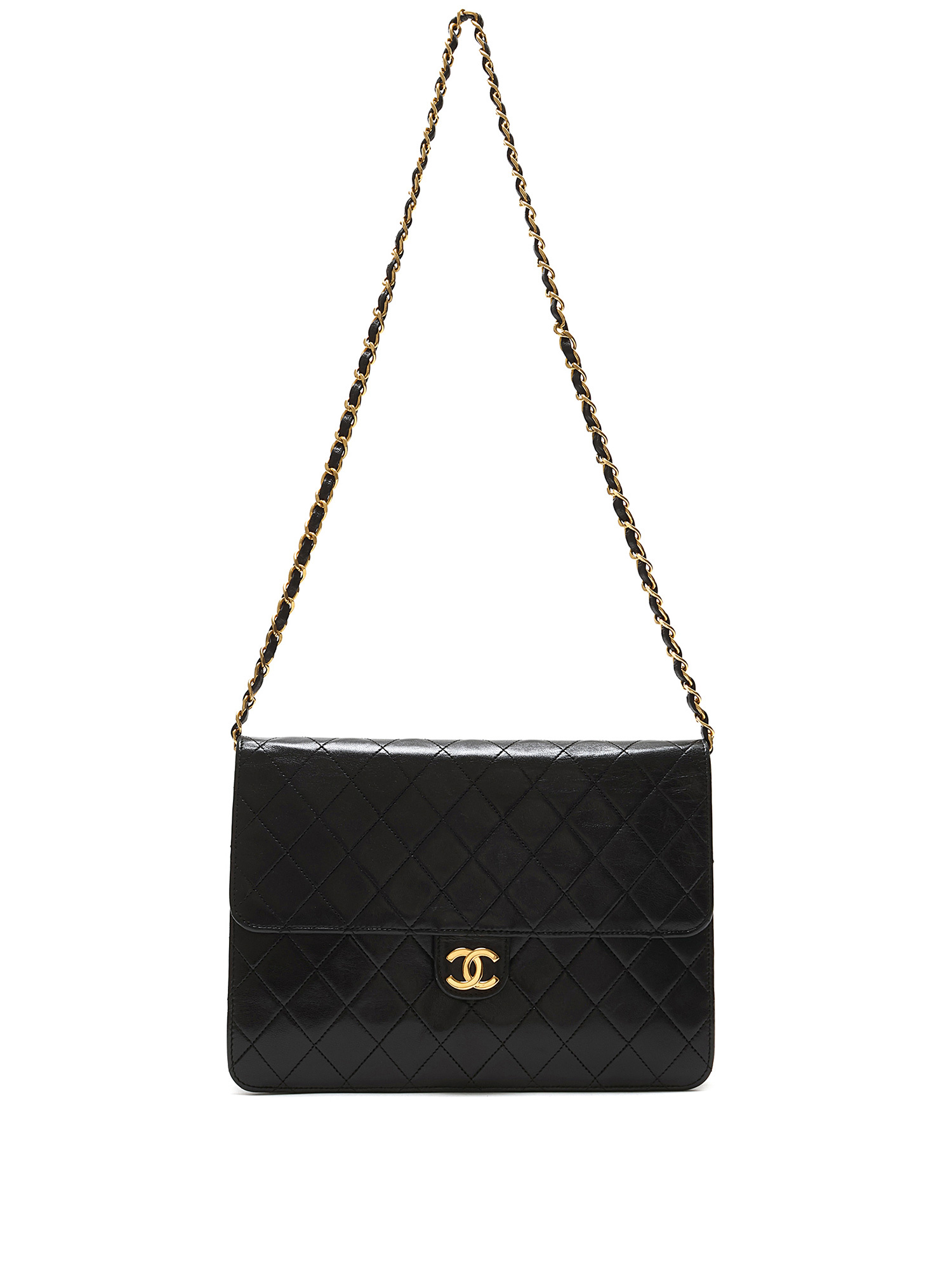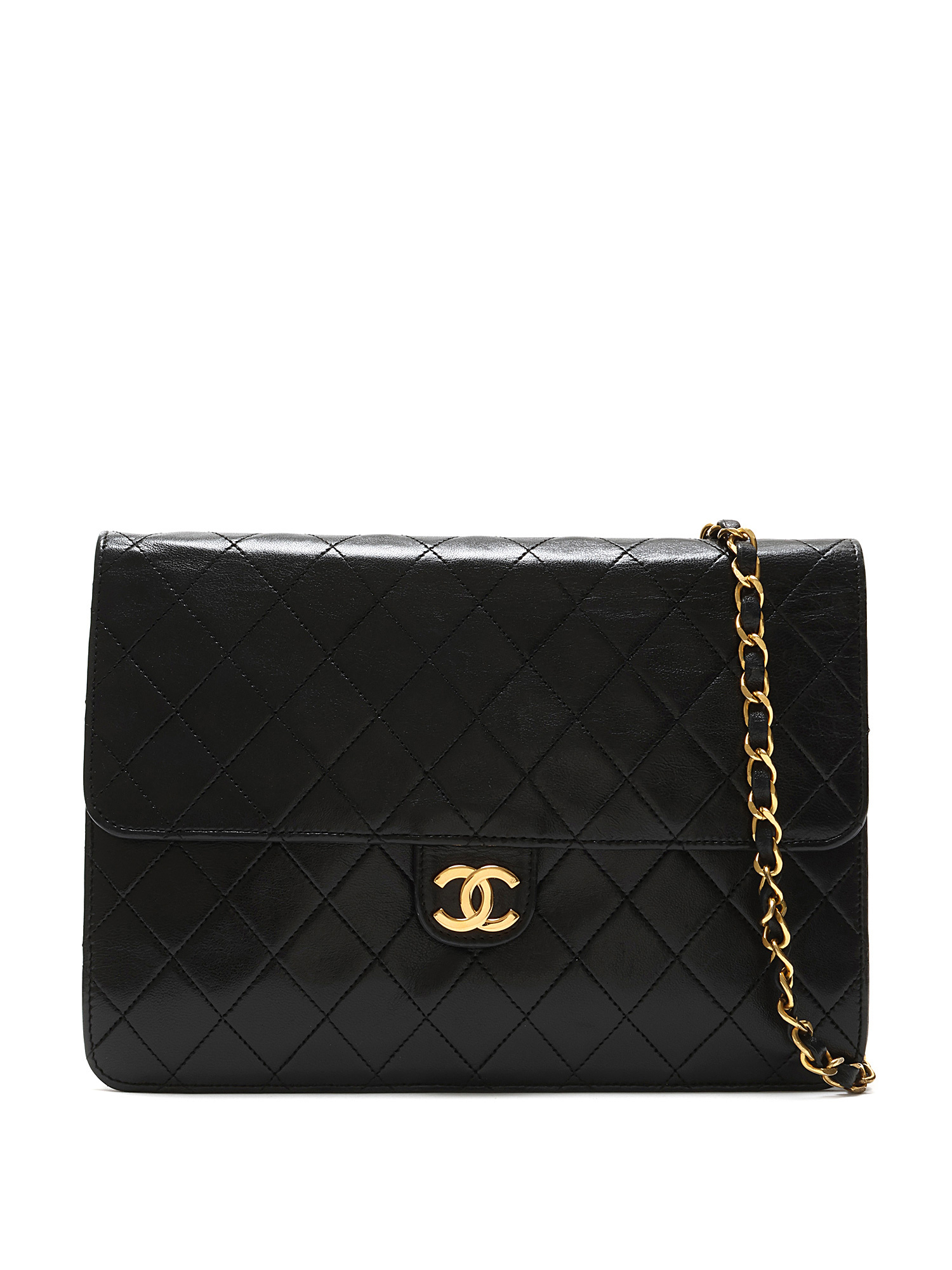 Classic quilted flap bag in black. CC turn-lock closure. Interwoven leather chain shoulder strap. Gold-tone hardware. Interior burgundy compartment.