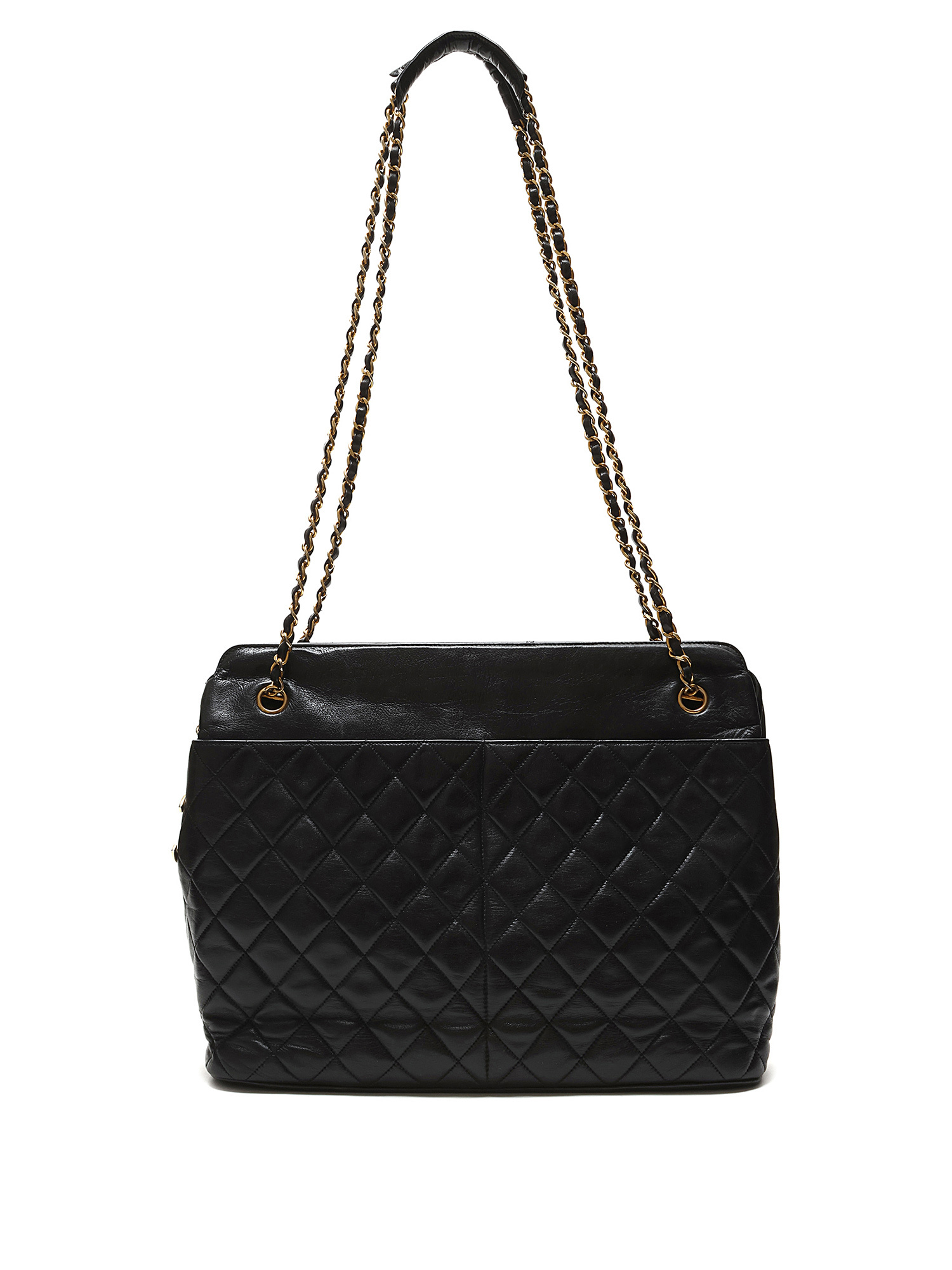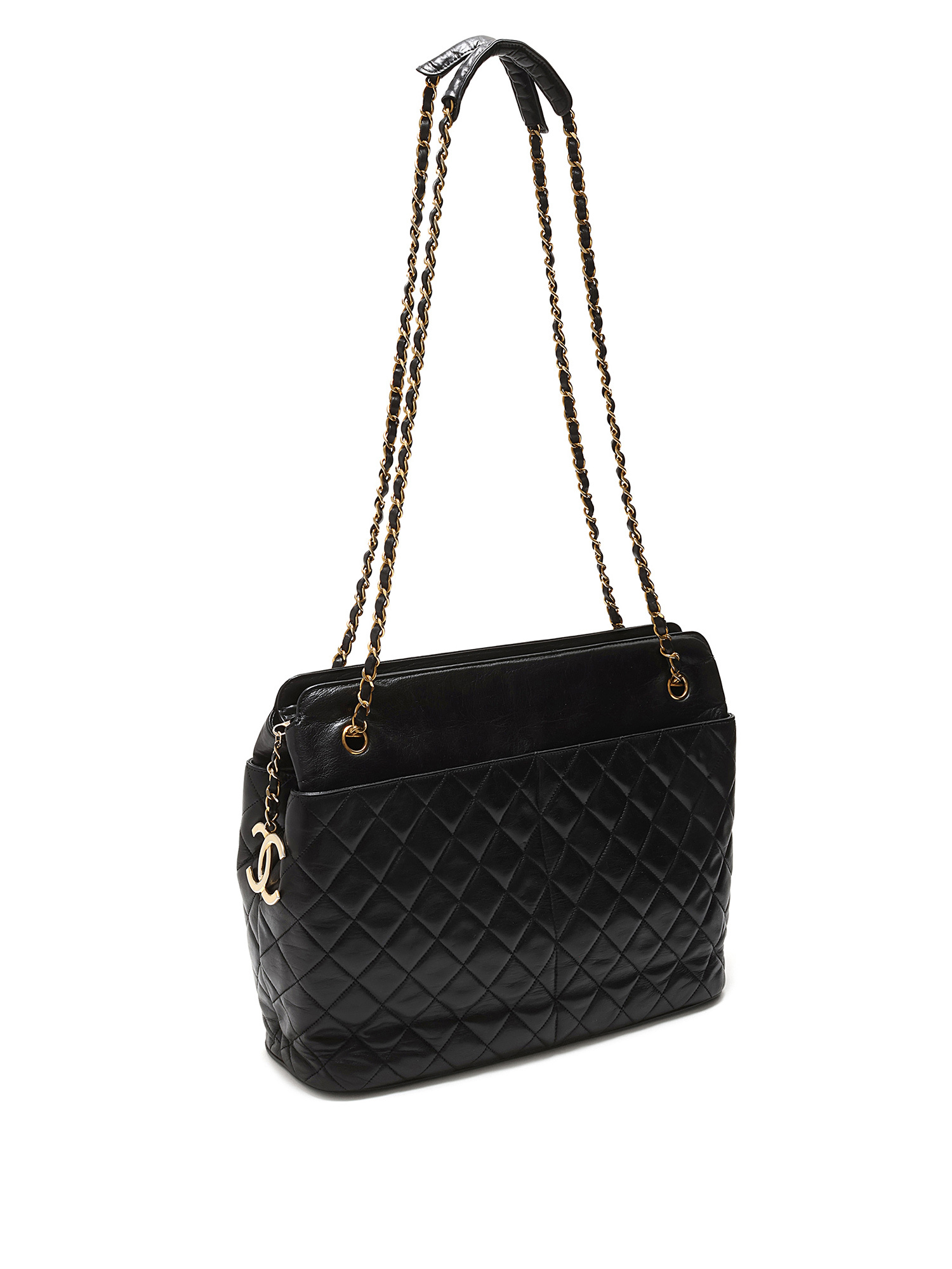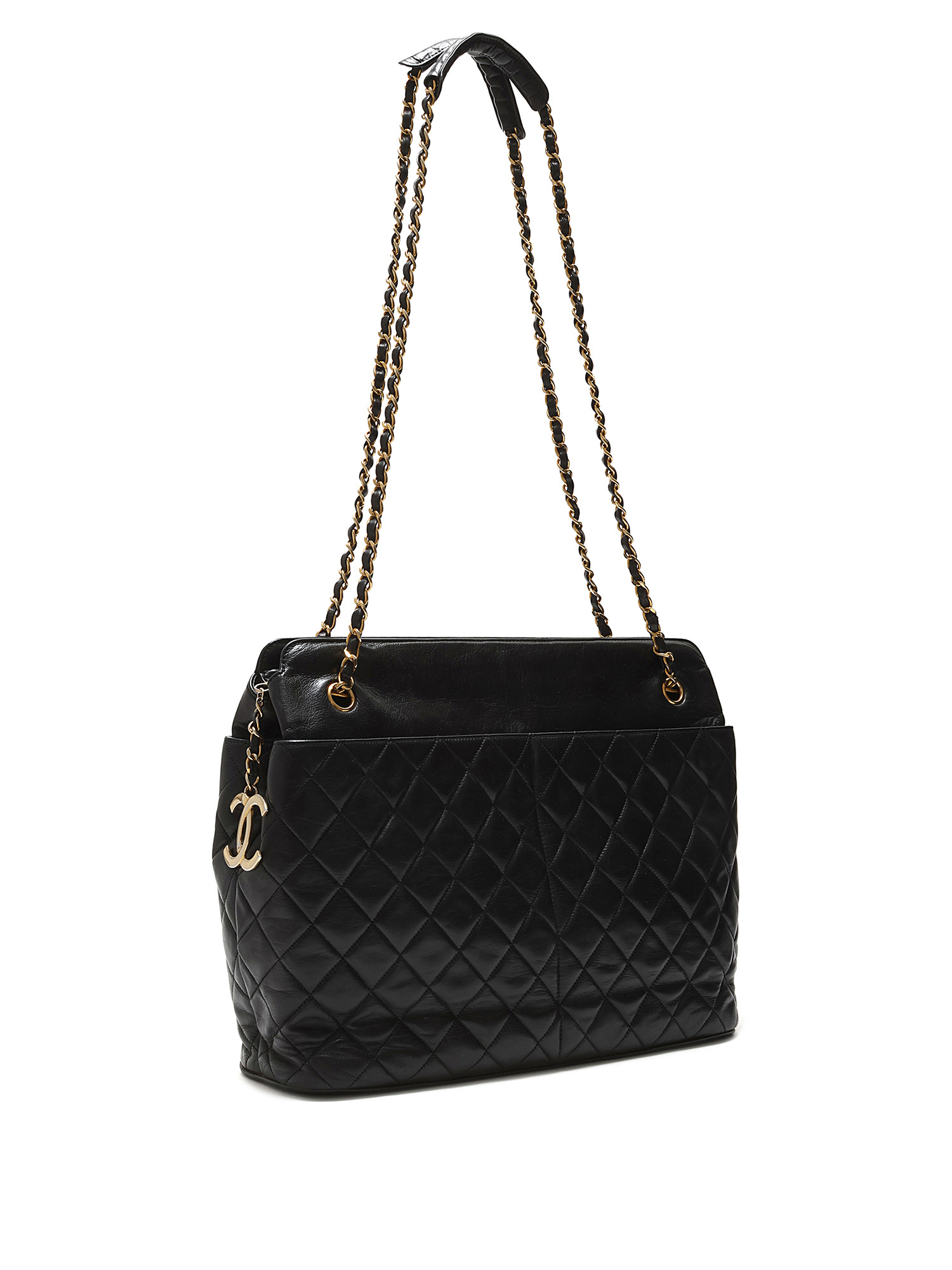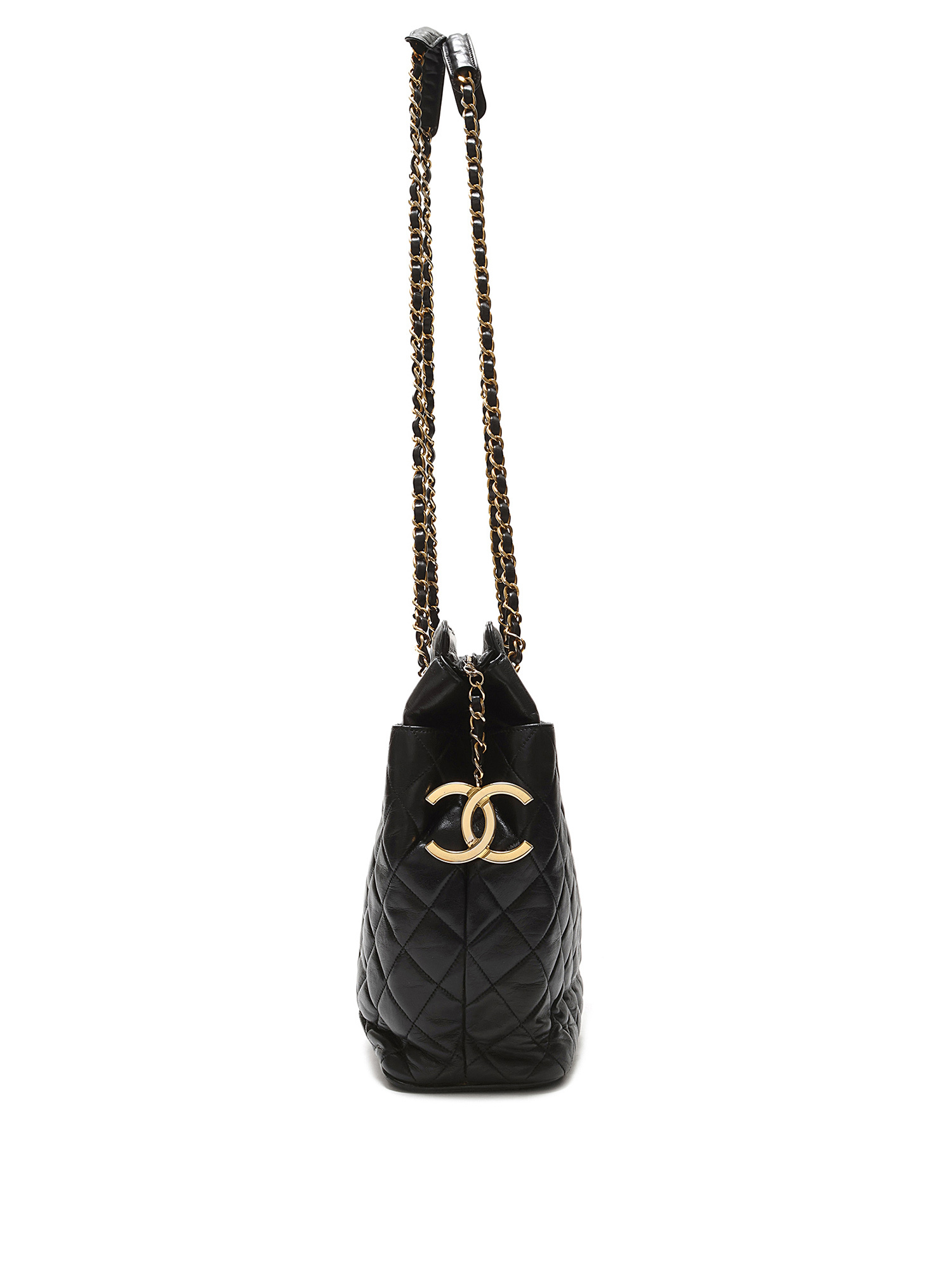 Quilted leather shoulder bag in black. Interlaced leather chain shoulder strap. Gold-tone CC charm and hardware.