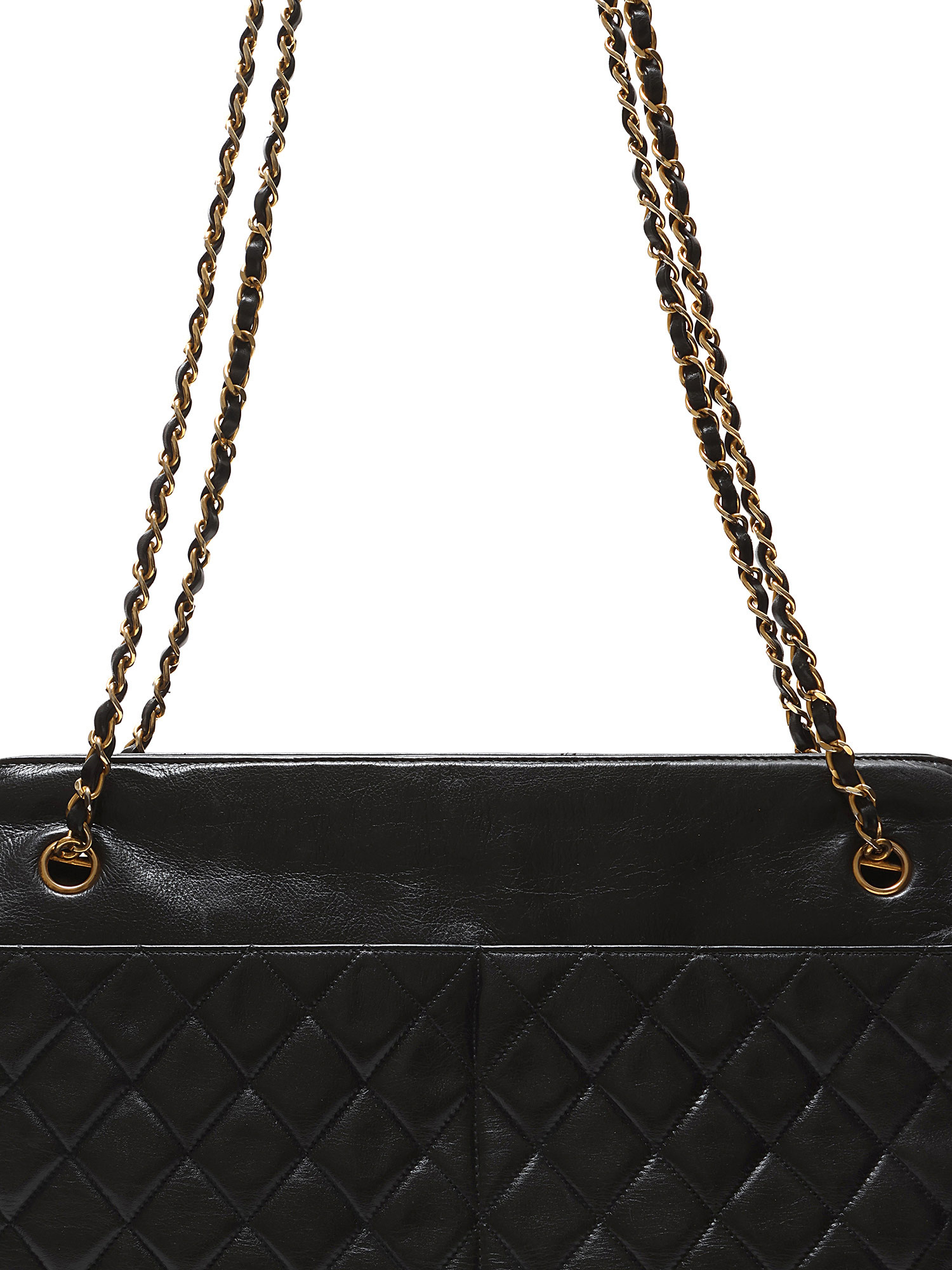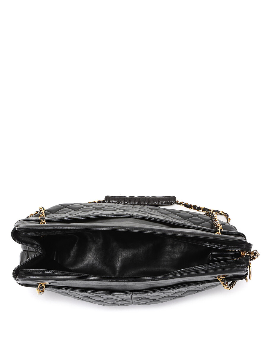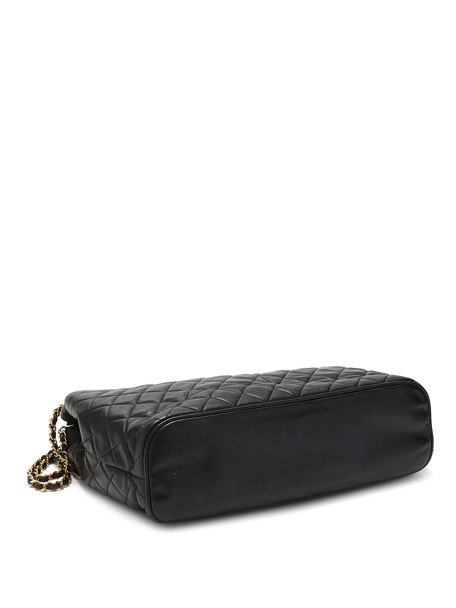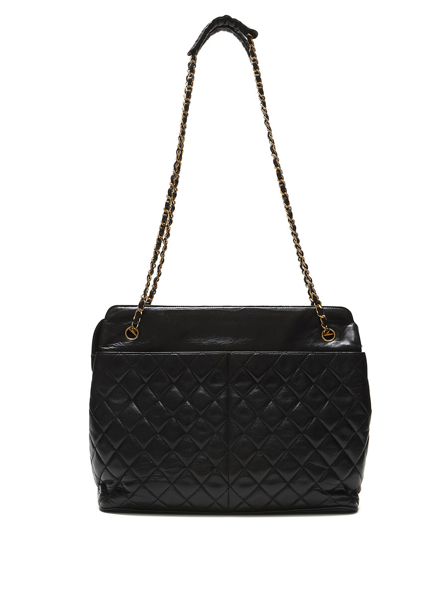 Quilted leather shoulder bag in black. Interlaced leather chain shoulder strap. Gold-tone CC charm and hardware.