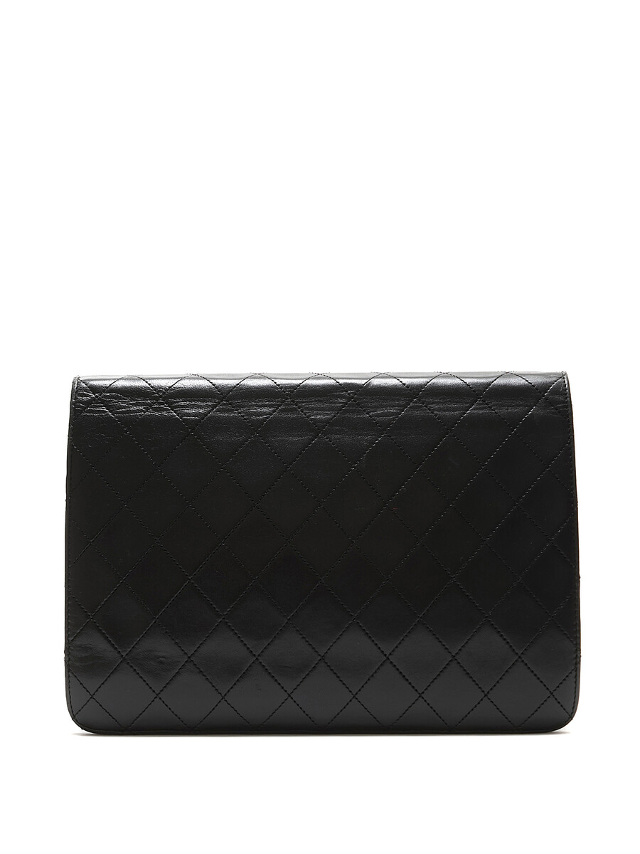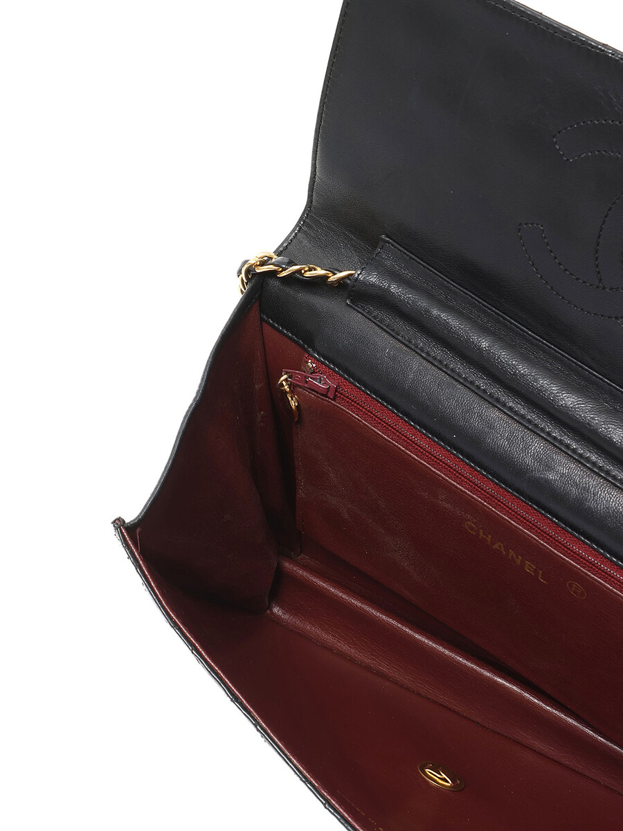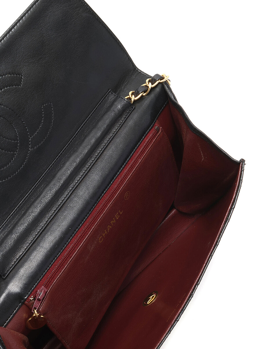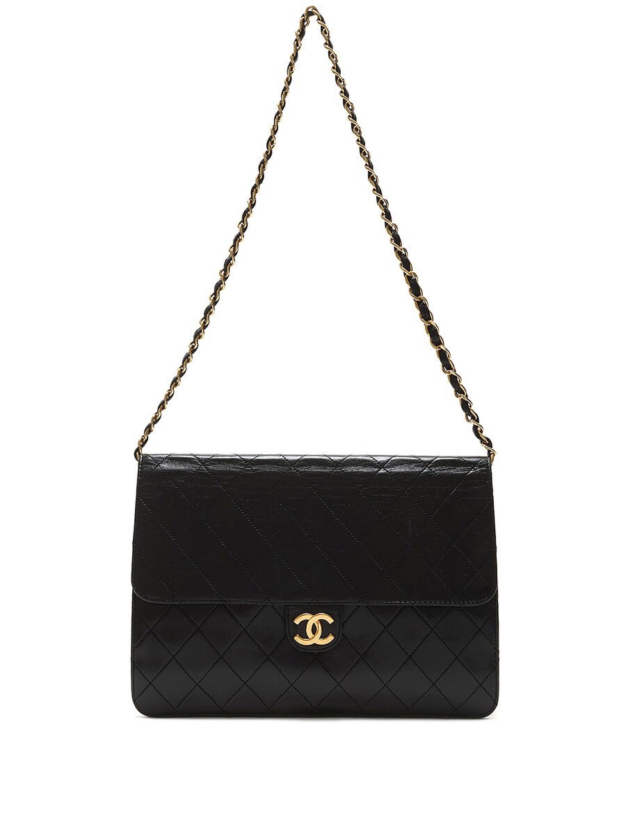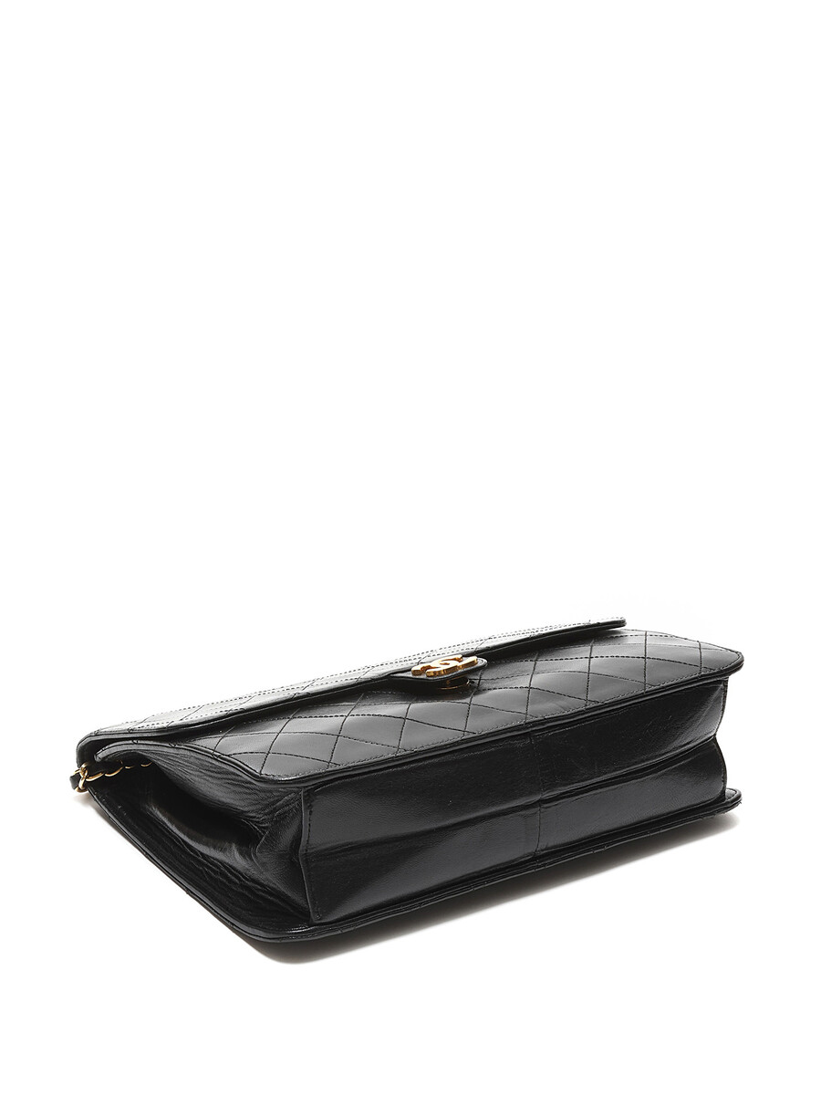 Quilted diamond-pattern black leather shoulder bag. Featuring a flap closure with iconic CC turn-lock and a chain and leather shoulder strap. Gold tone hardware.