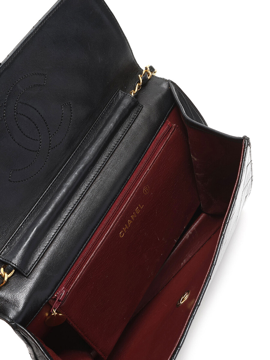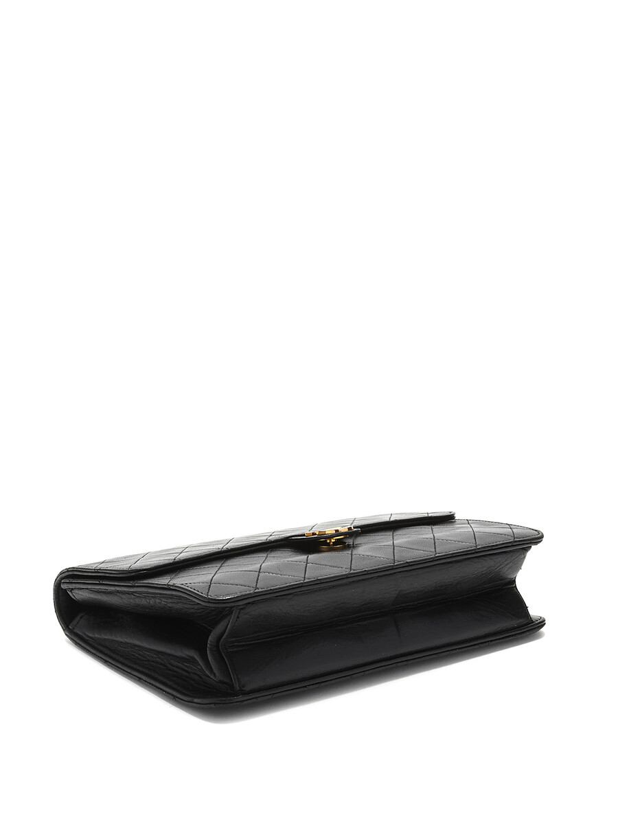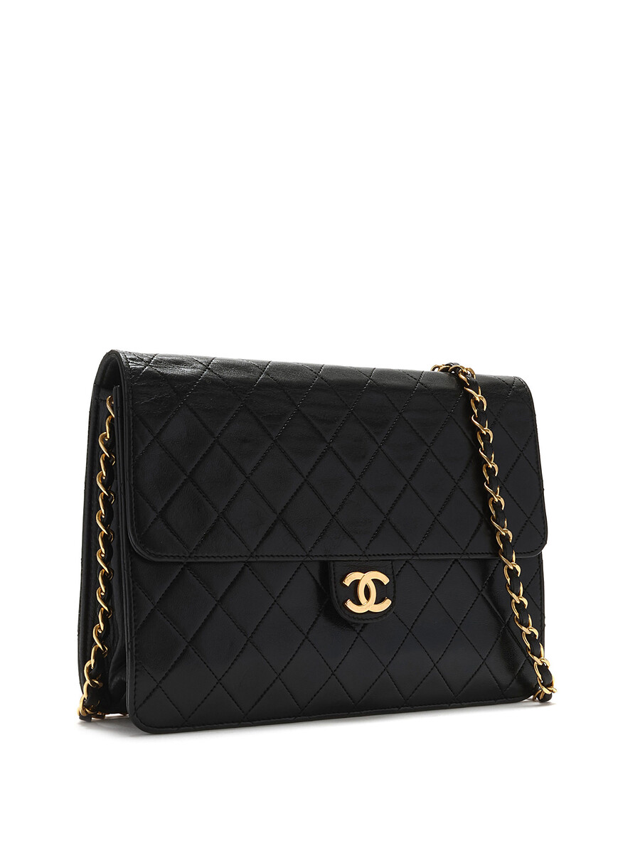 Quilted lambskin leather shoulder bag in black. Interlaced leather and chain strap. CC logo plaque at flap. Push-lock closure underneath flap. Gold-tone hardware.