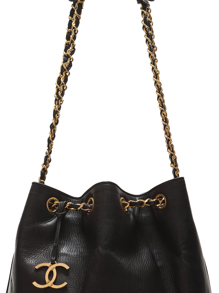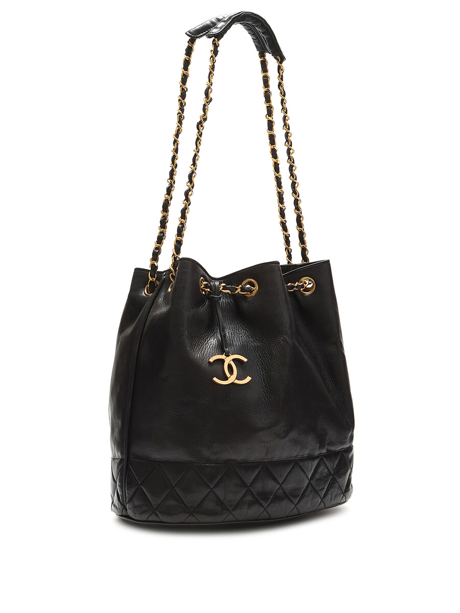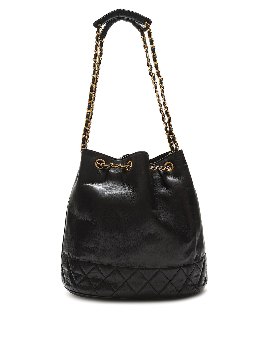 Lambskin bucket bag with quilted base in black. Drawstring closure with chain detailing. Interwoven leather and chain strap. Gold-tone hardware with inner pouch. Comes with authenticity card.