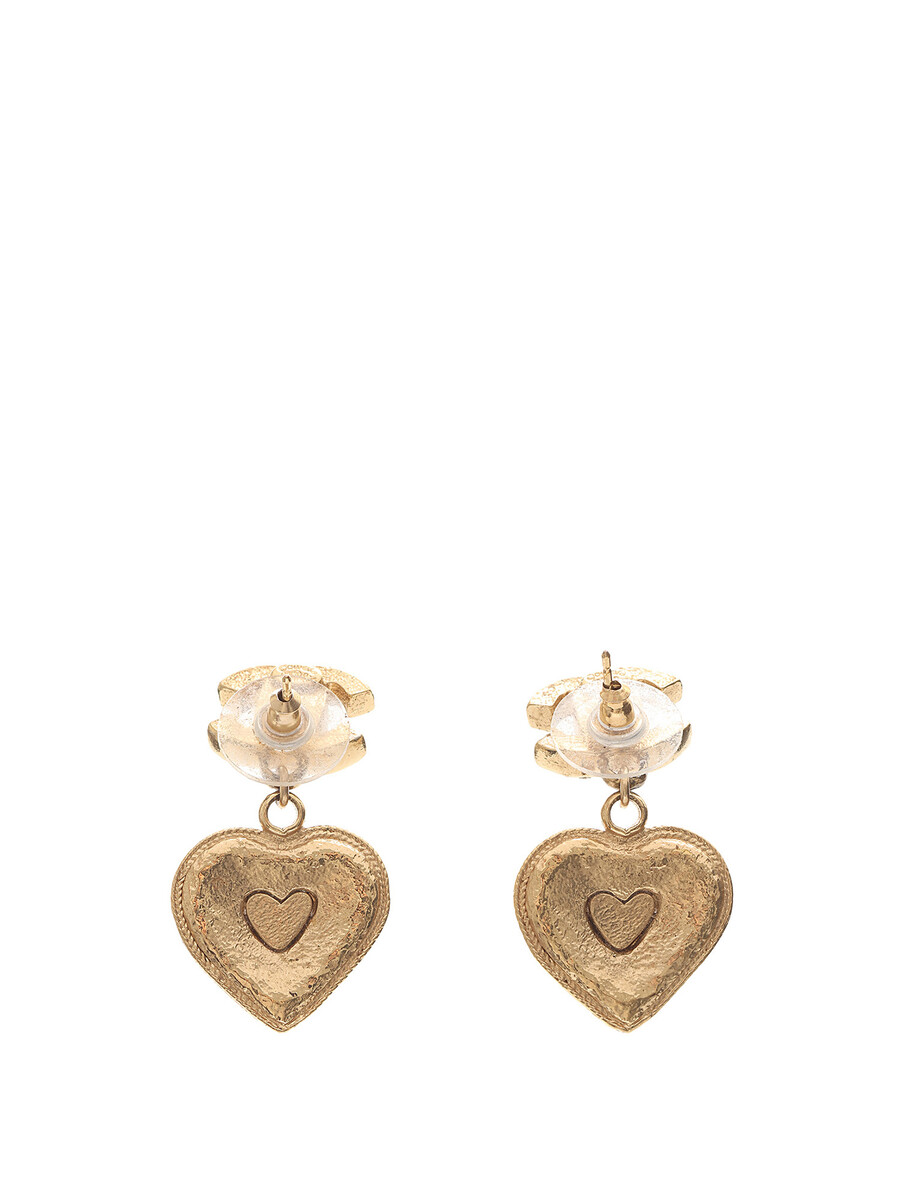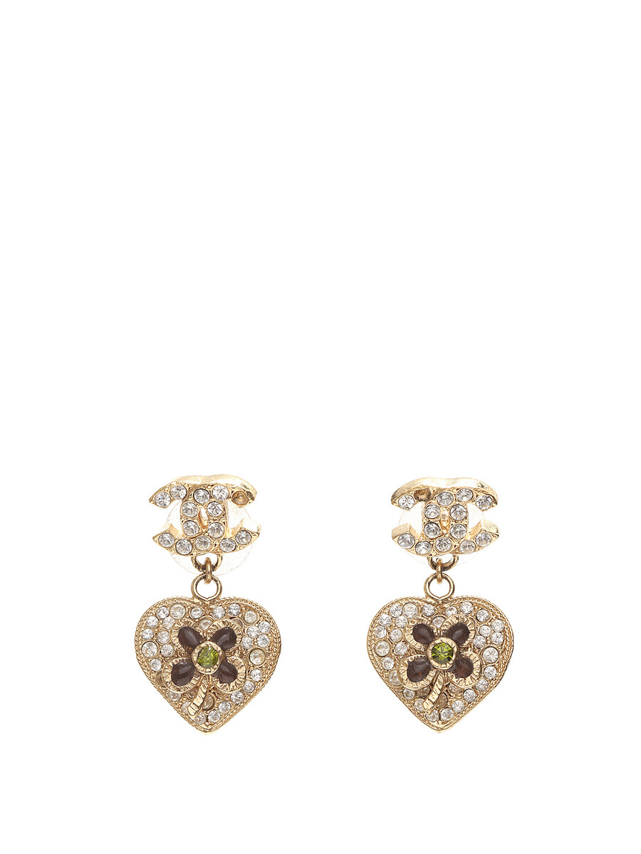 Gold-tone metal drop earrings featuring encrusted rhinestones, logo and floral motifs.