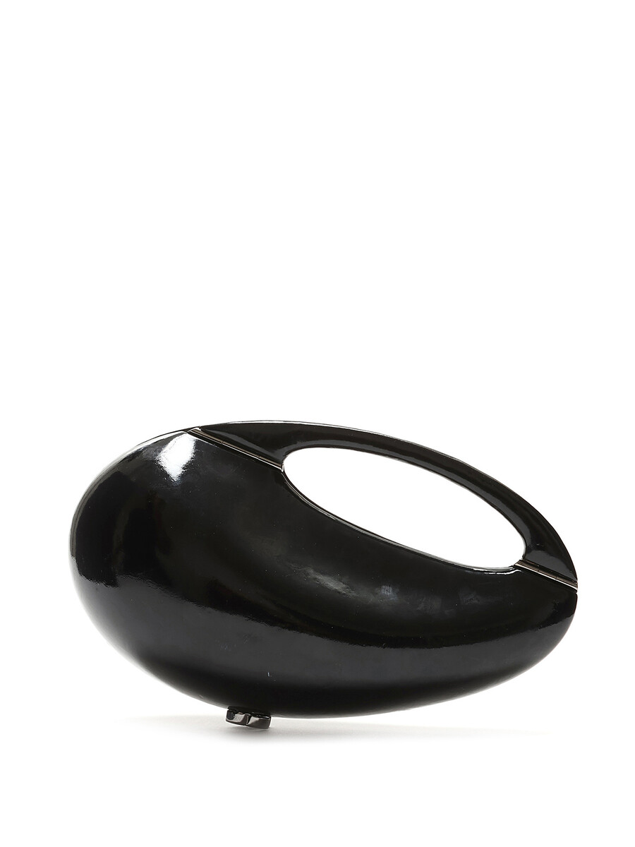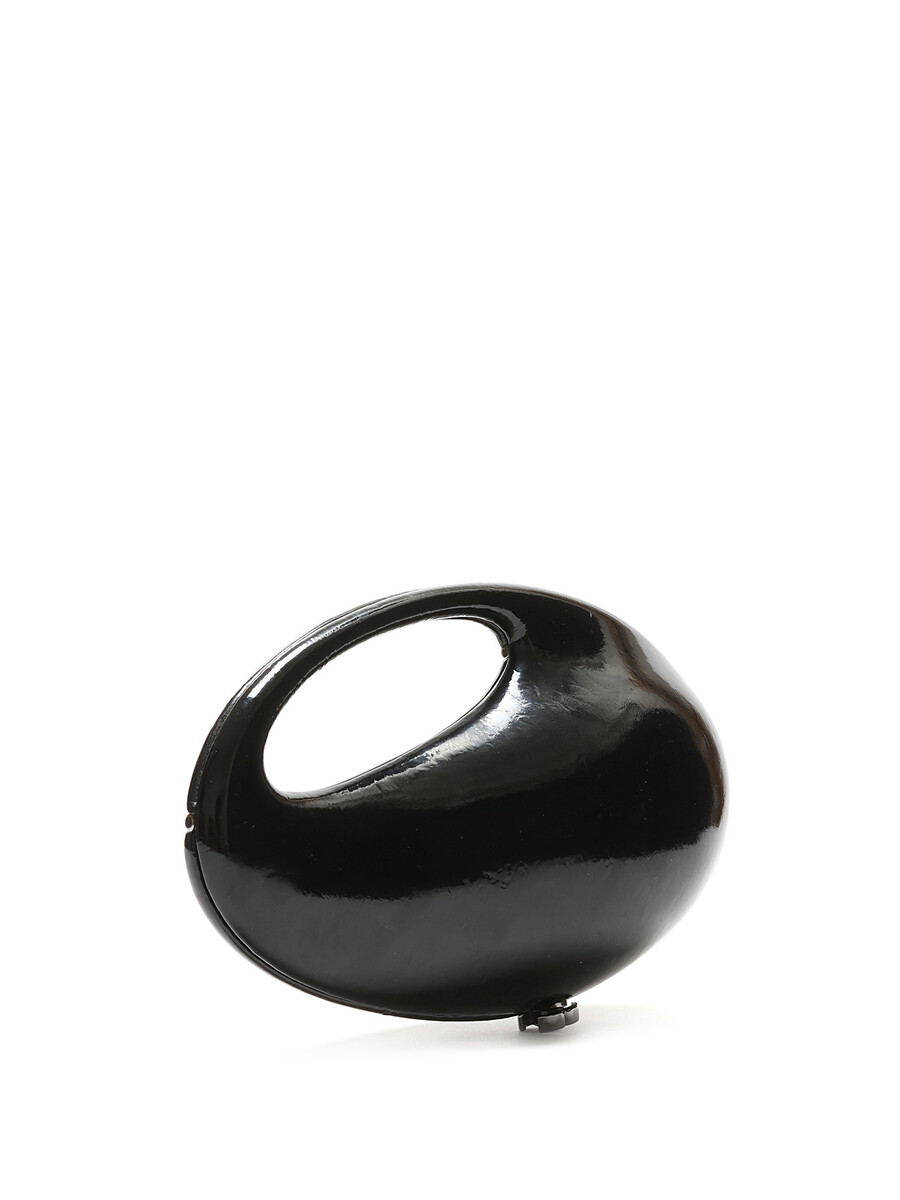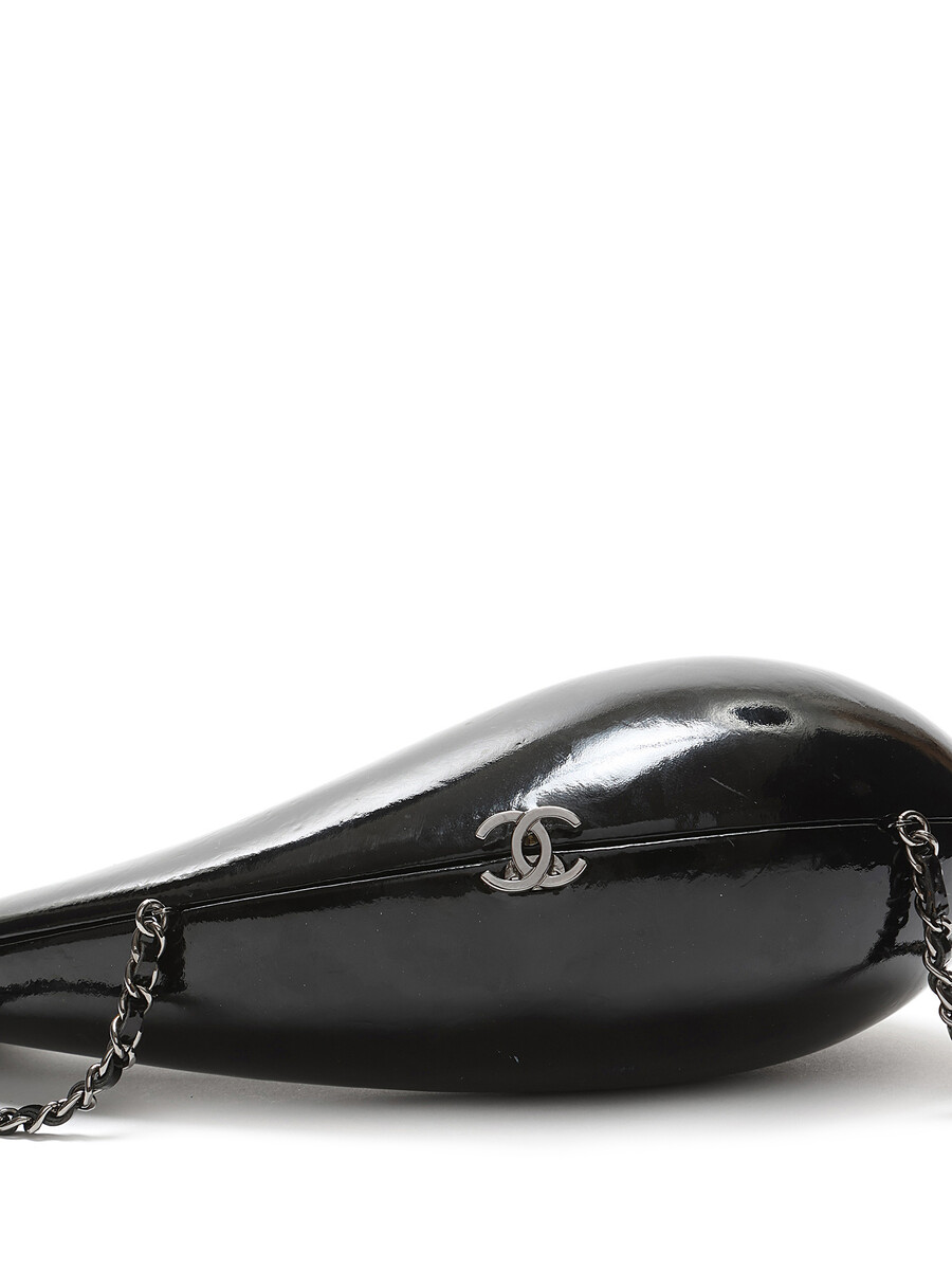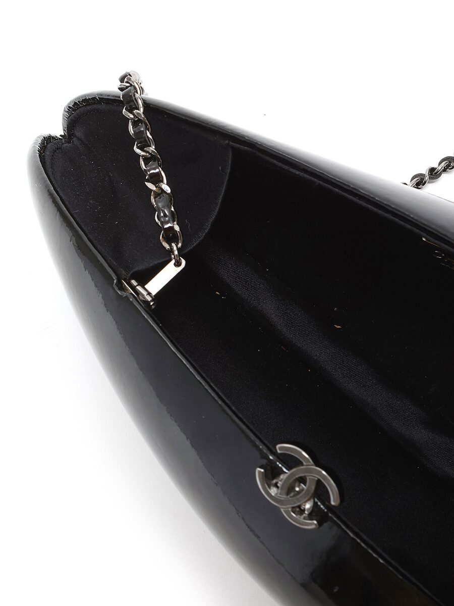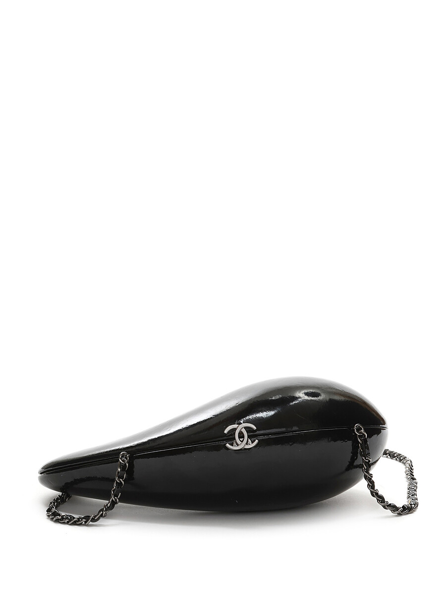 Sculptural black patent leather minaudière featuring the iconic 'CC' logo plaque on the flap. Silver-tone chain and leather strap.