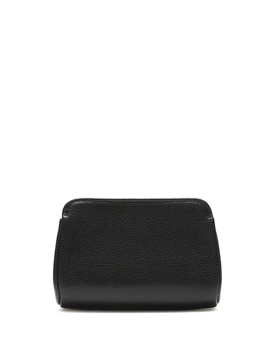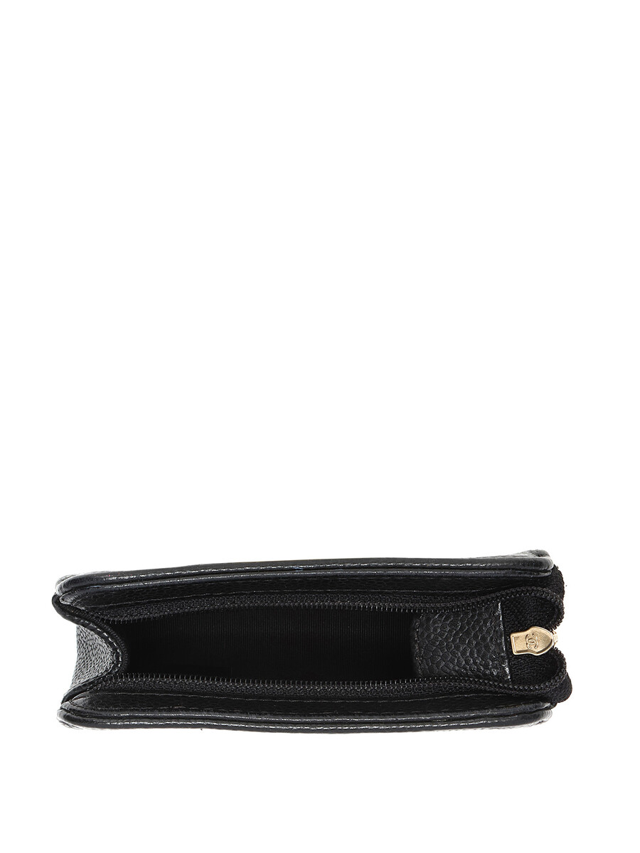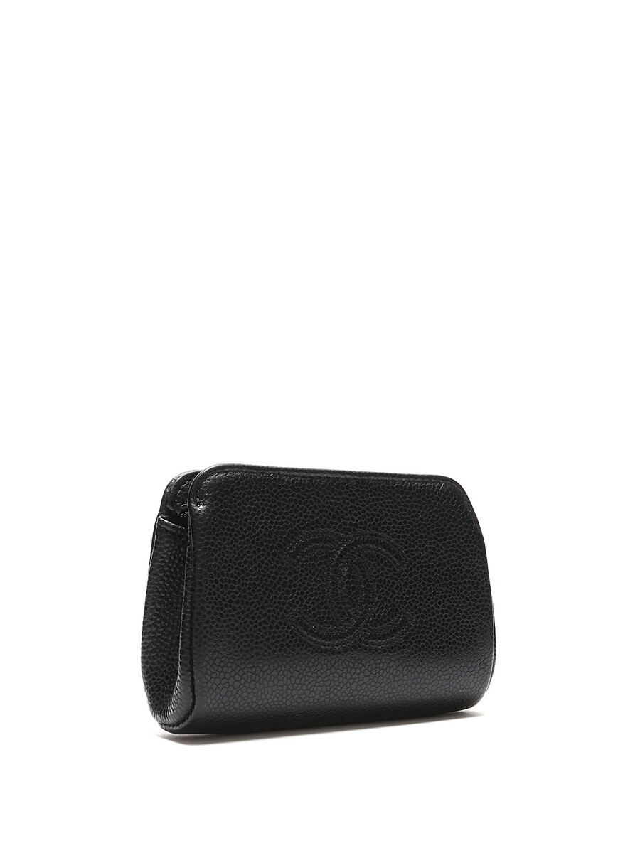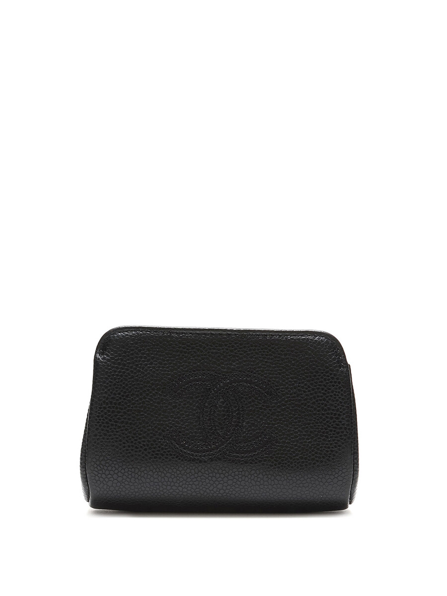 Black caviar leather coin purse by Chanel. Gold-tone metal hardware. Zipper closure. Comes with box.