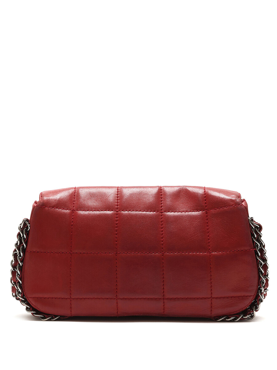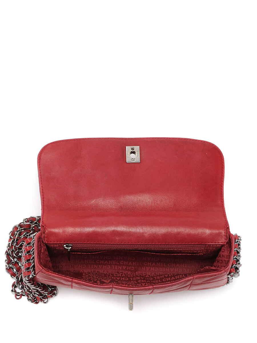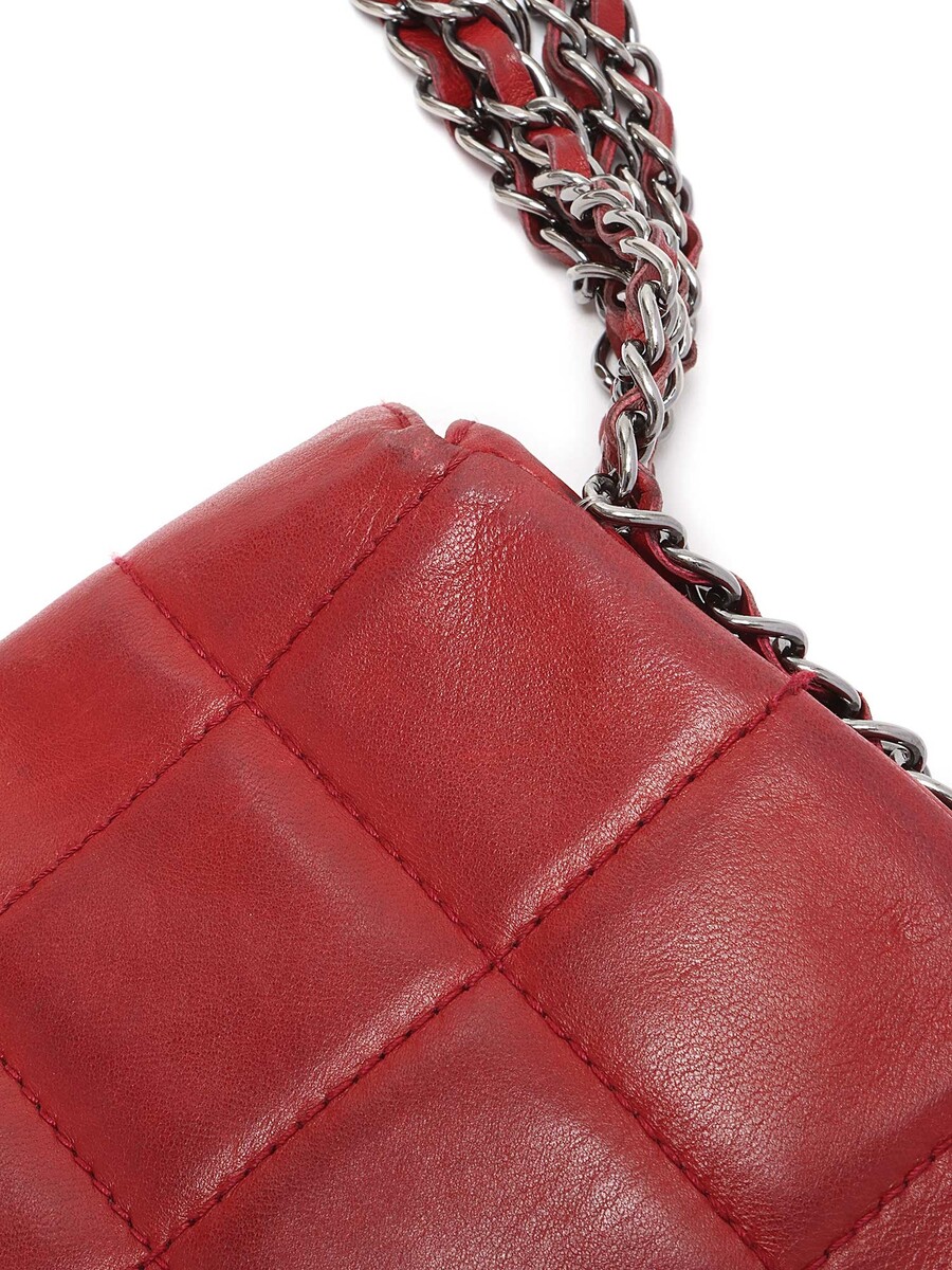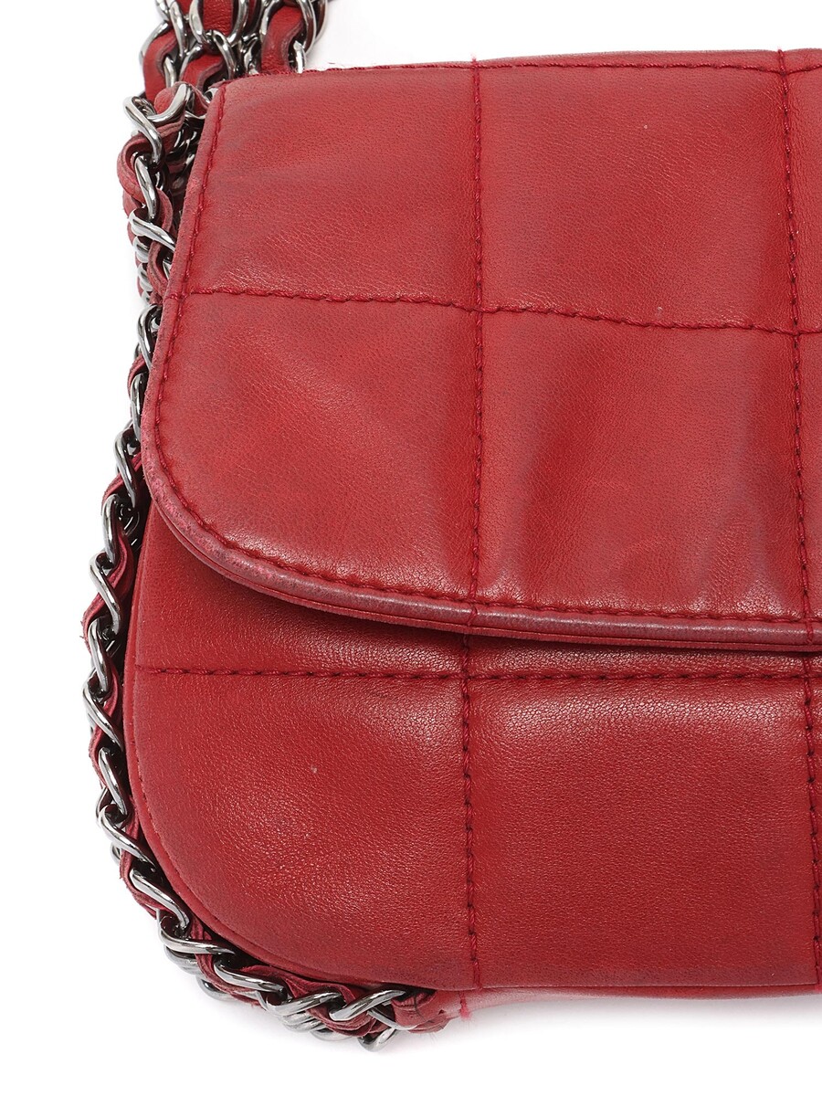 Quilted flap shoulder bag in red leather featuring an intertwined chain and leather strap. Turn-lock closure with logo on flap. Silver-tone hardware.