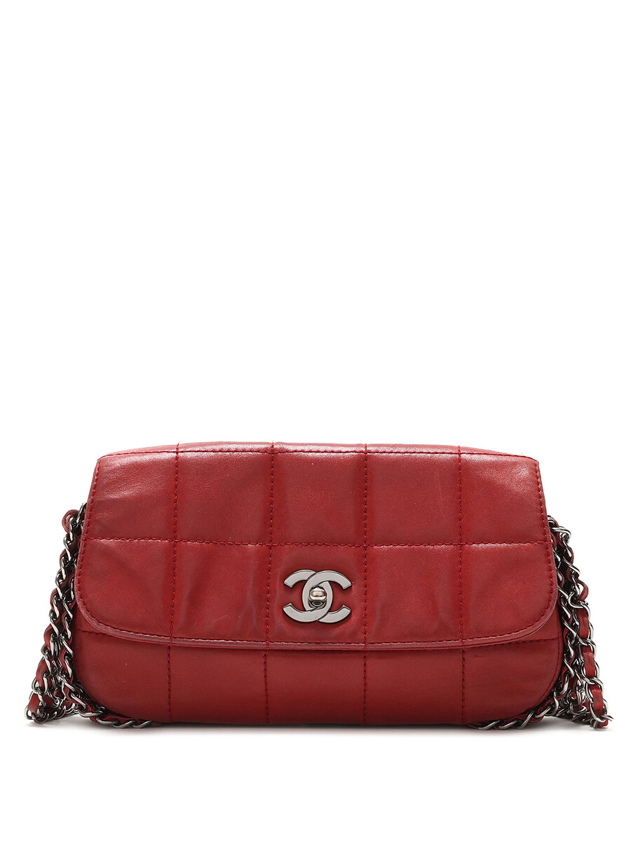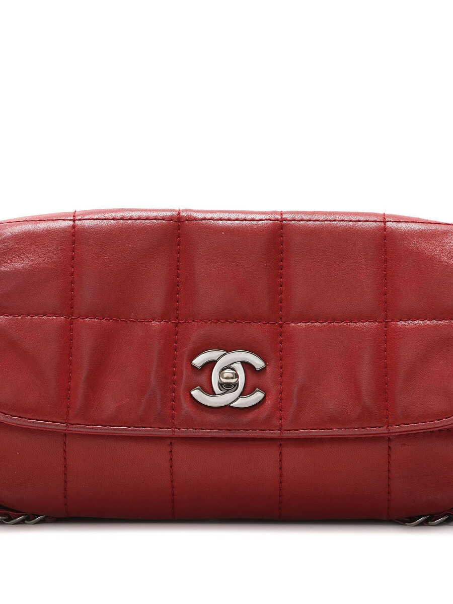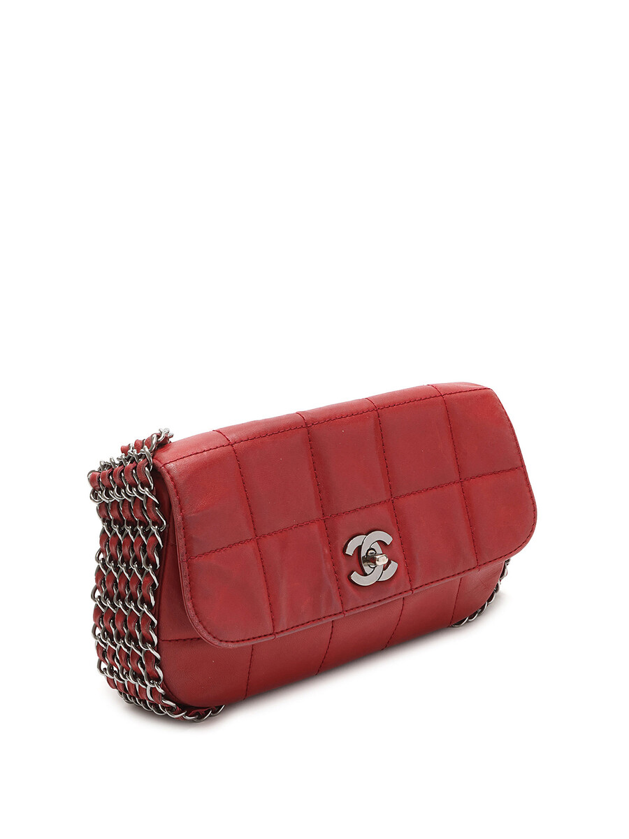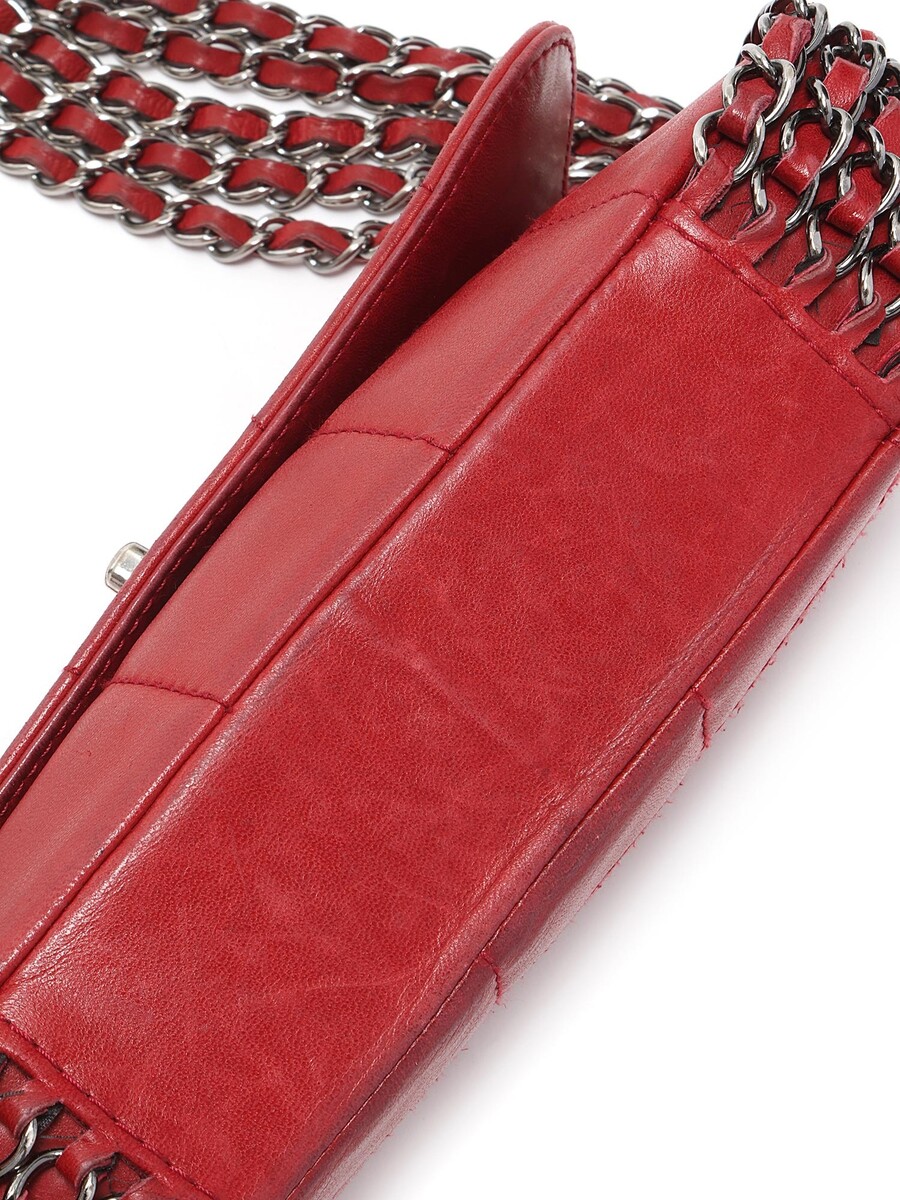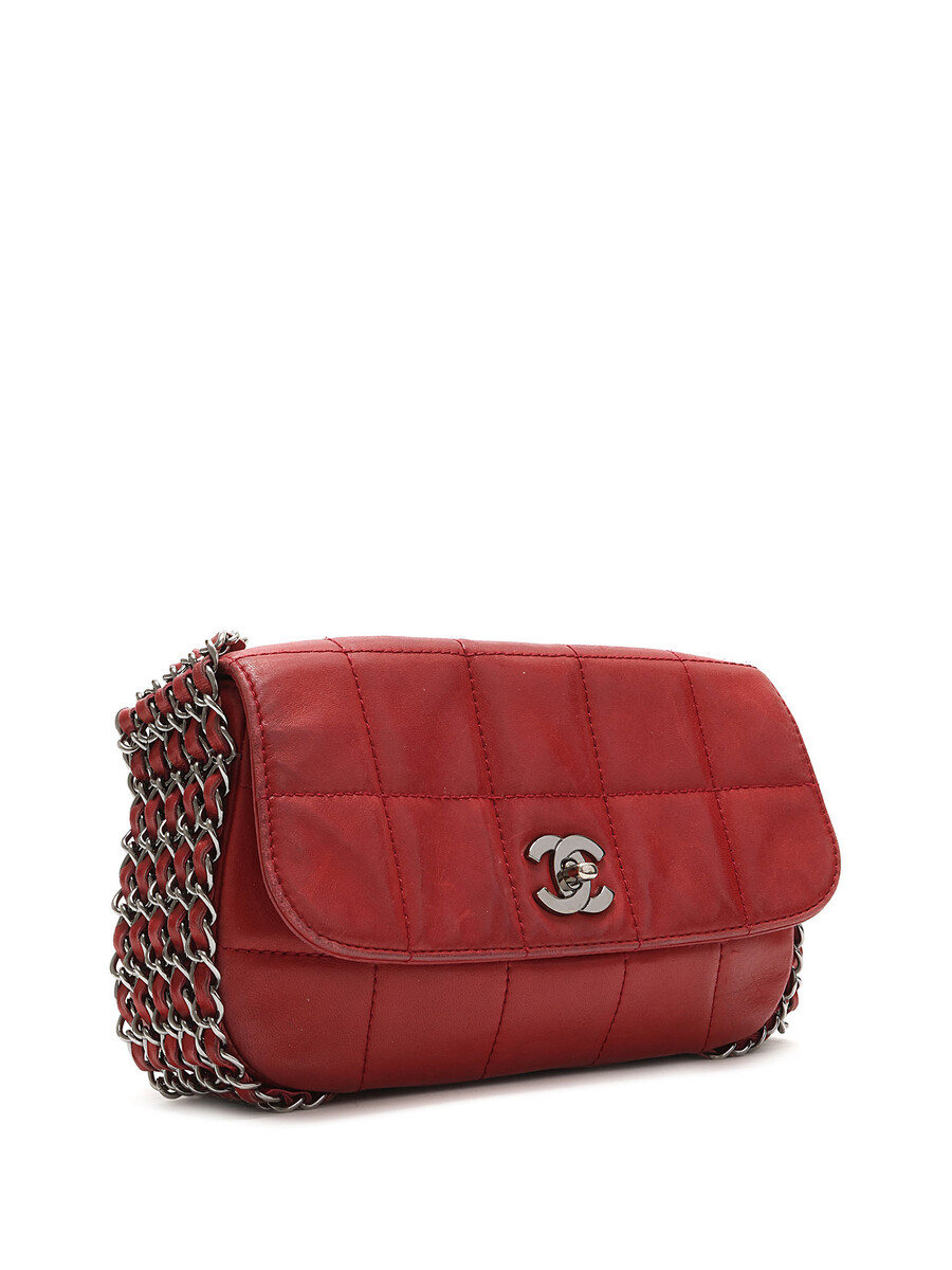 Quilted flap shoulder bag in red leather featuring an intertwined chain and leather strap. Turn-lock closure with logo on flap. Silver-tone hardware.