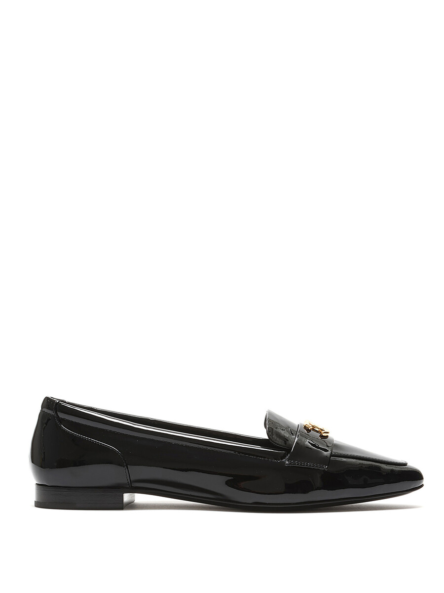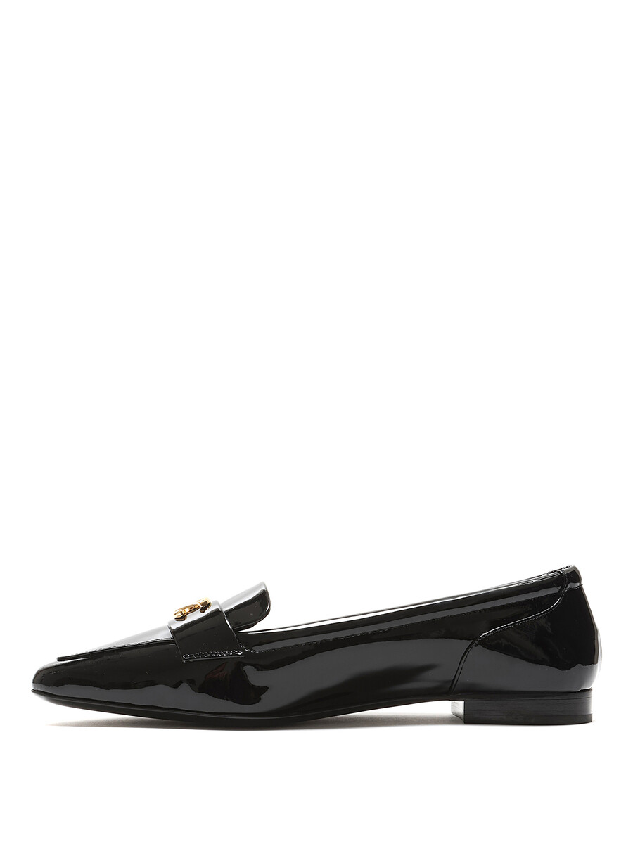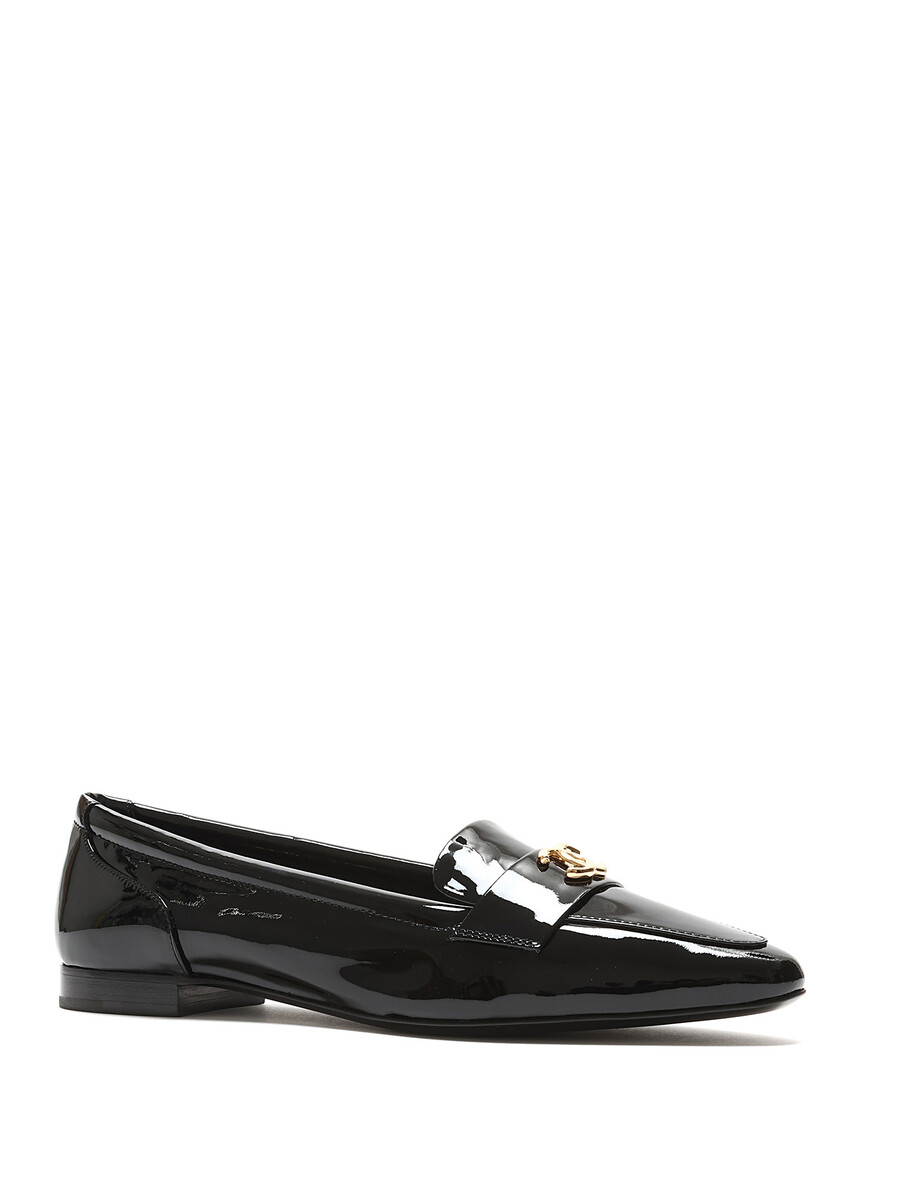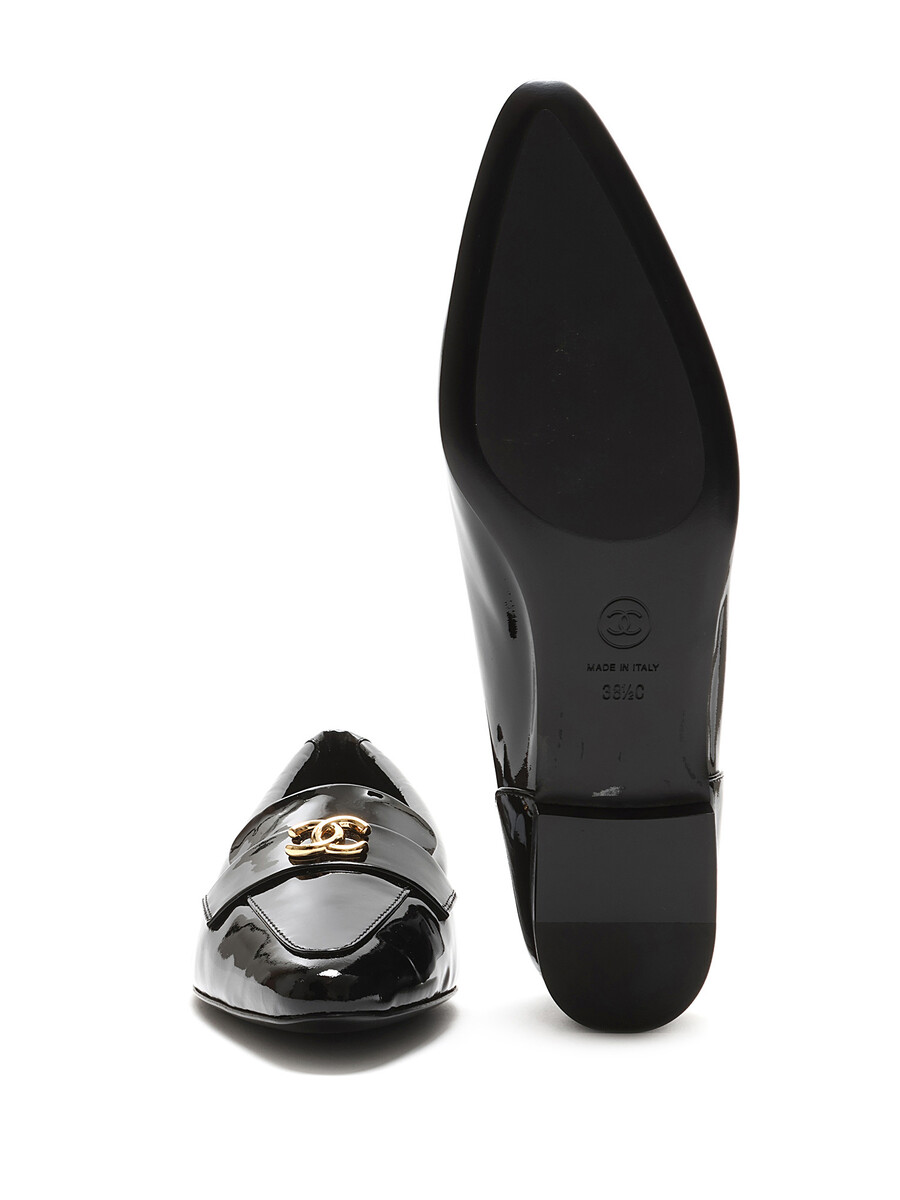 Patent leather loafers with gold-tone logo hardware by Chanel. Slip-on design with a closed pointy toe and leather sole.