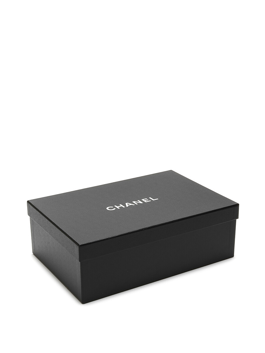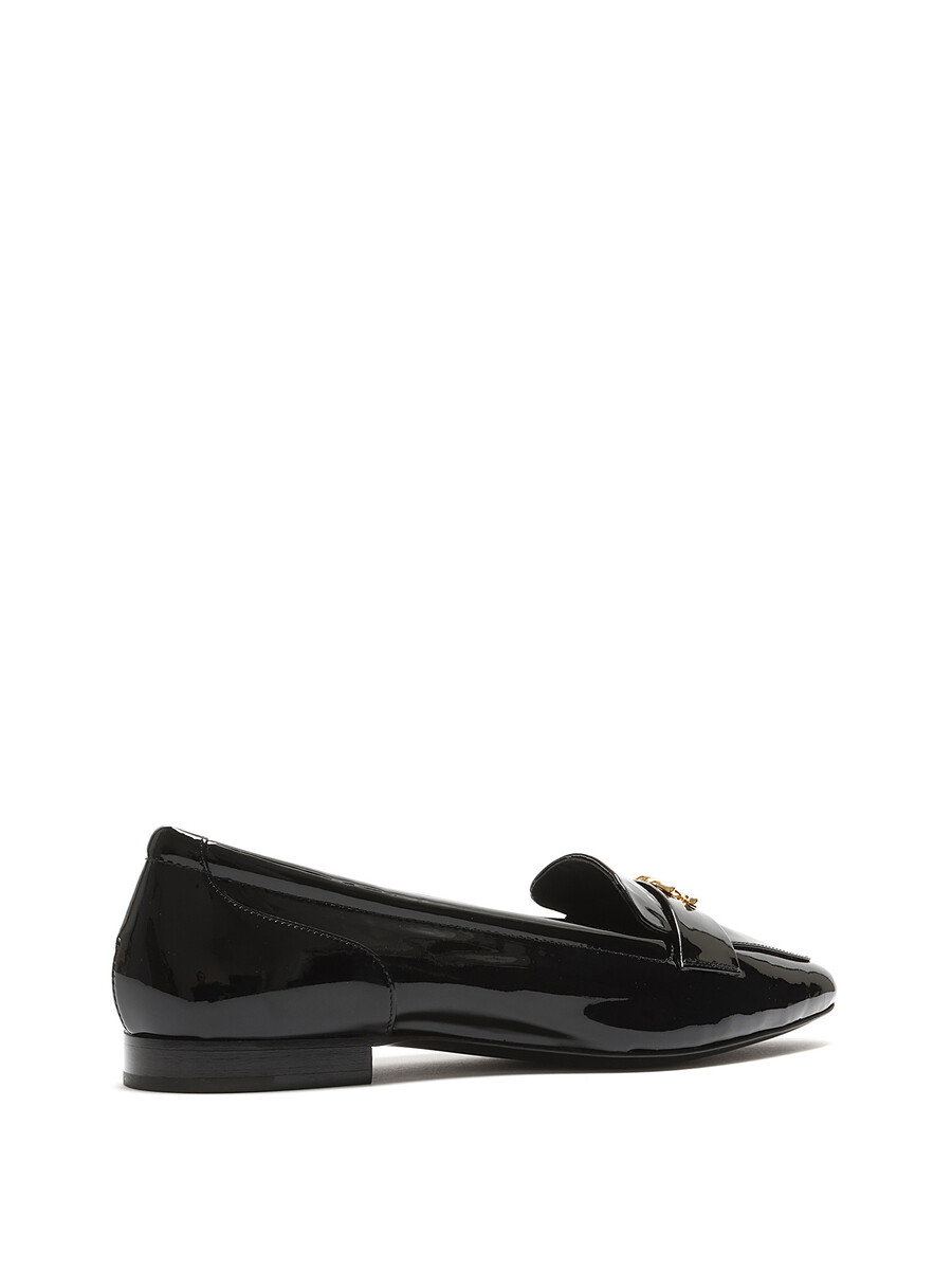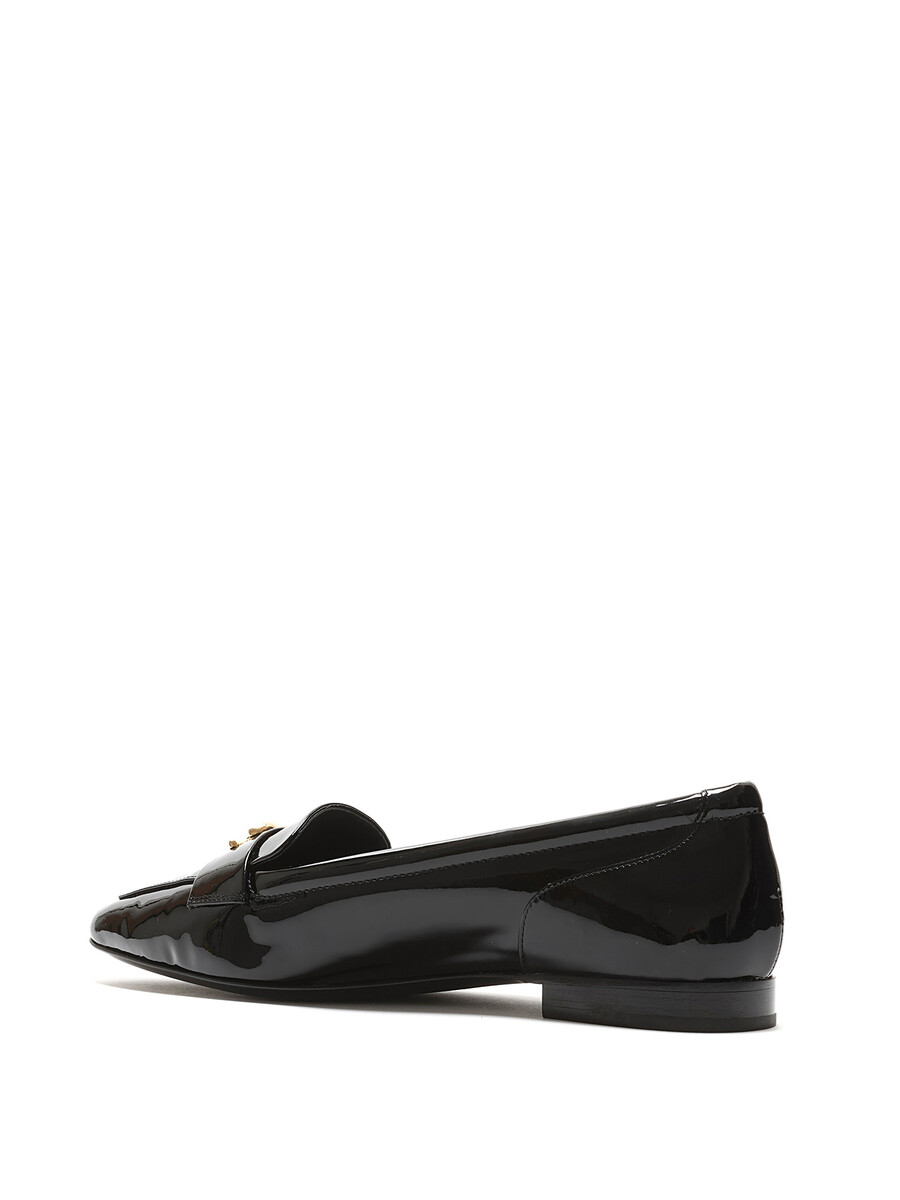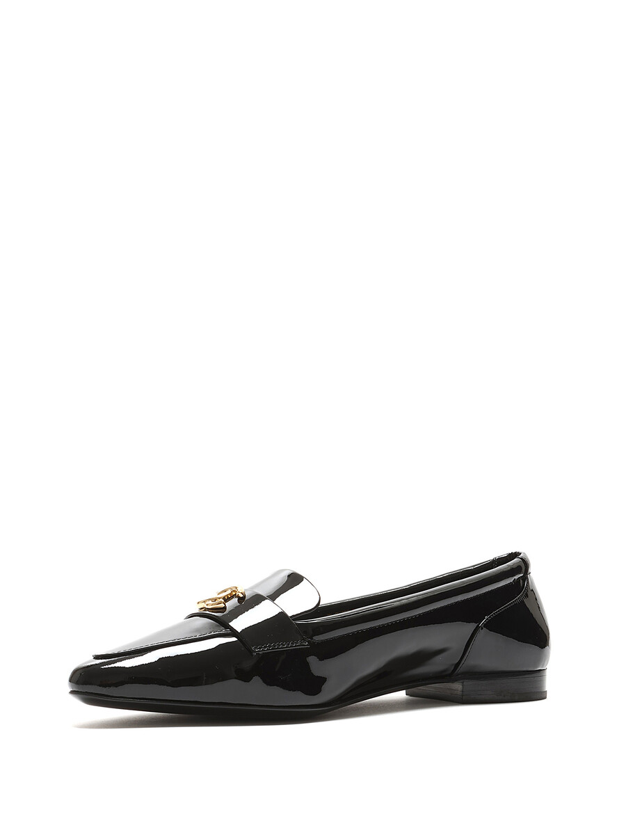 Patent leather loafers with gold-tone logo hardware by Chanel. Slip-on design with a closed pointy toe and leather sole.
