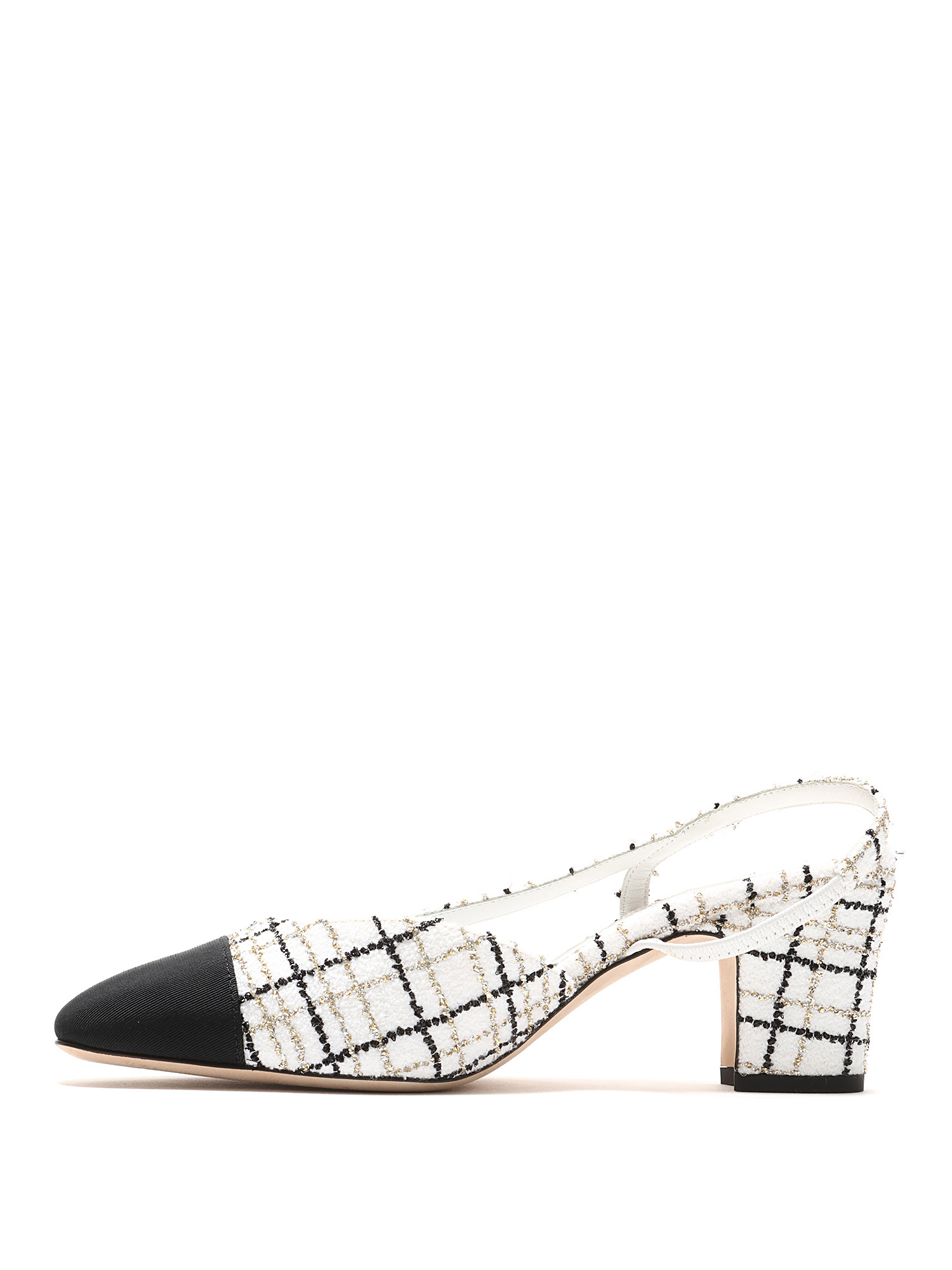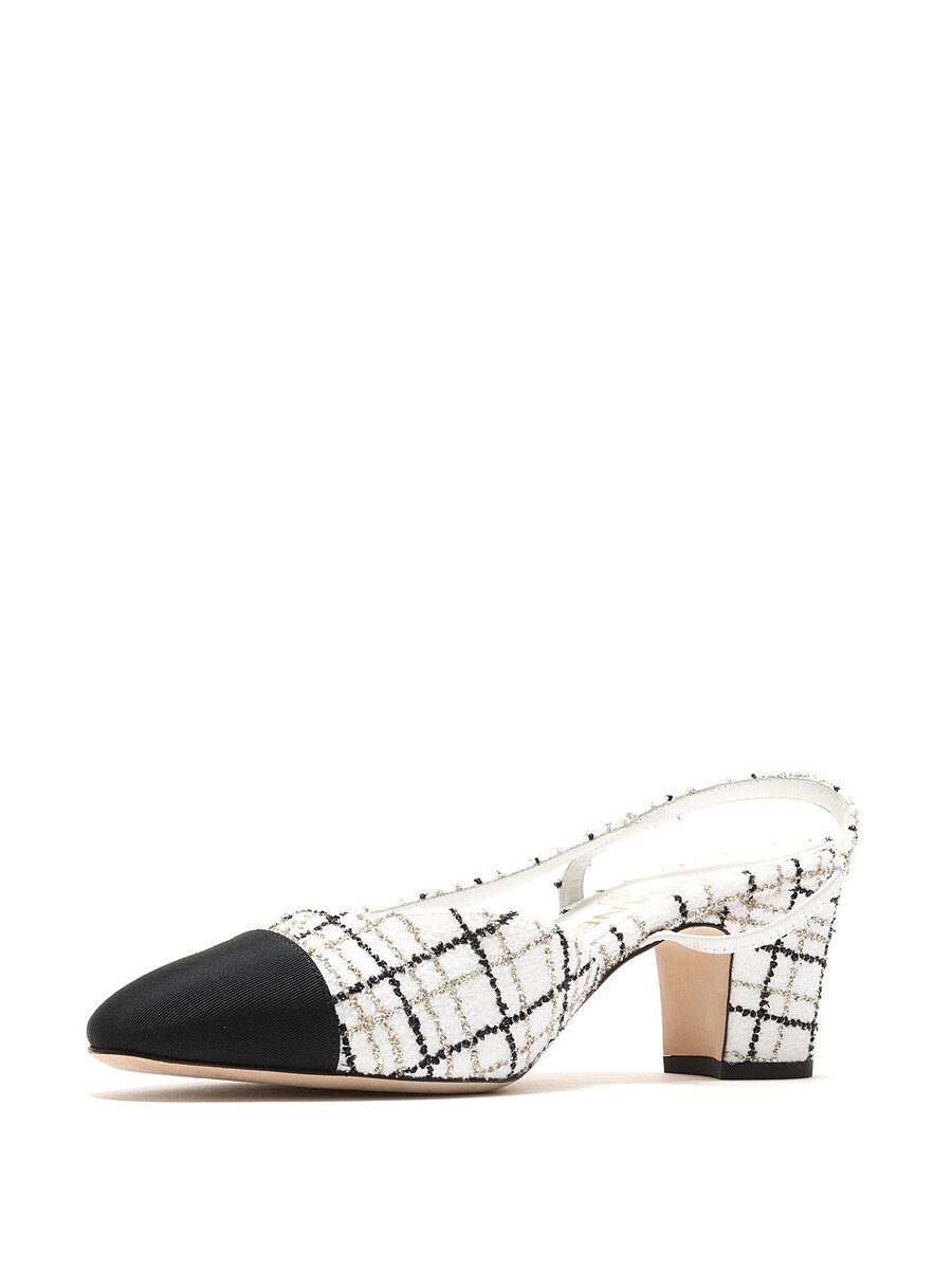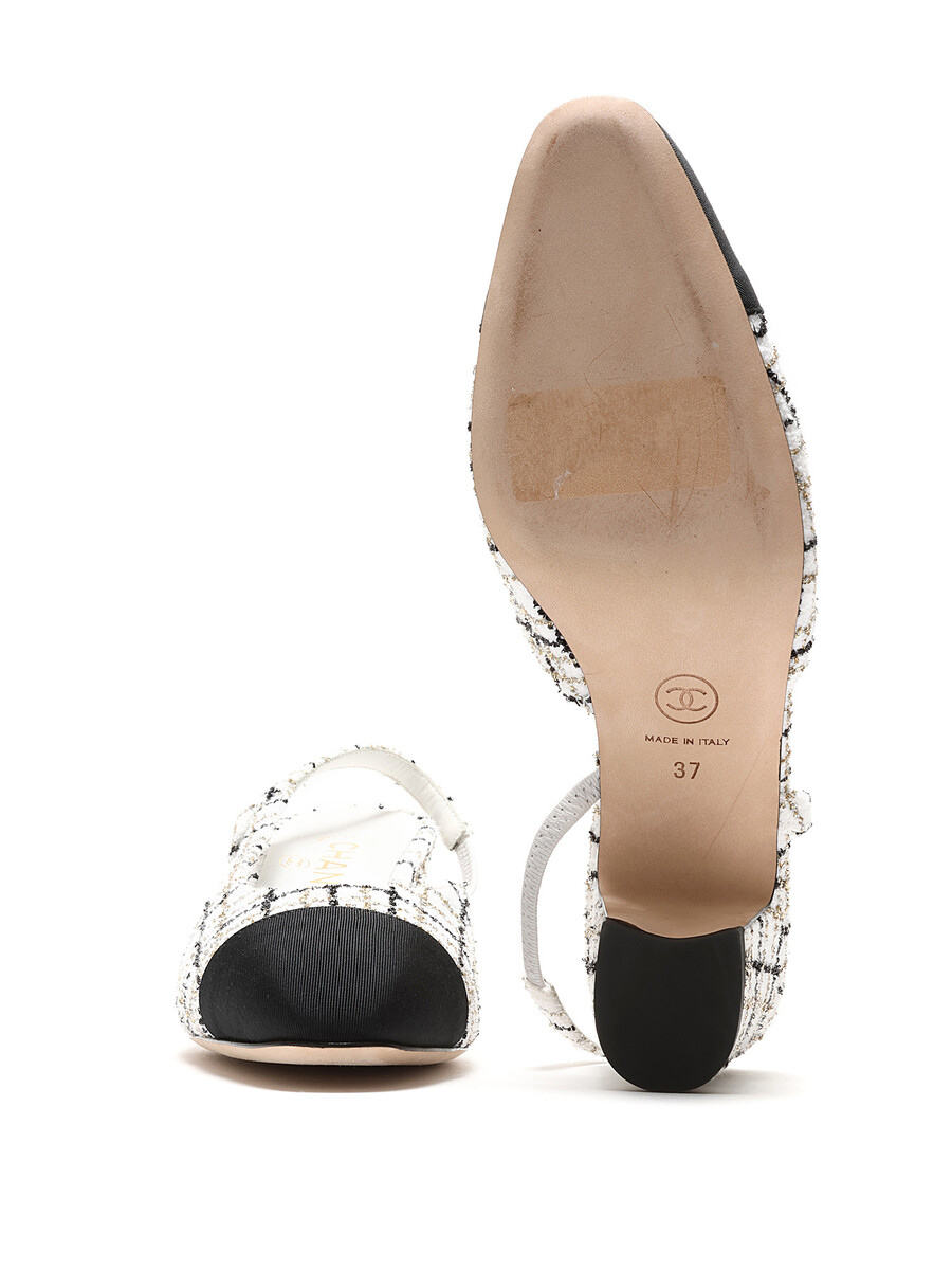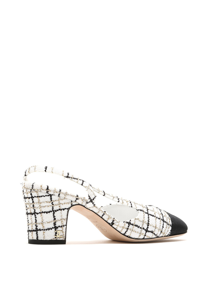 Tweed slingback pumps with contrasting toe cap in multi-tone. Elasticized slingback strap for comfort. Leather sole for durability.