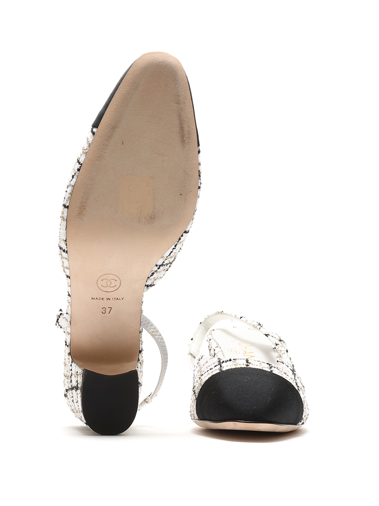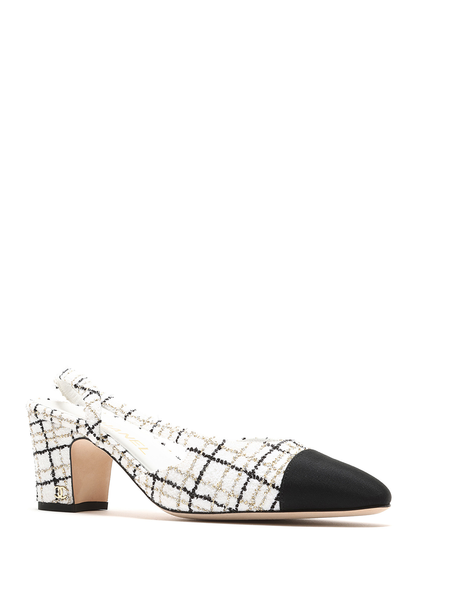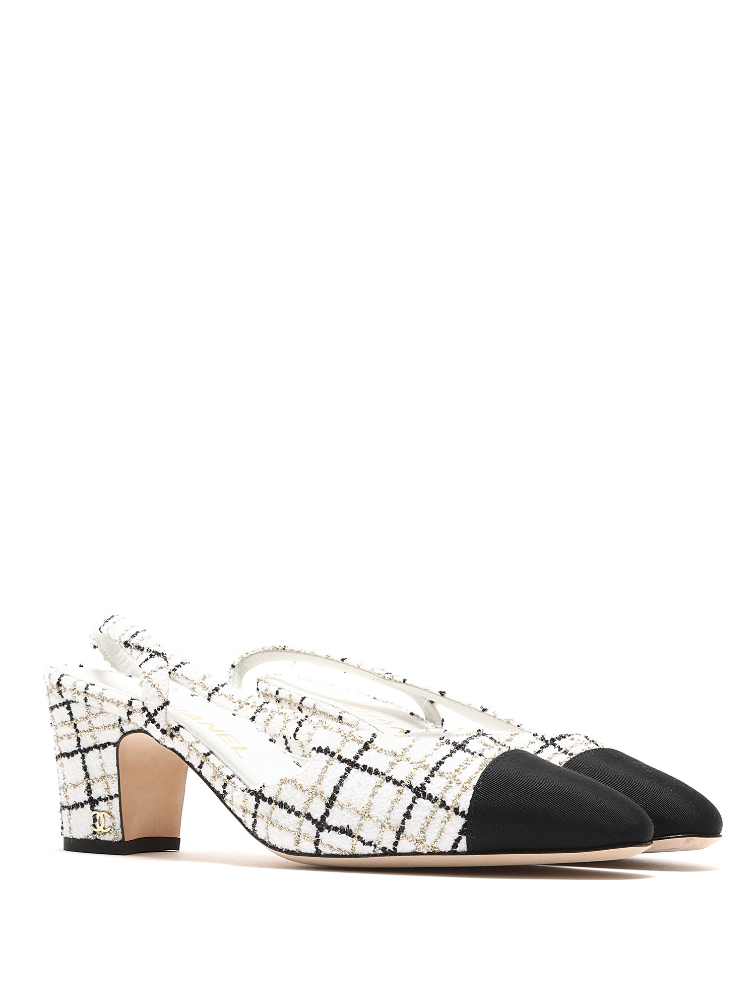 Tweed slingback pumps with contrasting toe cap in multi-tone. Elasticized slingback strap for comfort. Leather sole for durability.