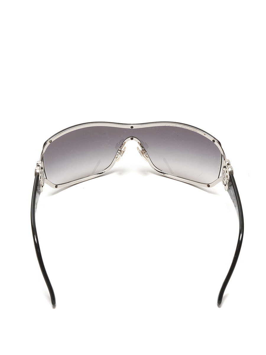 Wrap-around black acetate sunglasses. Silver-tone hardware with white floral embellishment and logo.