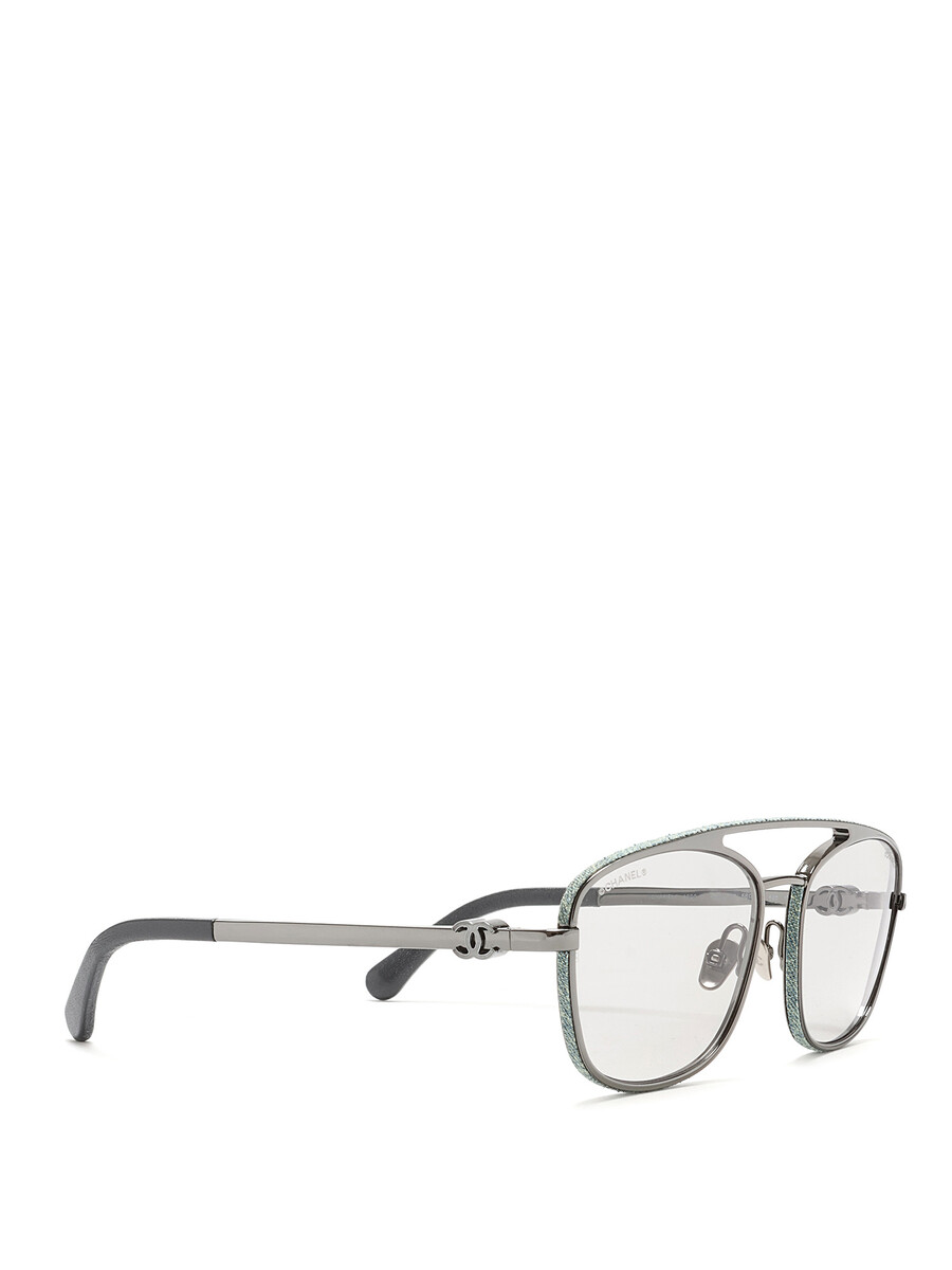 Rectangular aviator sunglasses in black with signature Chanel logo on temples. Denim detailing on rims. Silver-tone hardware.