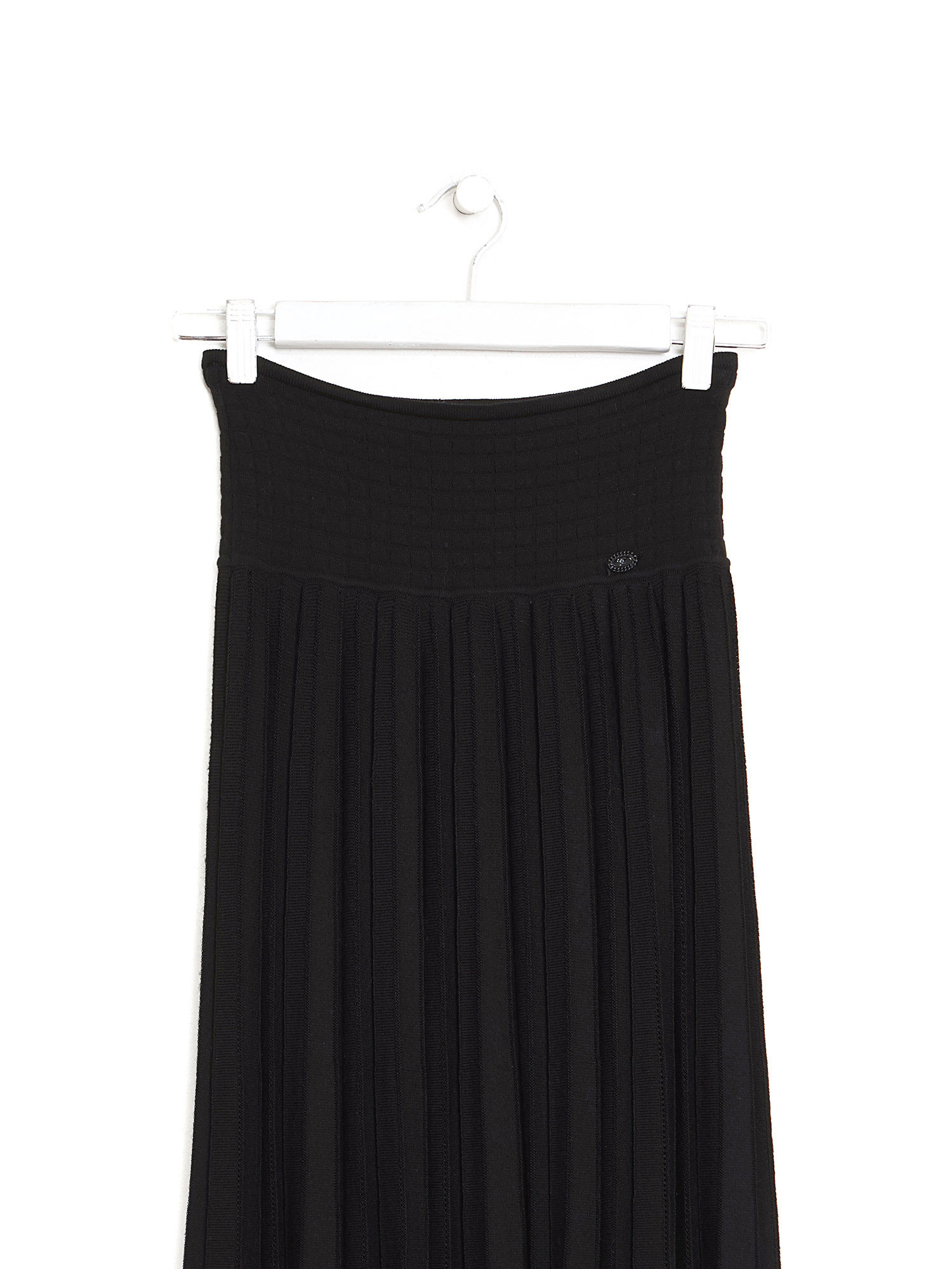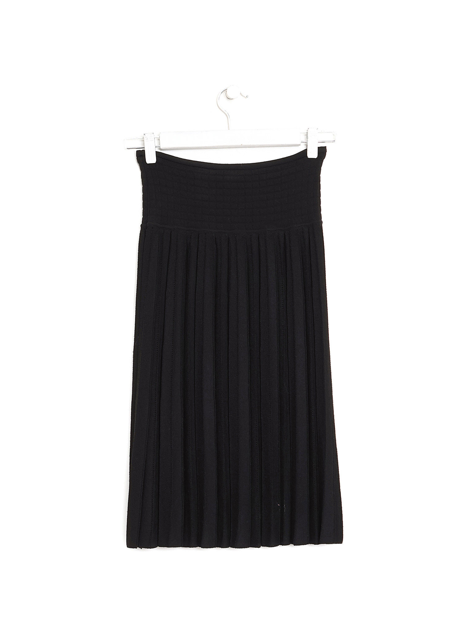 Pleated midi skirt in black. High waist. Subtle A-line silhouette. Concealed zip closure at side.
