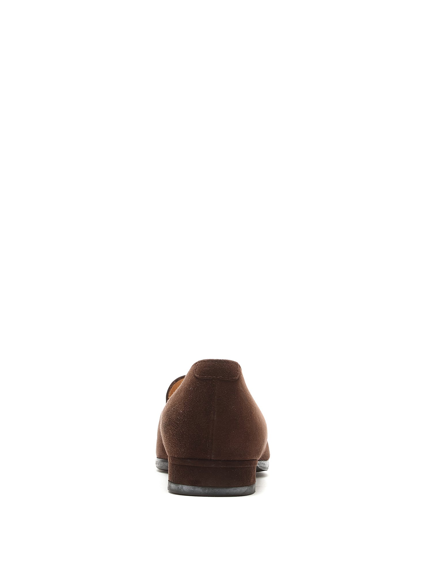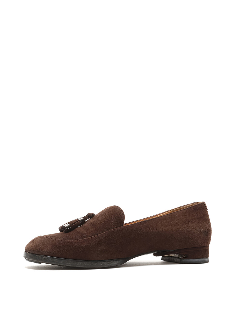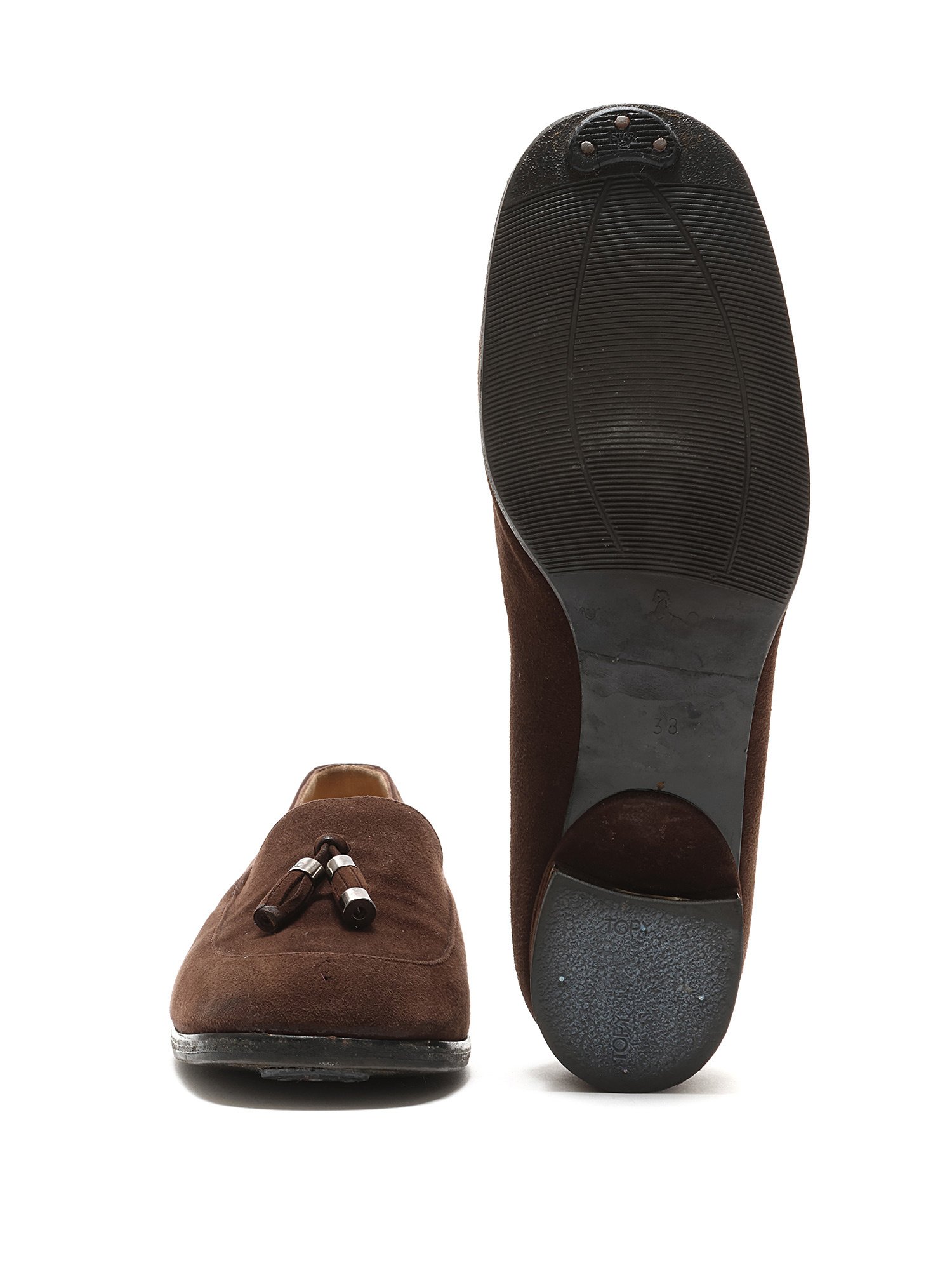 Brown suede loafers with tonal stitching and tassel embellishments. Square toe design and slip-on closure. Rubber sole. Comes with dust bag.