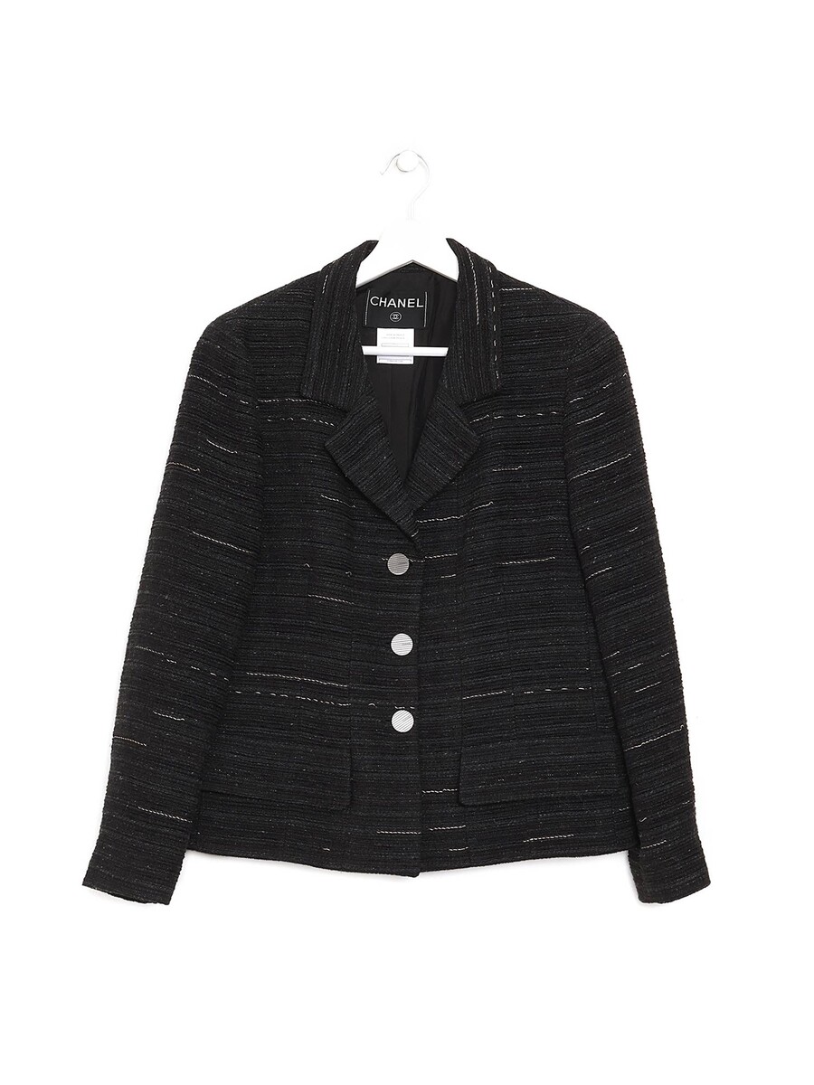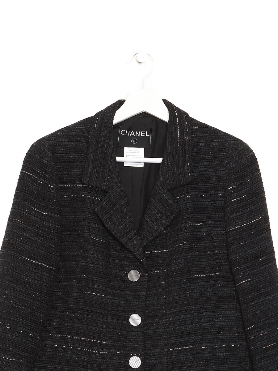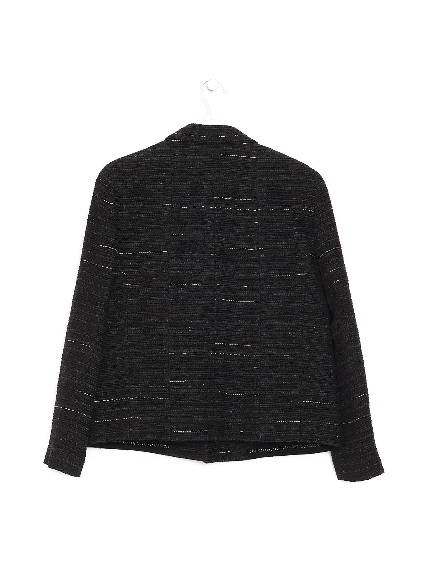 Tweed blazer in dark grey with contrasting thread in grey and white. Button front closure. Lapel collar. Fully lined with silk.