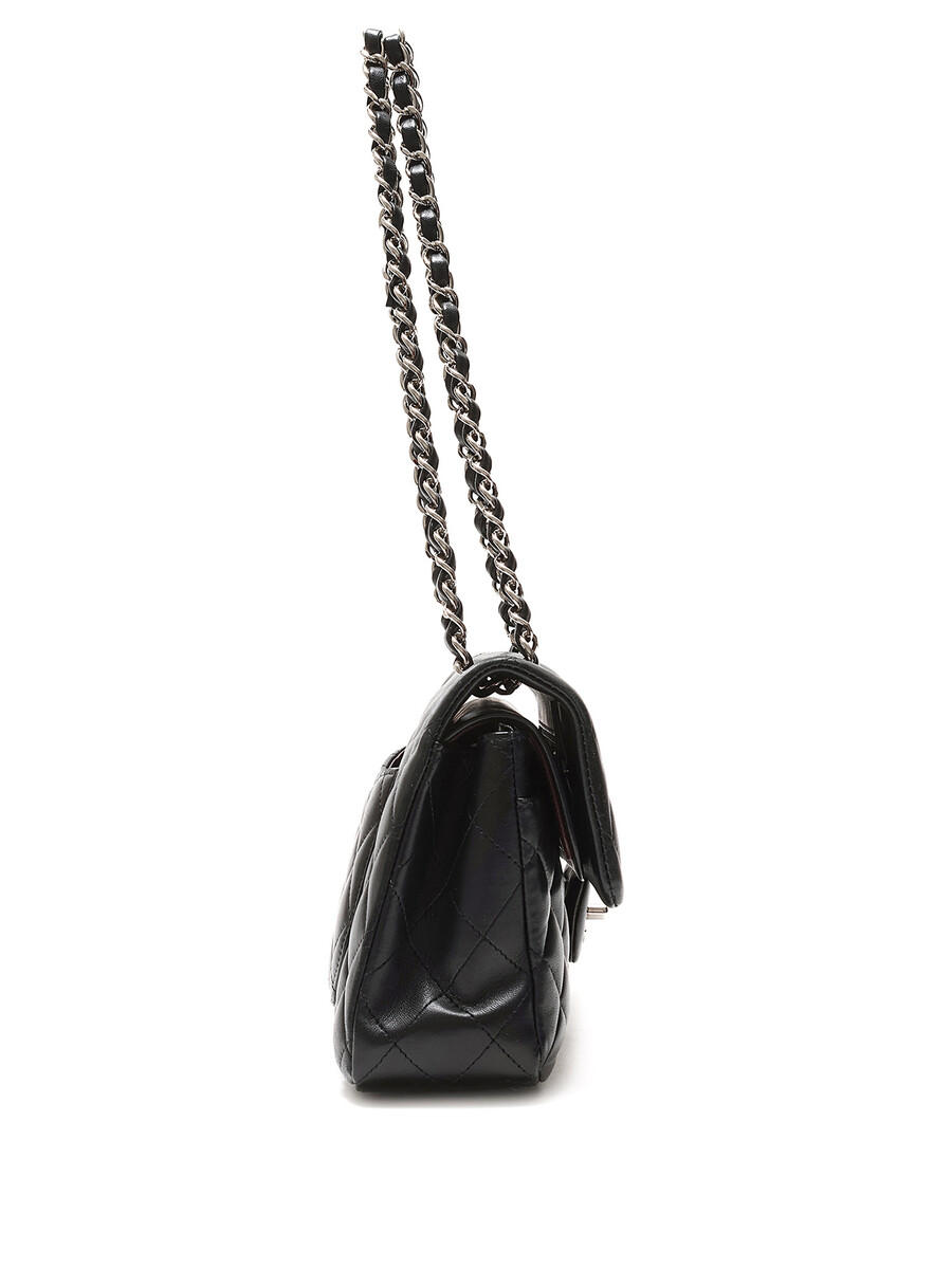 Leather flap bag with a quilted pattern in black. Features a turn-lock closure. Chain and leather interwoven shoulder strap. Silver-tone hardware.