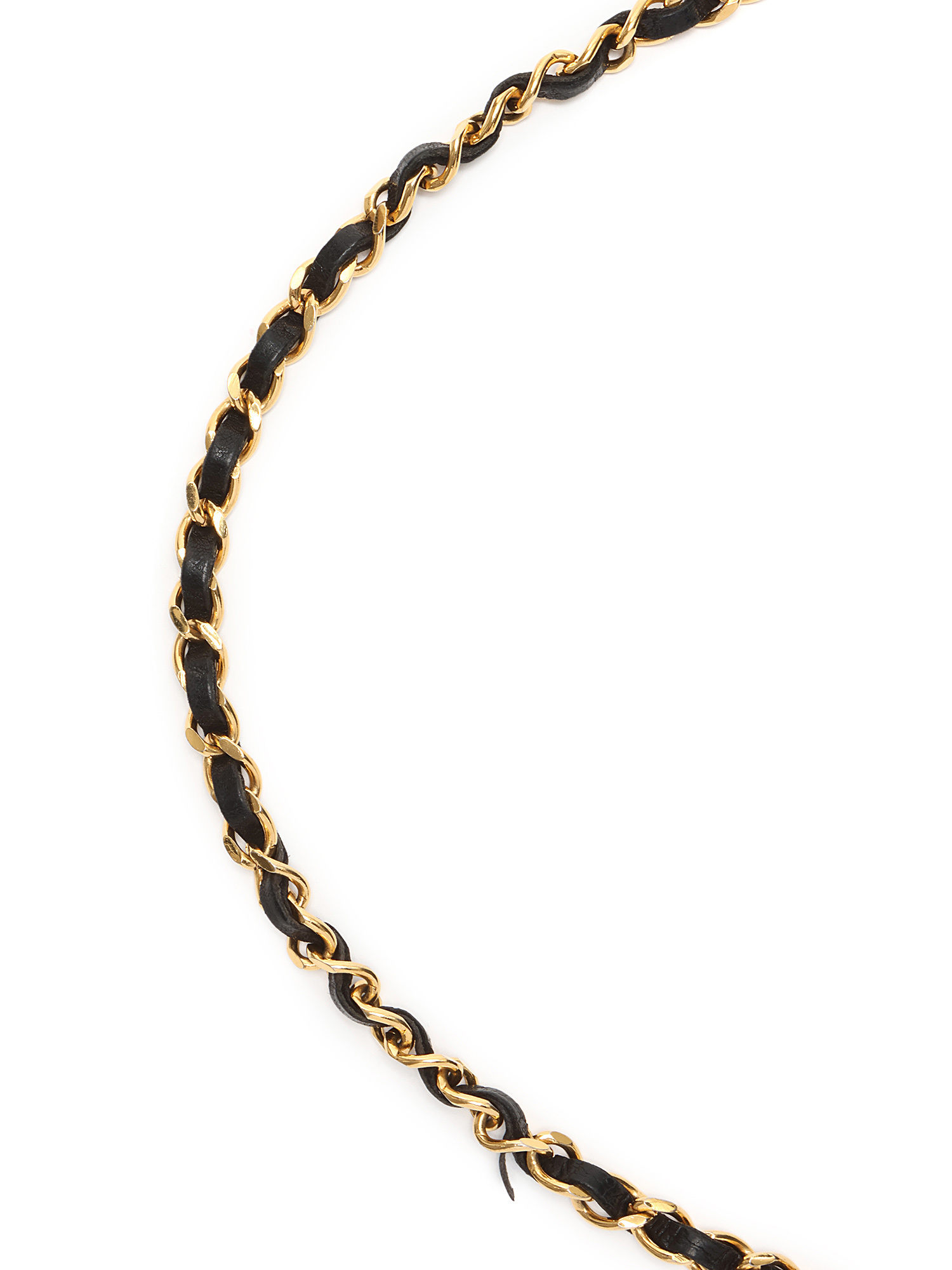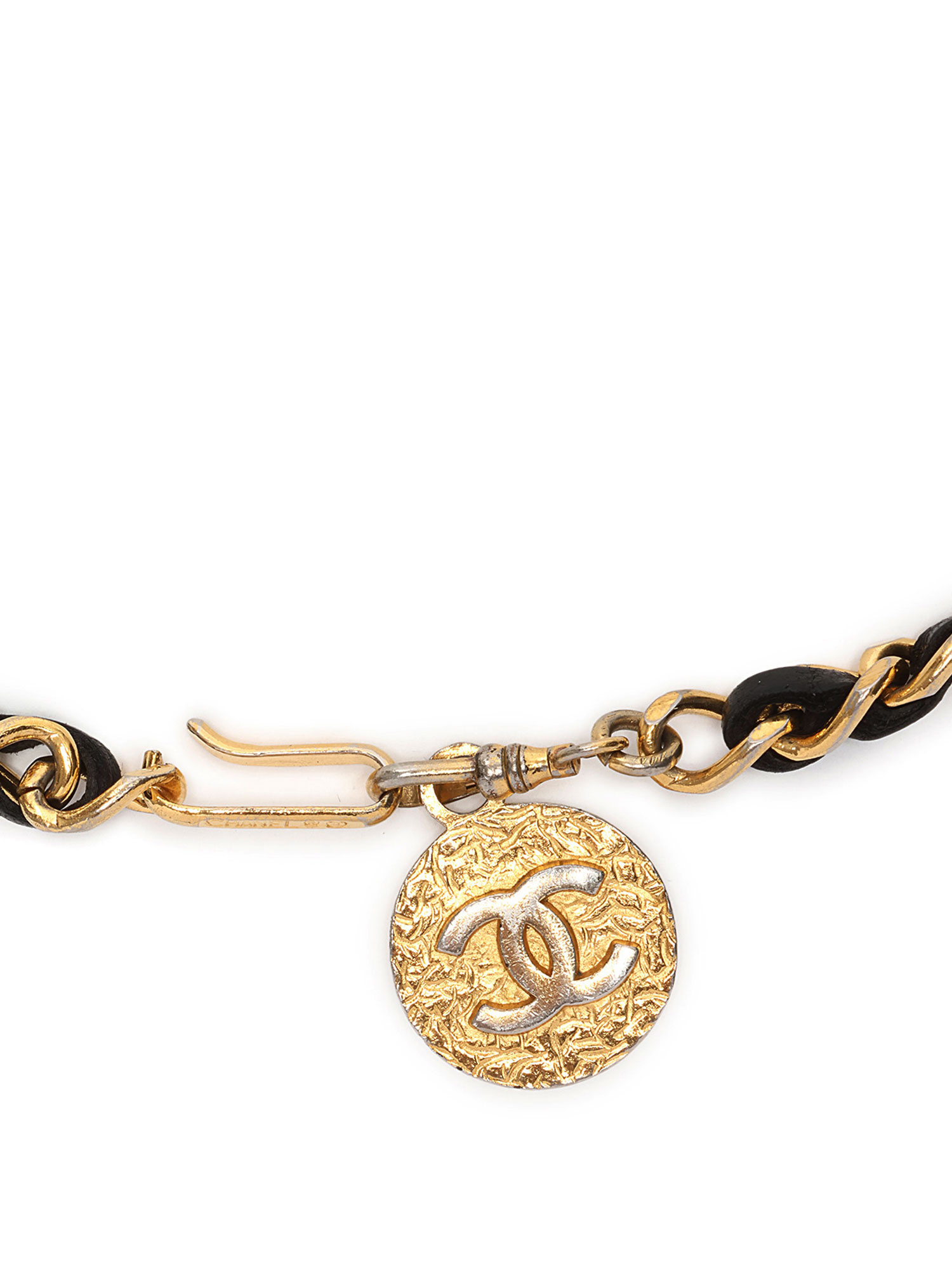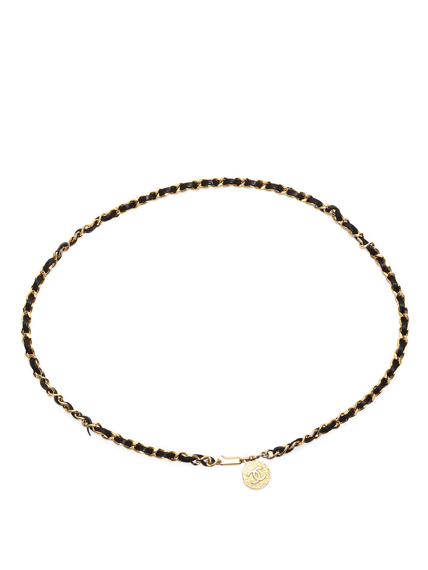 Braided leather chain belt with gold-toned links, adorned with an engraved CC logo on the pendant. Hook closure. Gold-tone hardware.