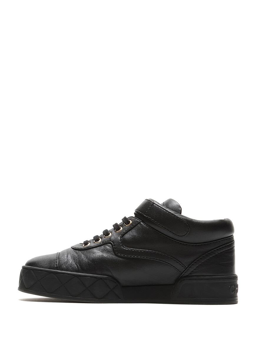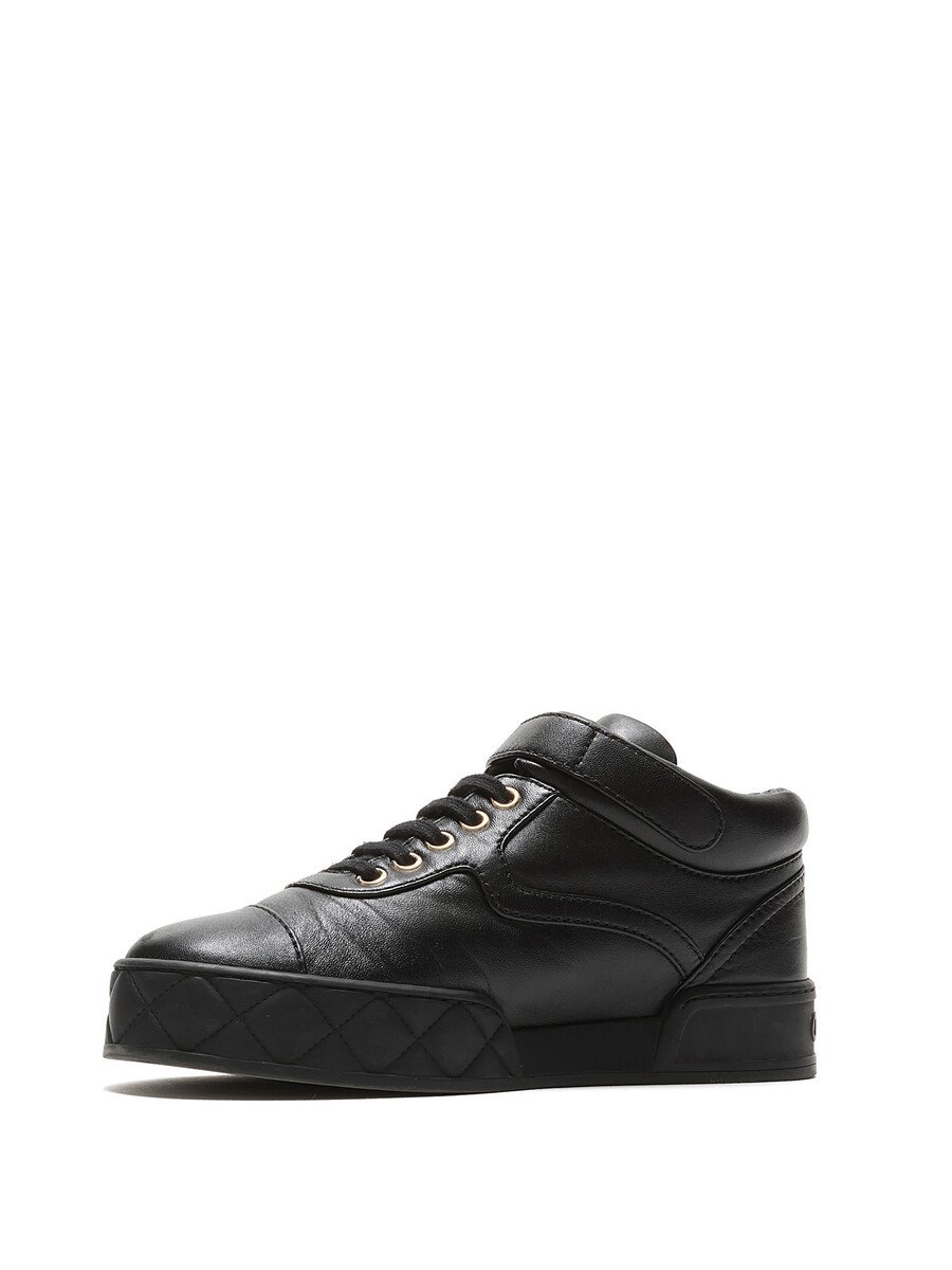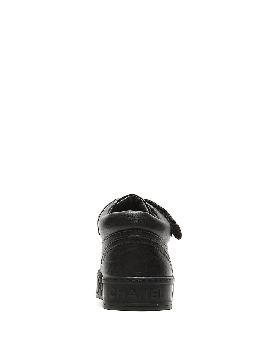 Black grained leather sneakers featuring velcro closures with logo motif and lace-up design. Round toe and rubber sole.