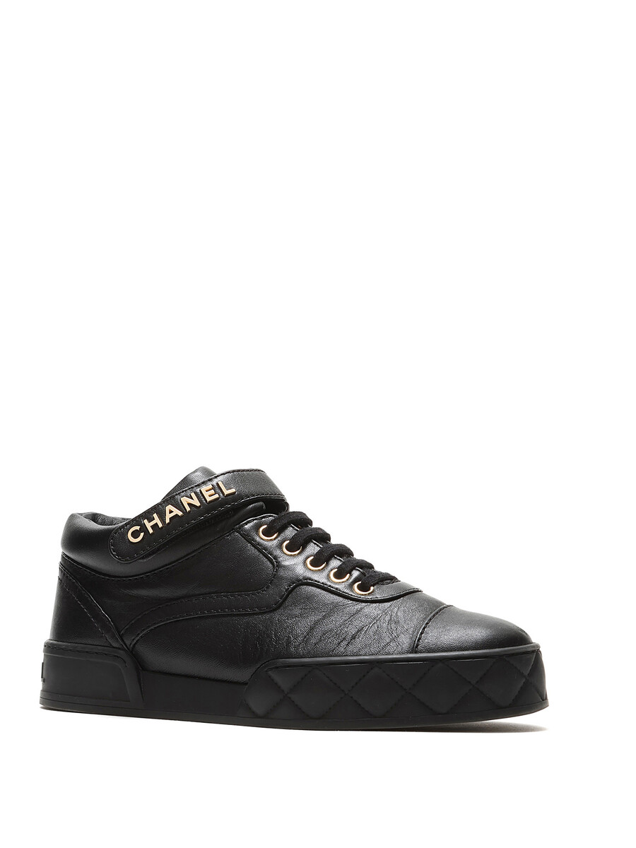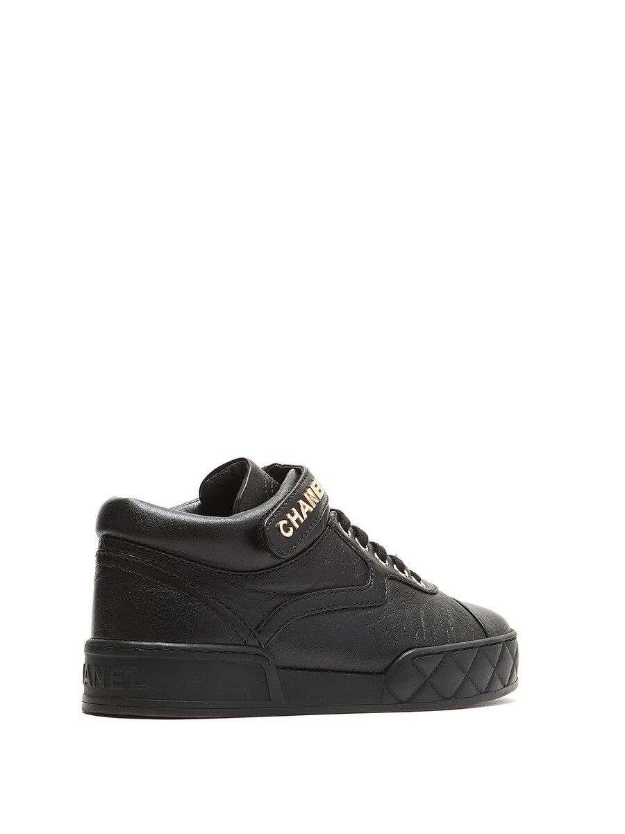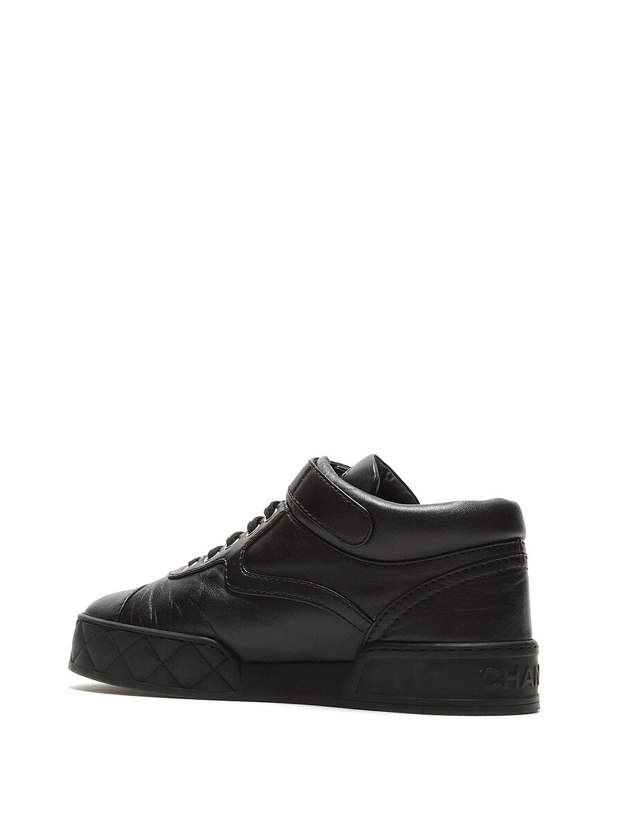 Black grained leather sneakers featuring velcro closures with logo motif and lace-up design. Round toe and rubber sole.