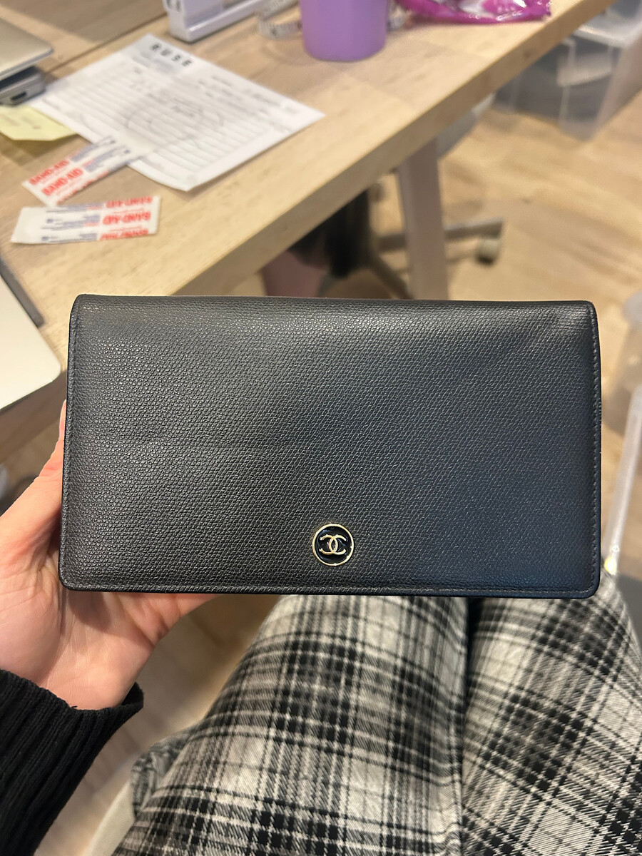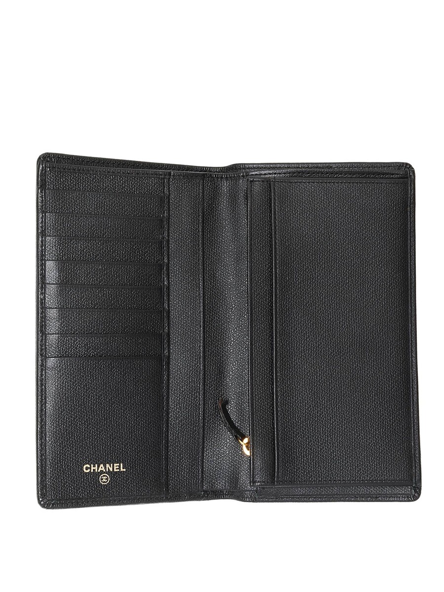 Textured black leather wallet with a gold-tone Chanel logo emblem. Zipper closure with gold-tone hardware. Compact design for everyday use.