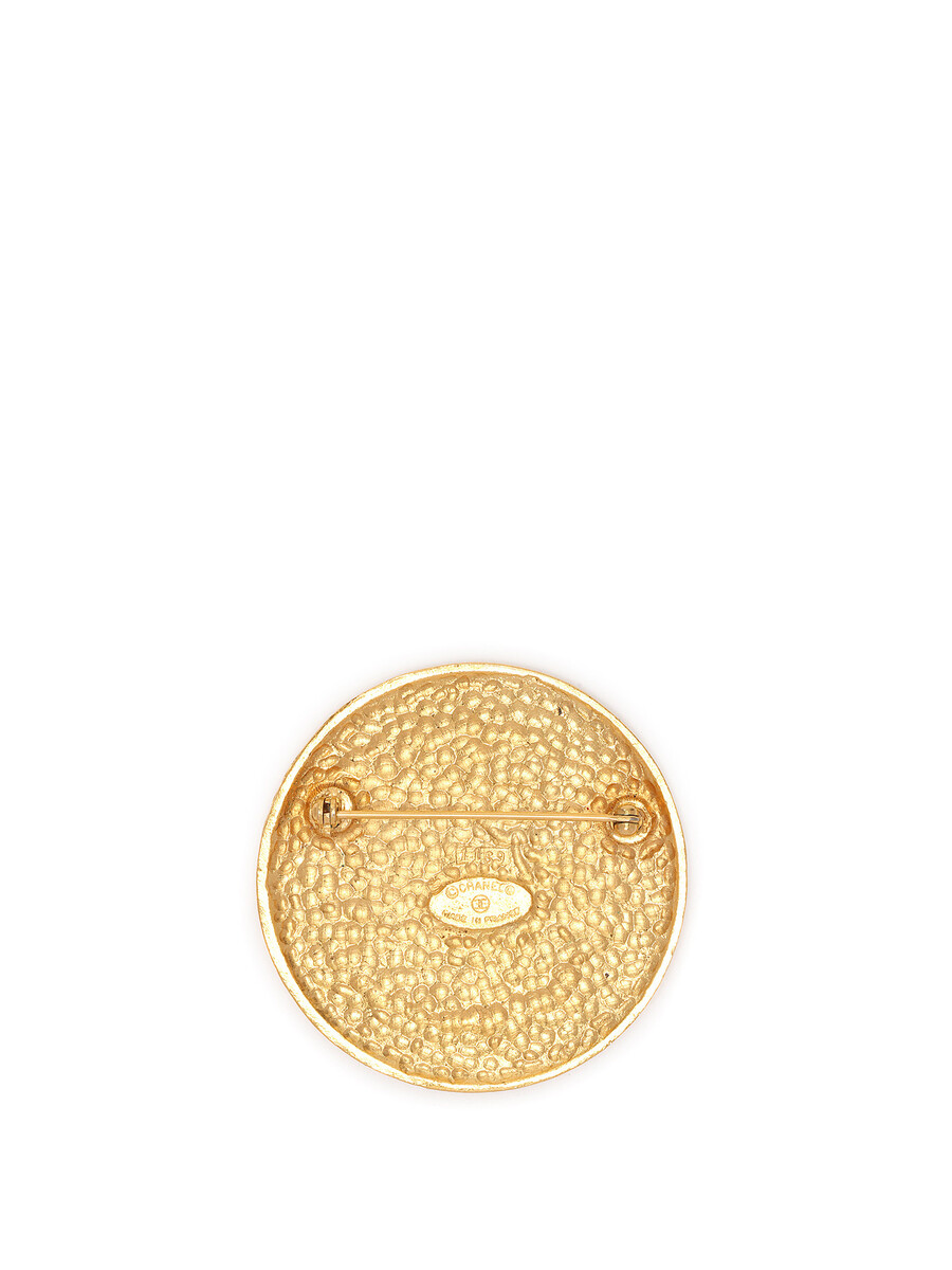Round gold-tone metal brooch featuring a lion motif and crest. Pin fastening at back. Comes with box.
