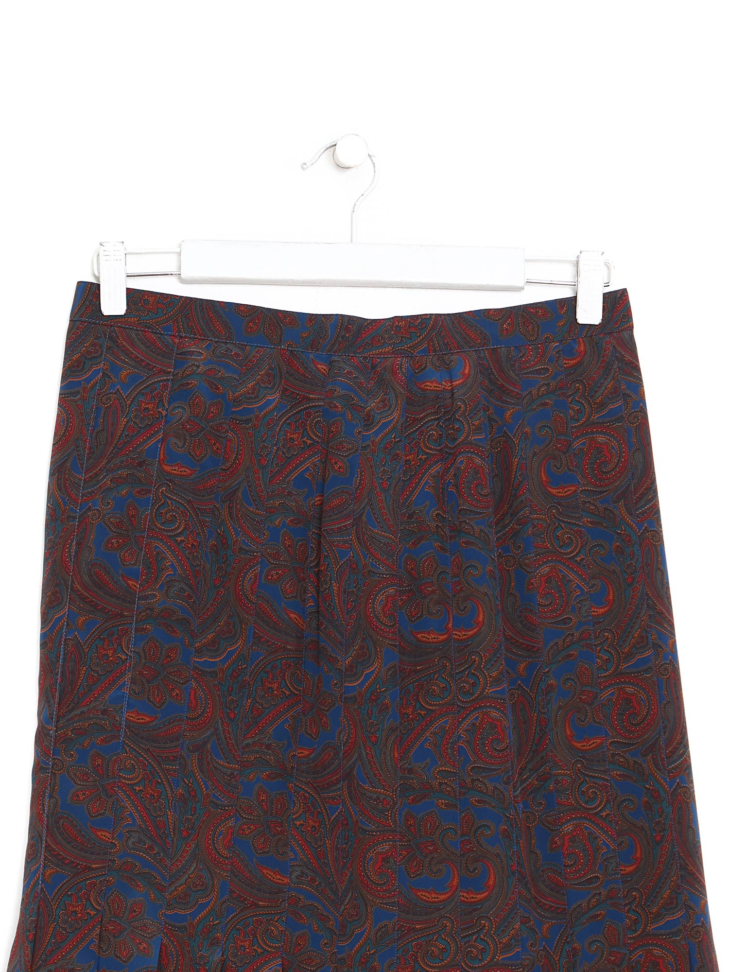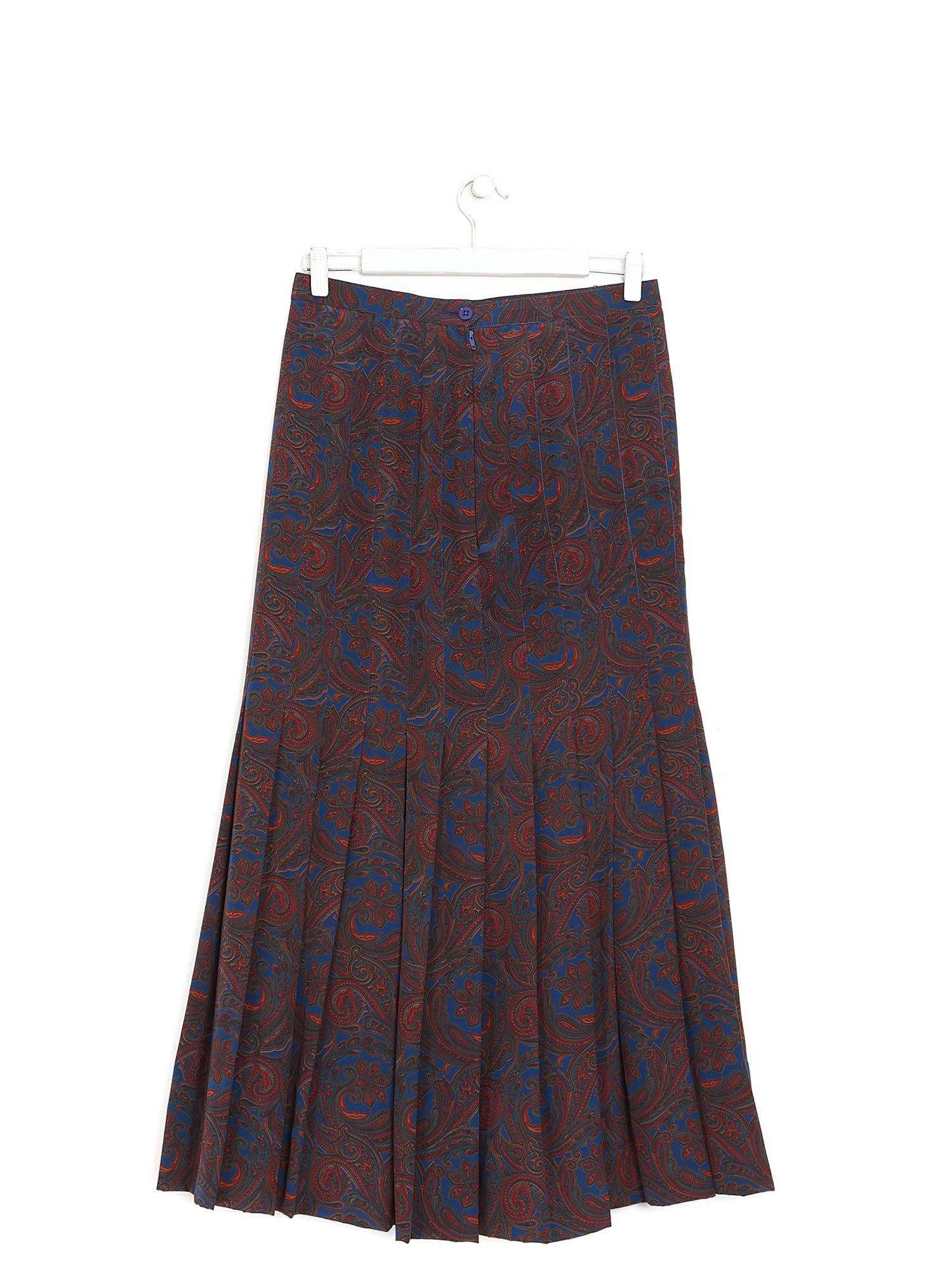 Abstract-patterned pleated silk skirt. Features a high waist and flowing drape.
