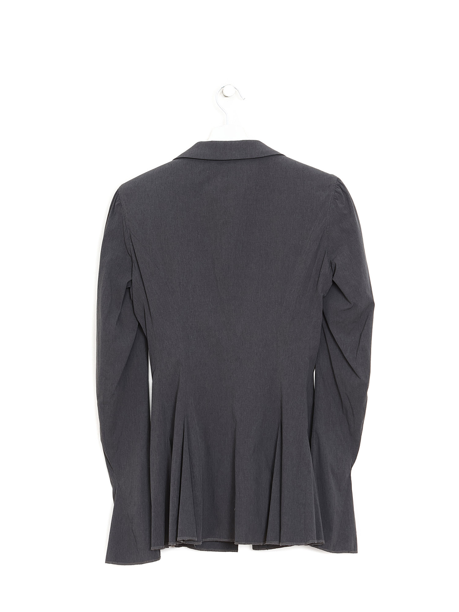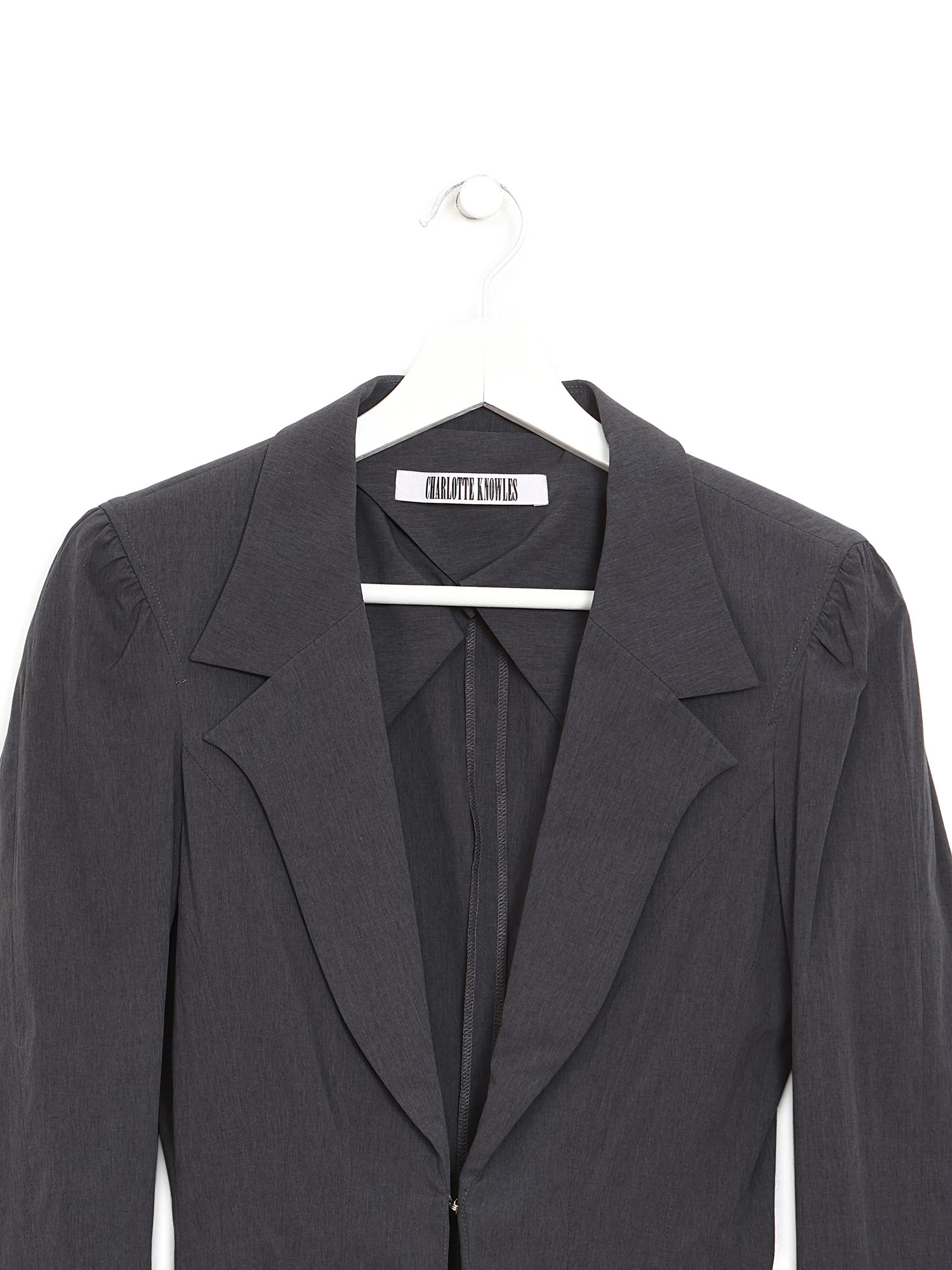 Long sleeve blazer in dark grey featuring a deep neckline and hook and eye closure. Shirt collar with a sleek, tailored fit.