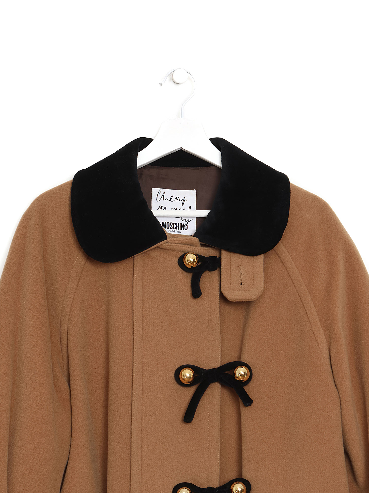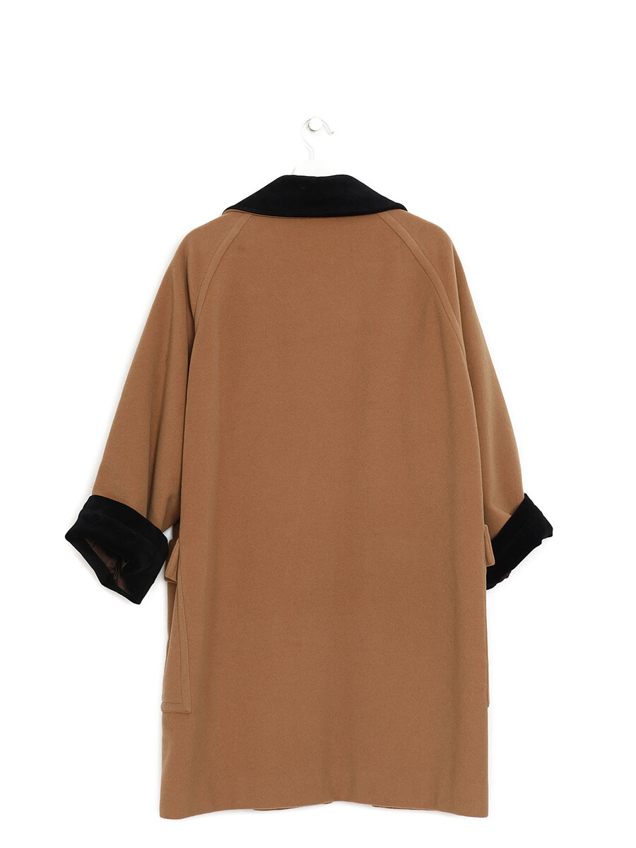 Camel wool coat featuring bow-shaped buttons and a velvet collar. Front flap pockets add a classic touch, ensuring style and warmth.