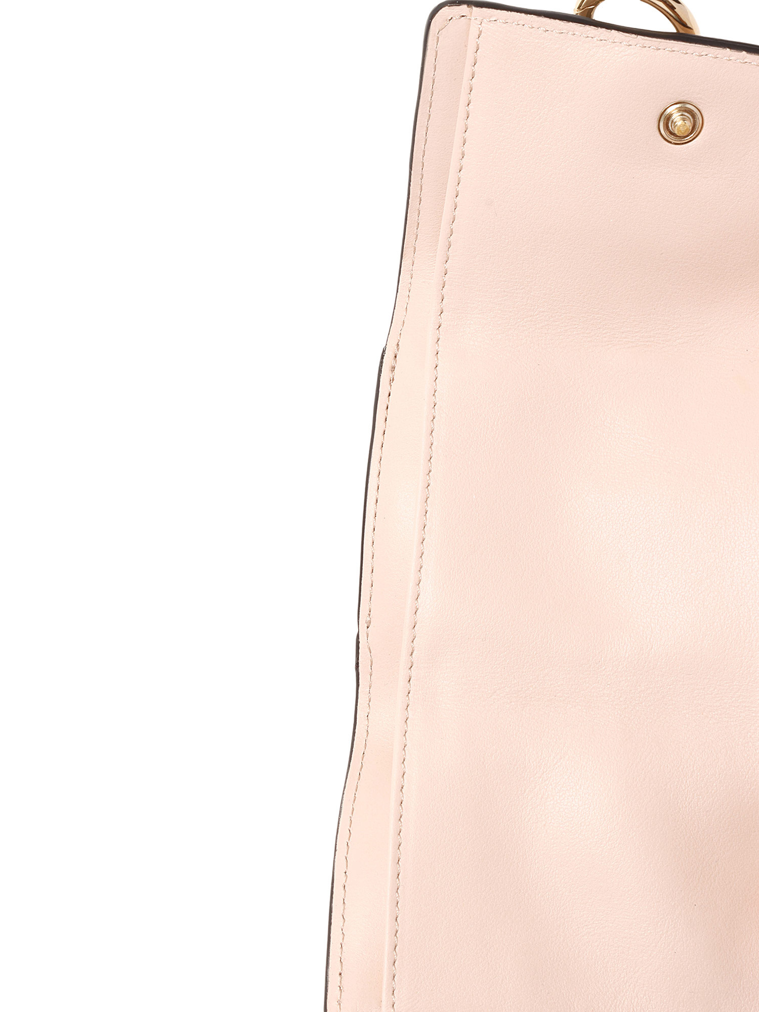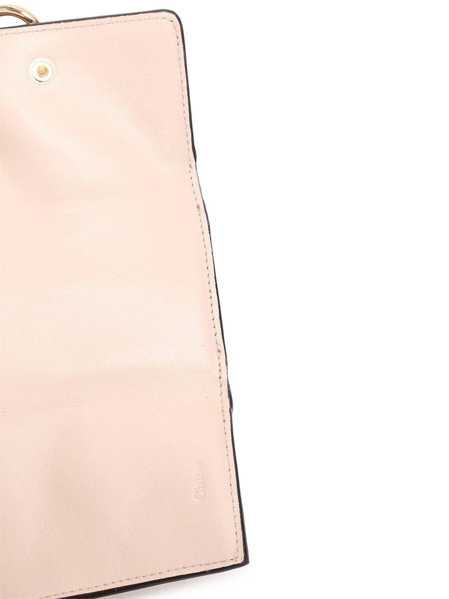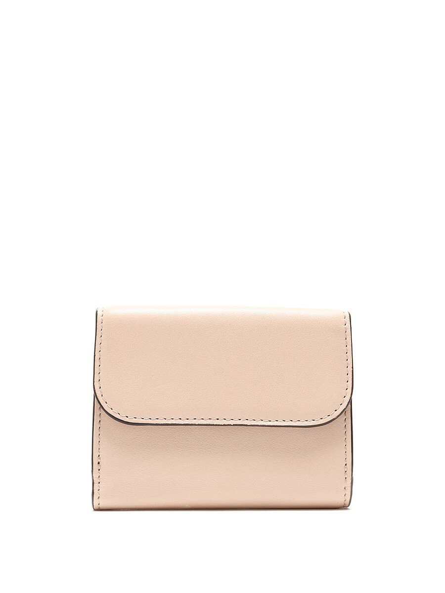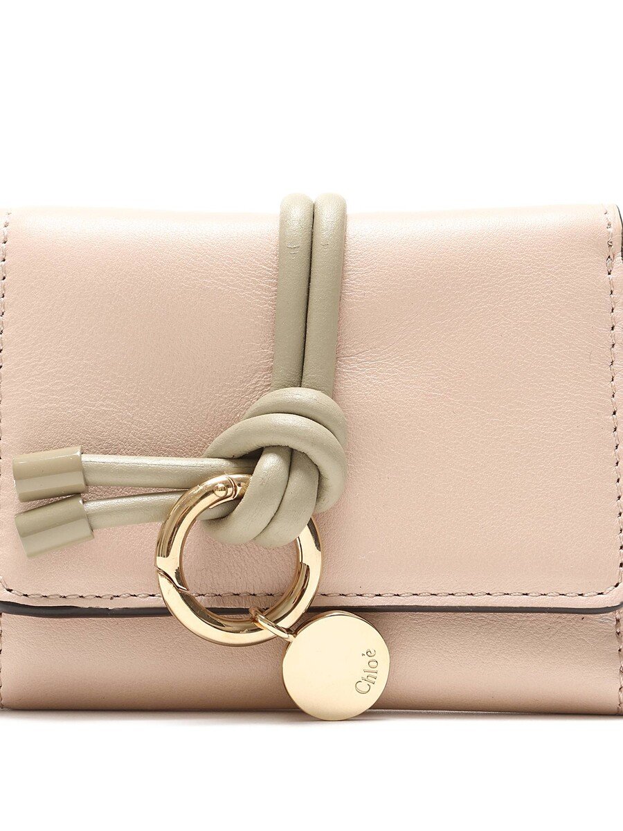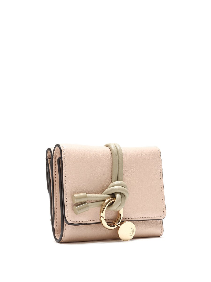 Mini wallet in light beige calfskin leather. Features a knotted leather detail with gold-tone ring hardware. Snap button closure.