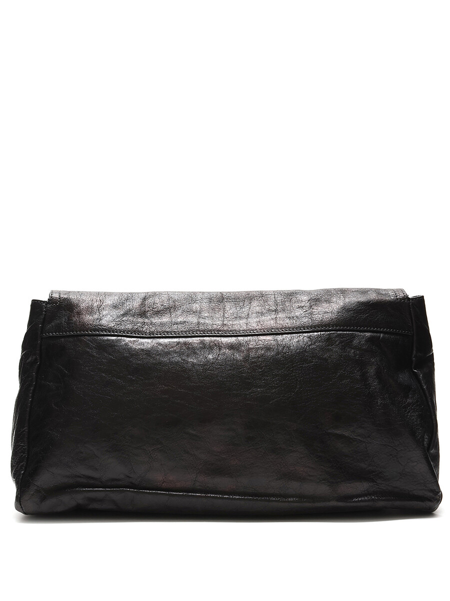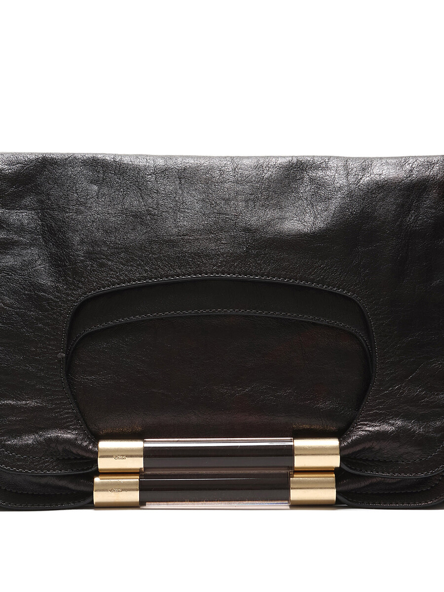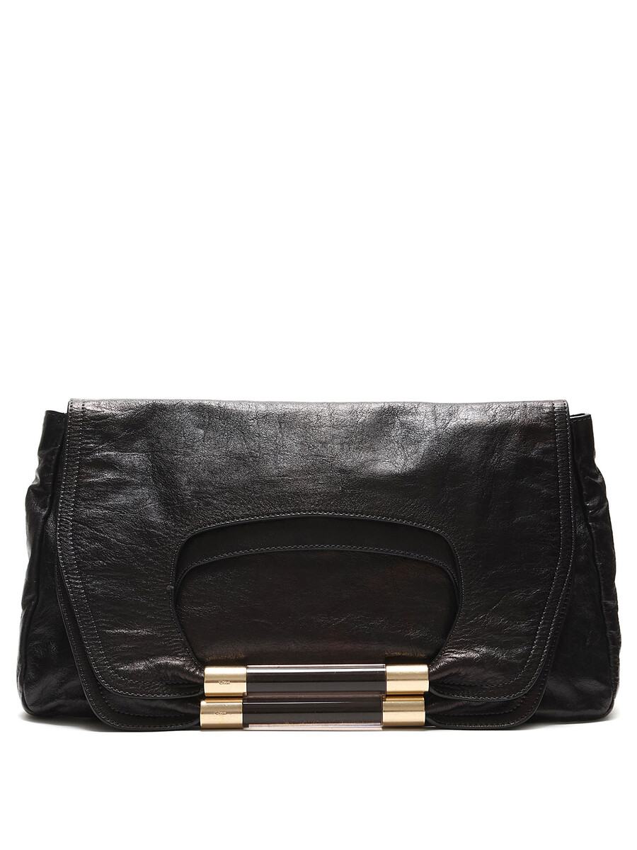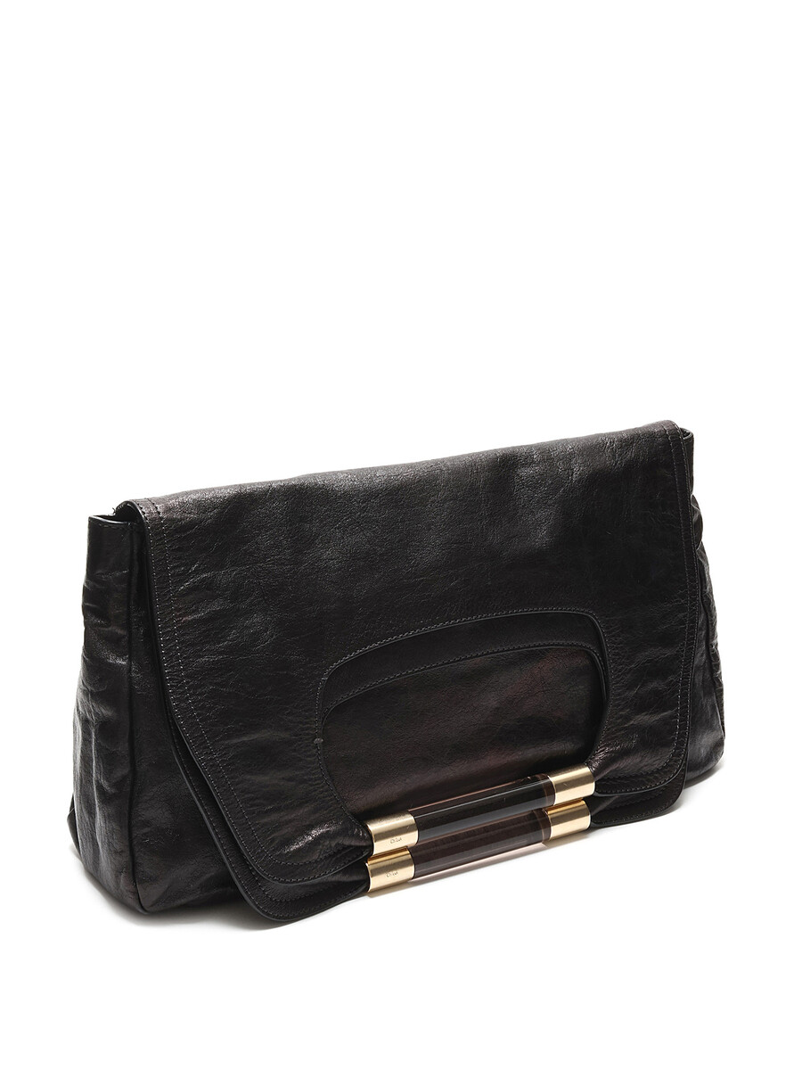Black leather convertible shoulder bag with snap closure. Features double top acetate handles with metal accents. Gold-tone hardware with logo engraving.