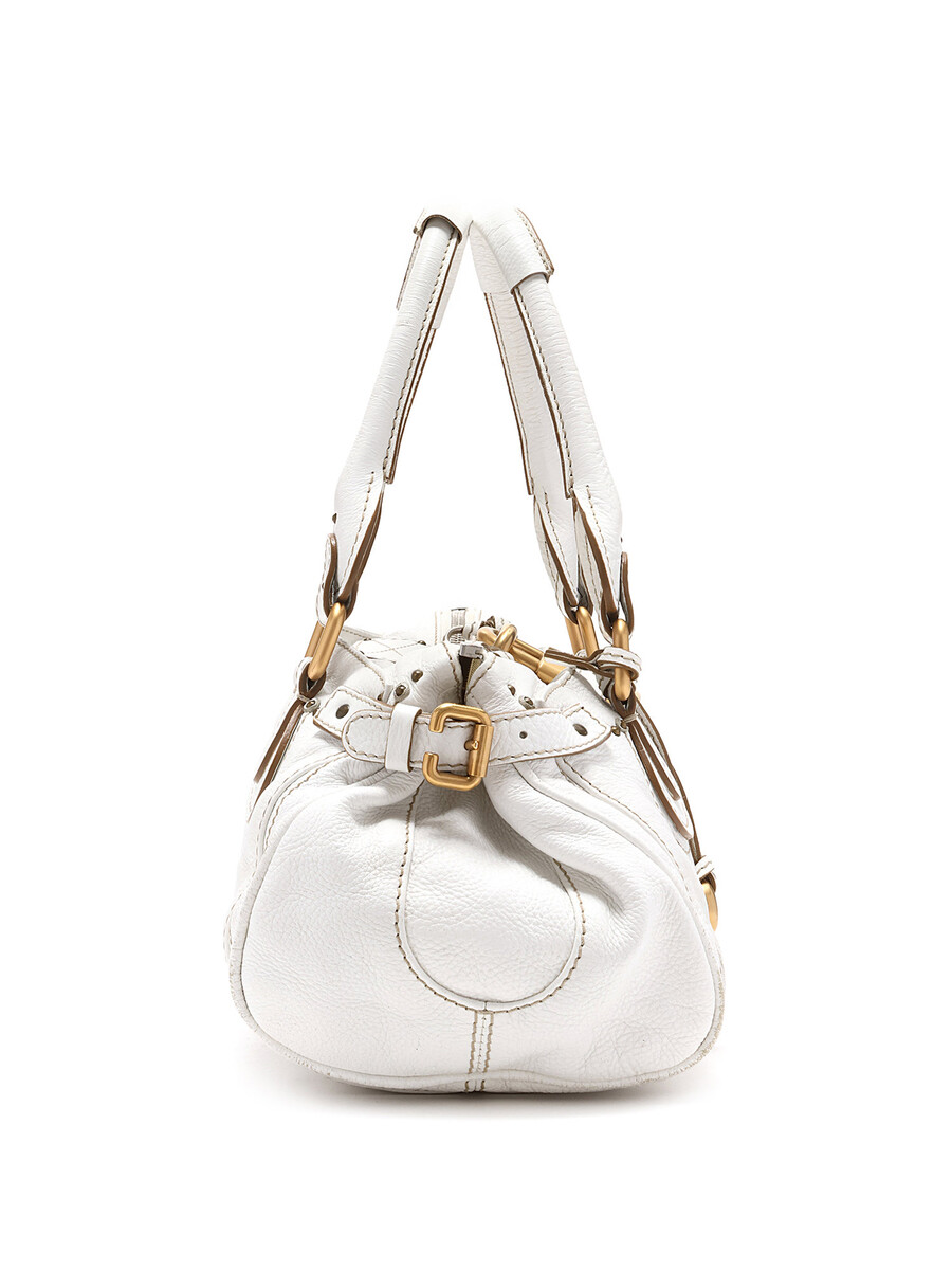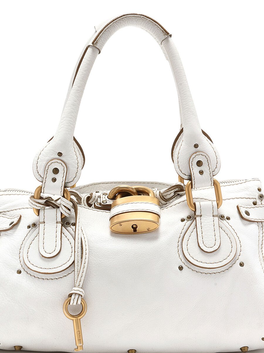 White grained leather shoulder bag featuring a padlock closure. Double rolled leather handles and leather trims. Gold-tone hardware.