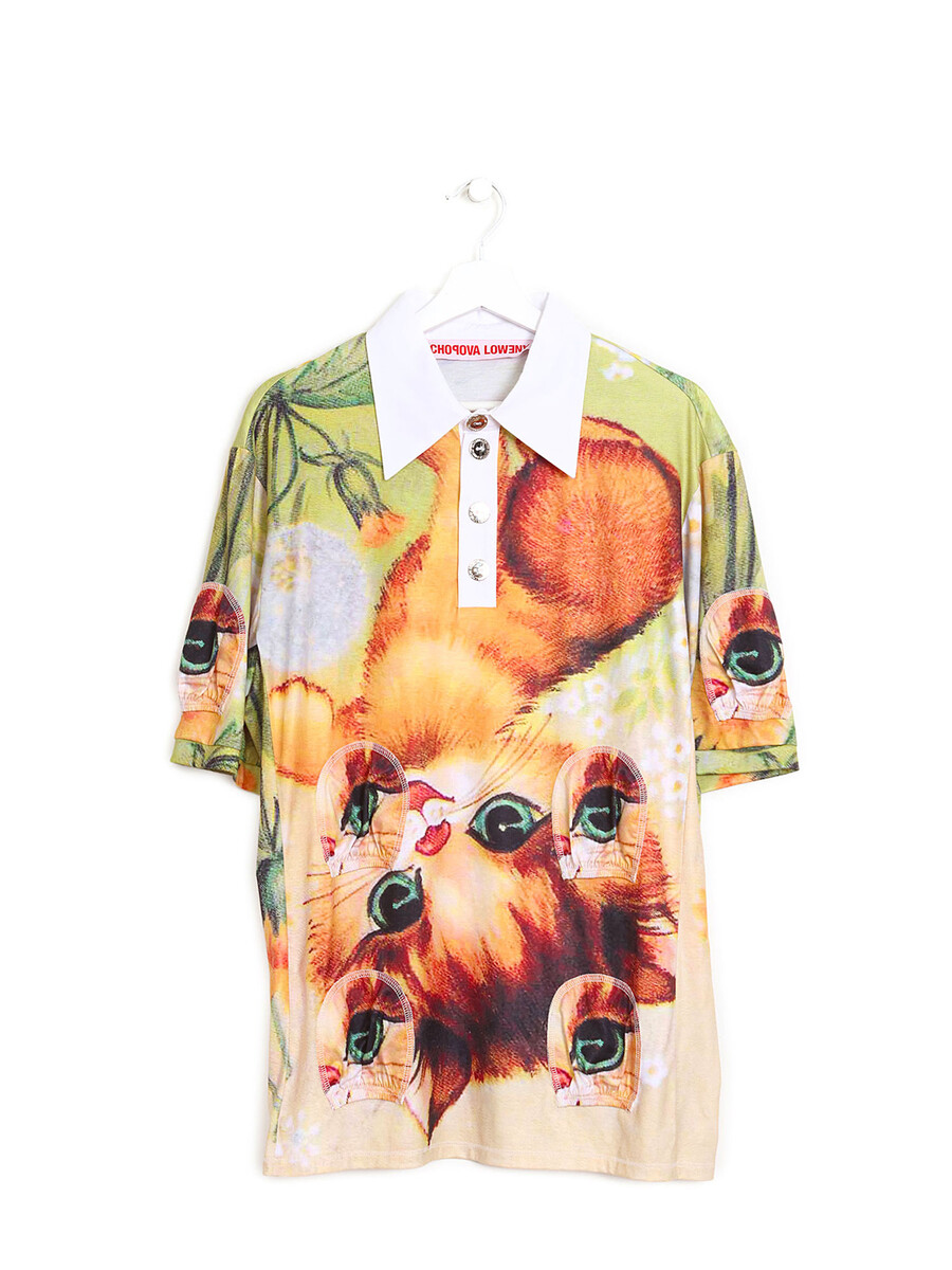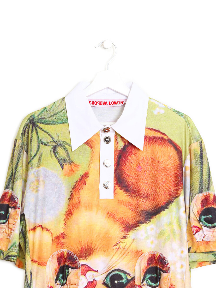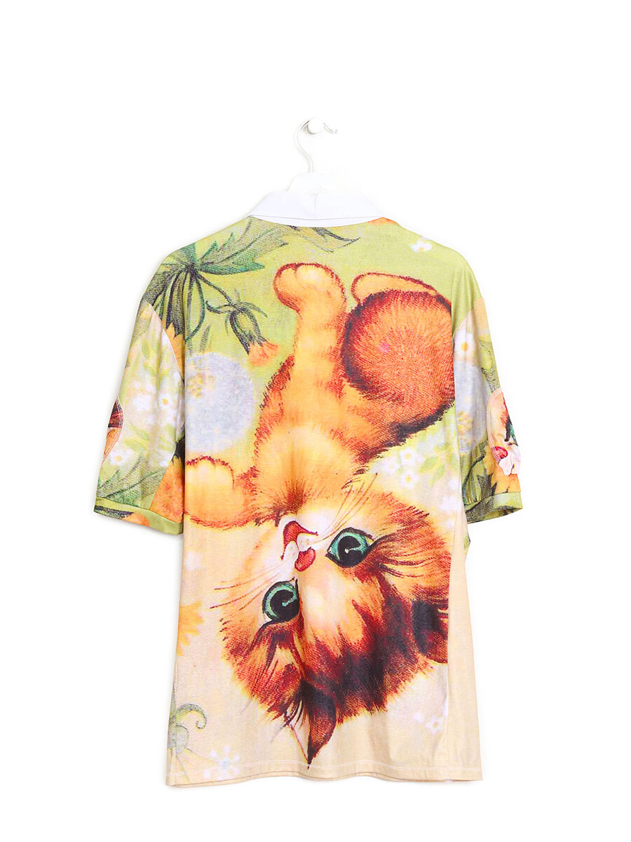 Short-sleeve animal print polo shirt. Button-up front closure. Classic shirt collar.