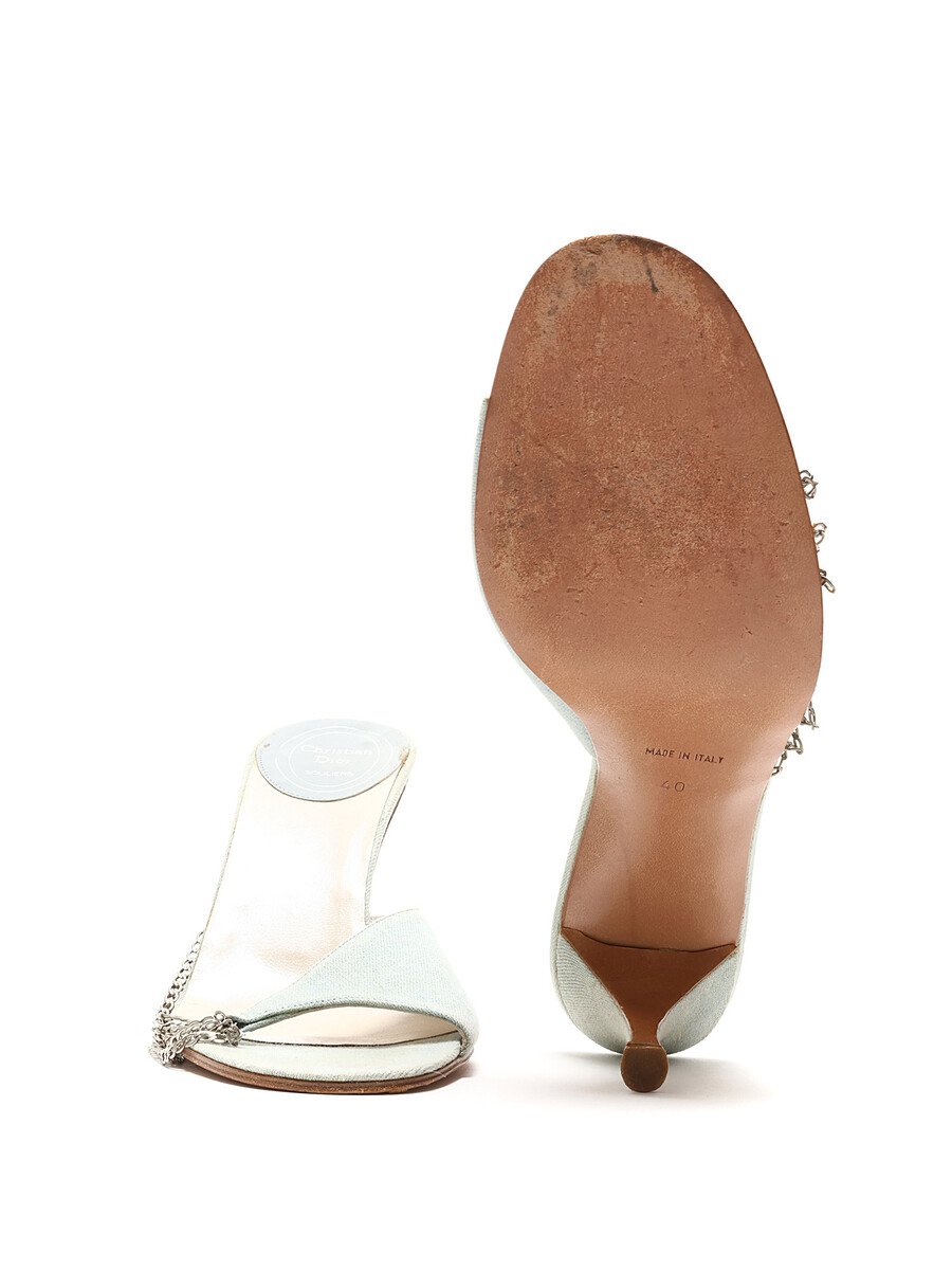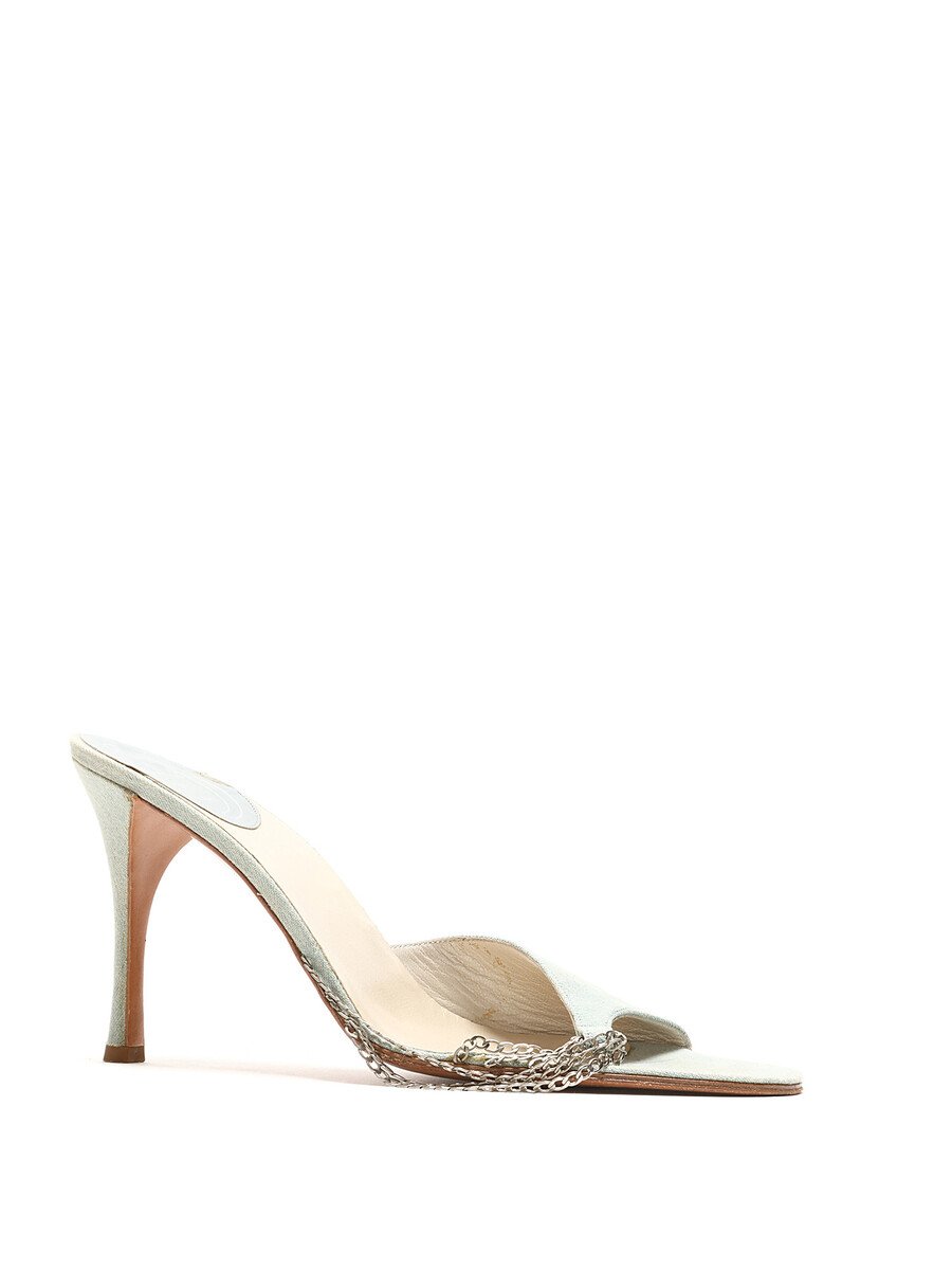 Denim blue mules with chain detailing. Open round toe. Leather sole.