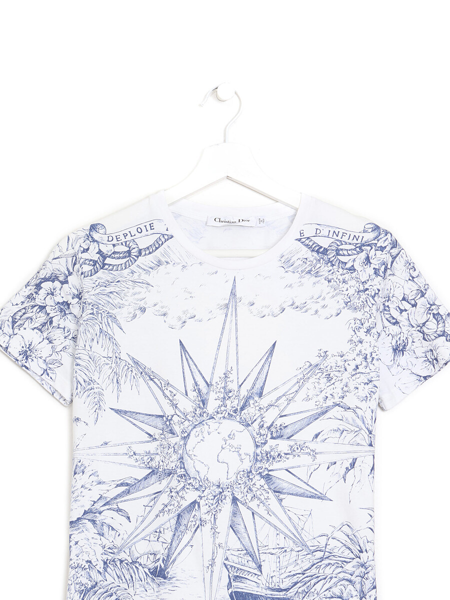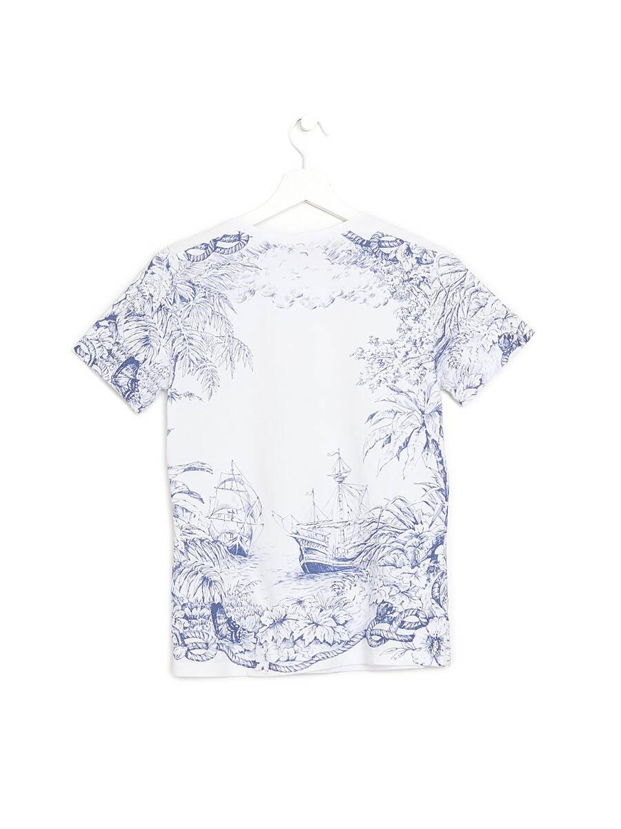 Short sleeve t-shirt featuring an abstract graphic pattern in navy blue and white. Round neckline.
