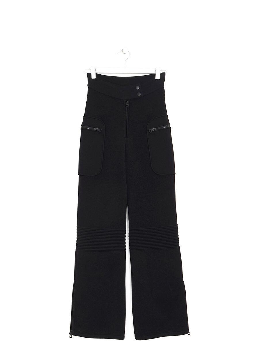Zipper fly pants with a button placket in black. Zipper pockets.