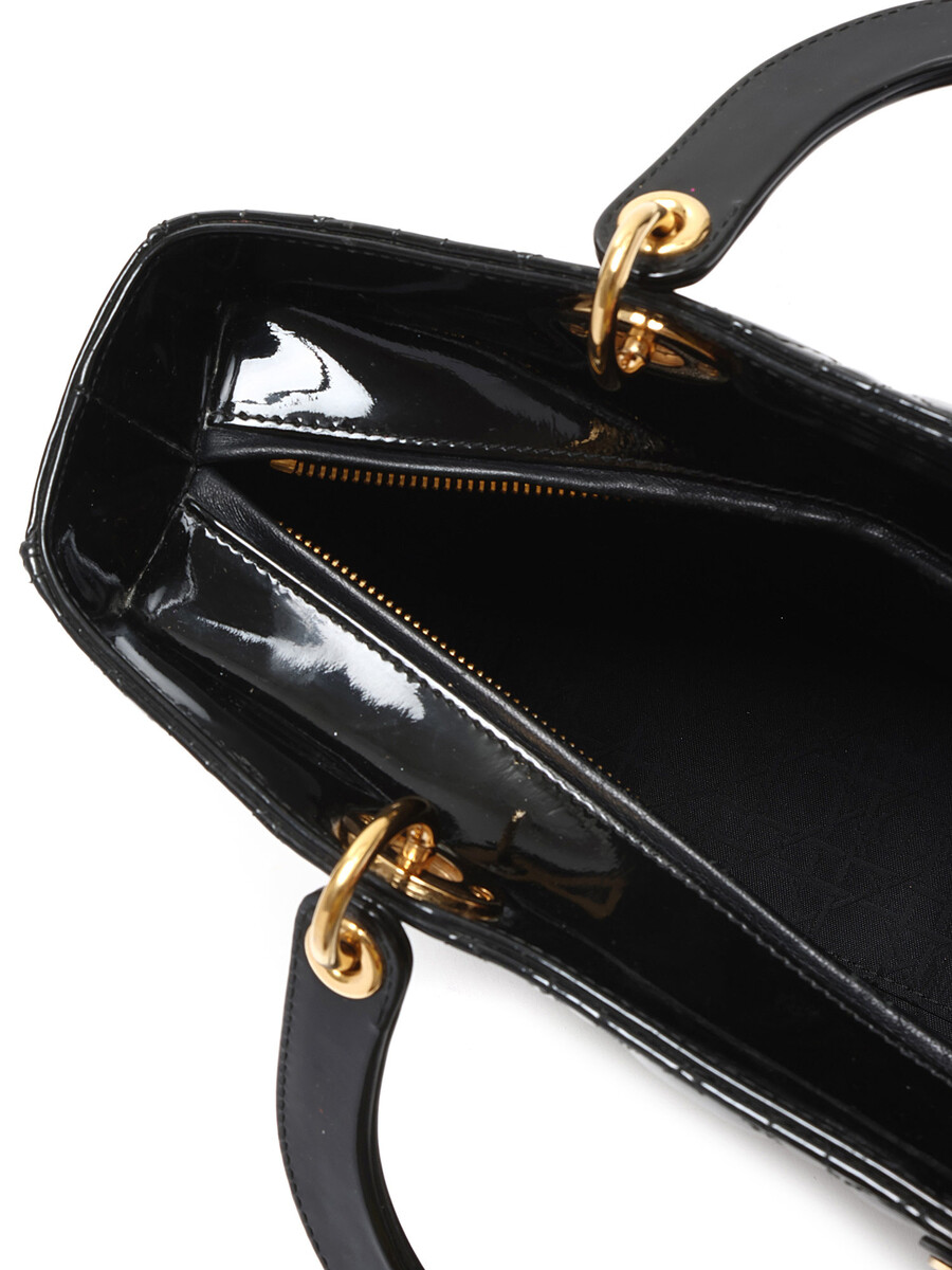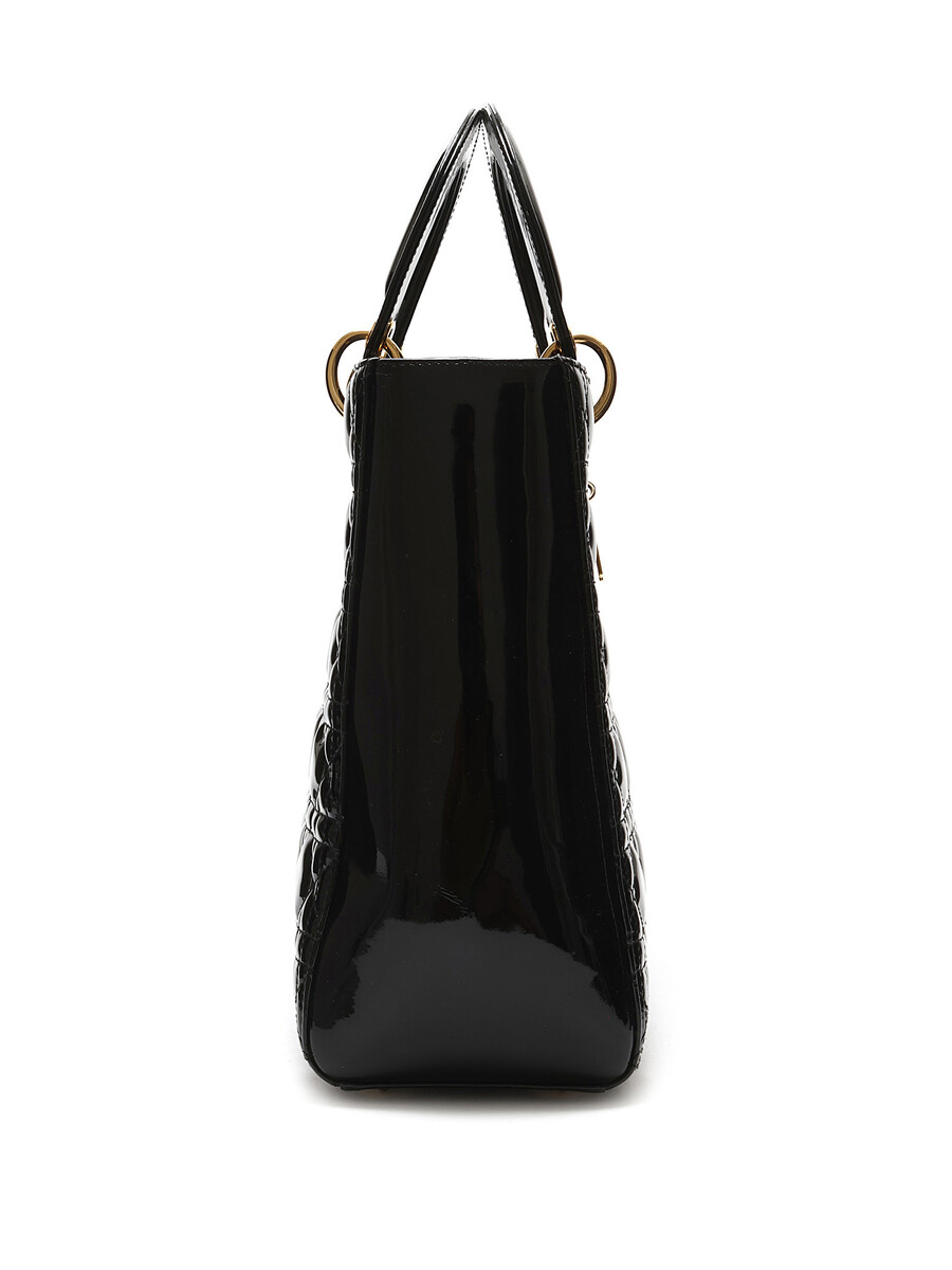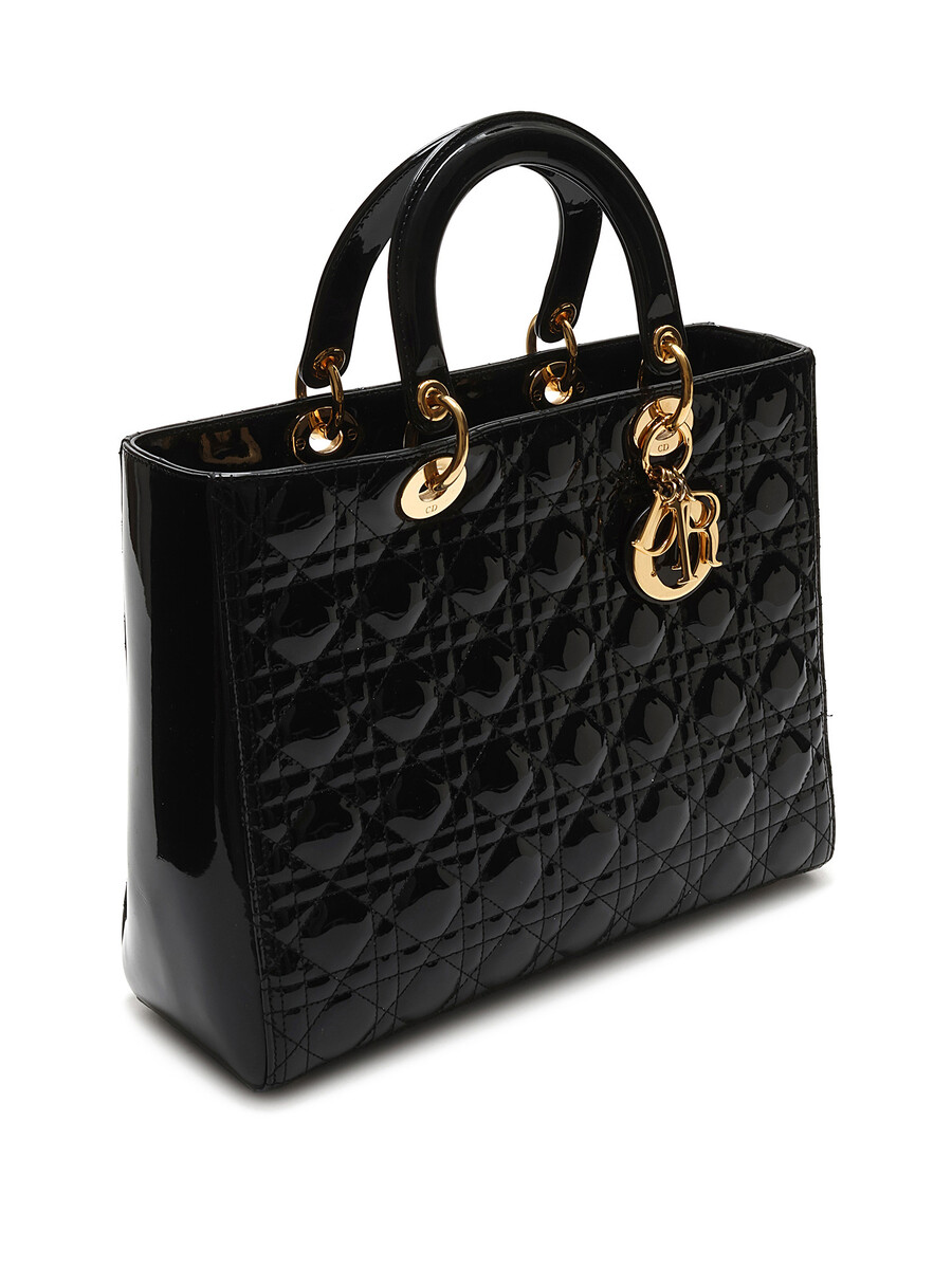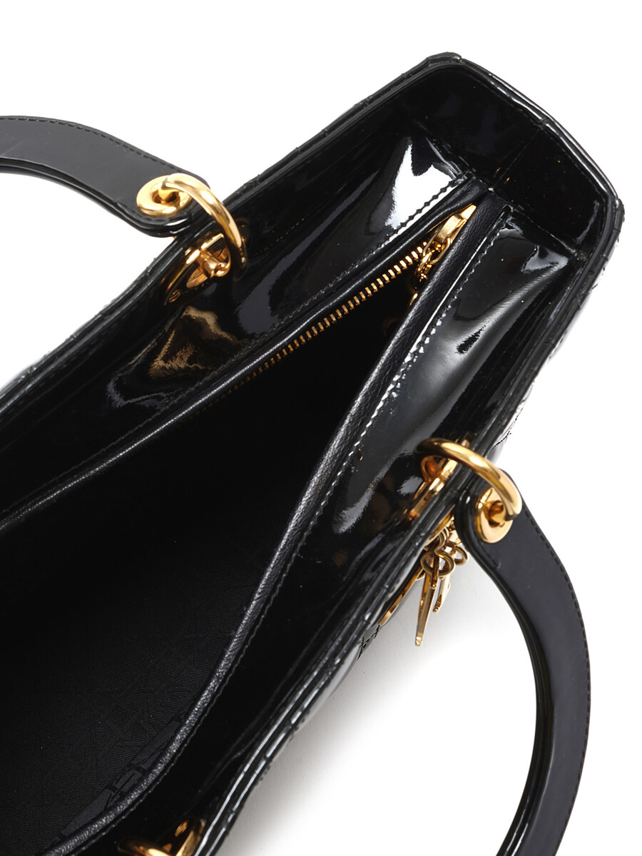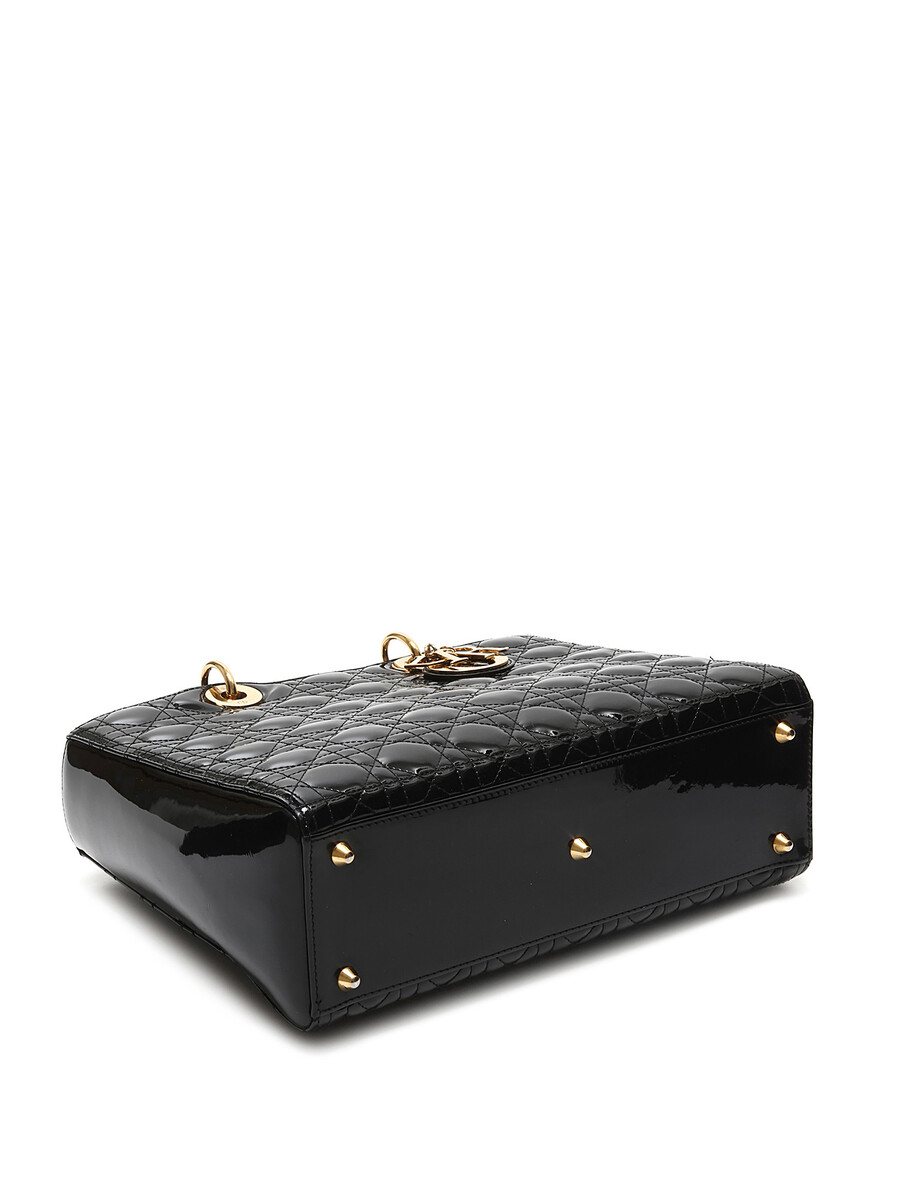 Black patent leather shoulder bag with Cannage stitching and gold metal hardware. Includes a patent leather shoulder strap.
