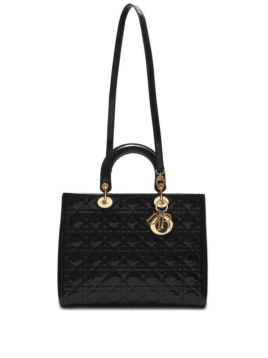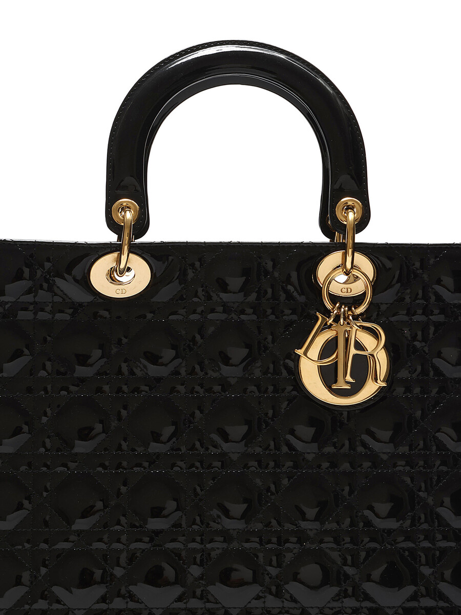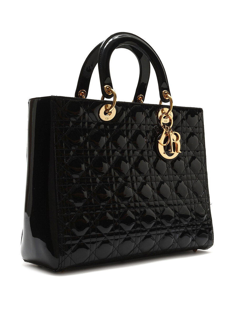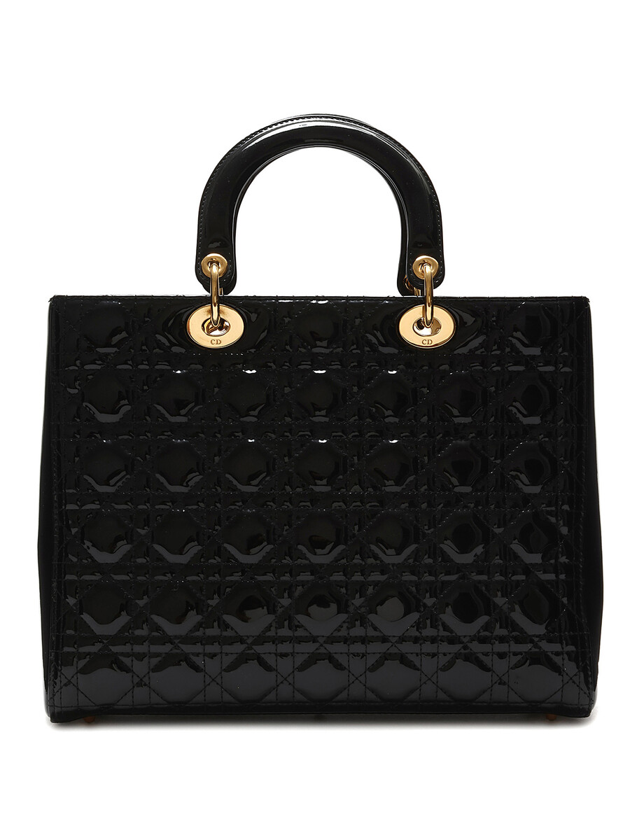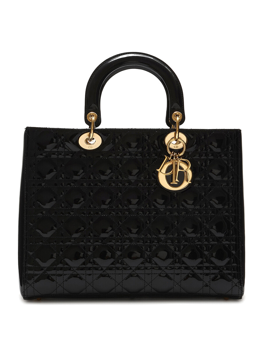 Black patent leather shoulder bag with Cannage stitching and gold metal hardware. Includes a patent leather shoulder strap.