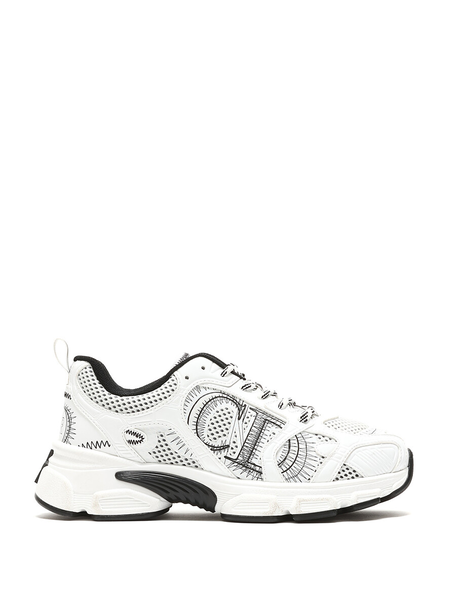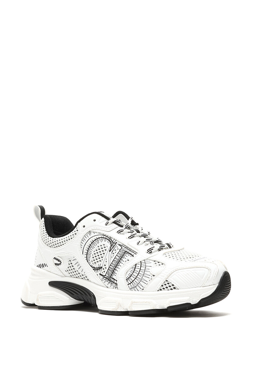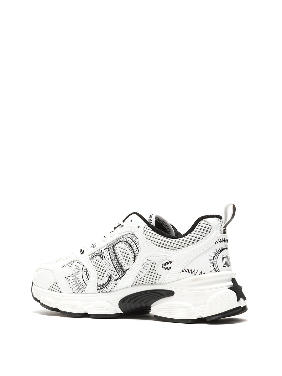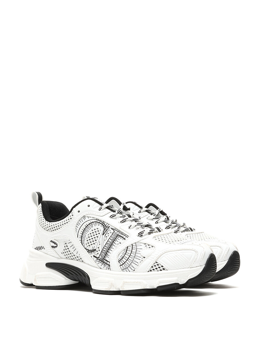 Mesh and leather sneakers in white and black. Lace-up closure with round toe style. Featuring a rubber sole.