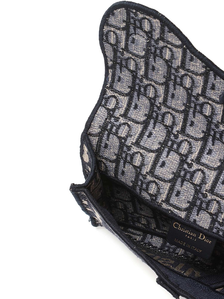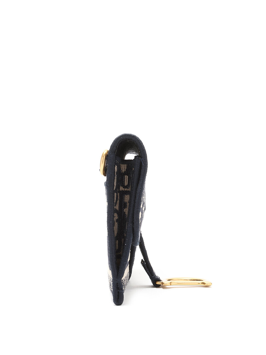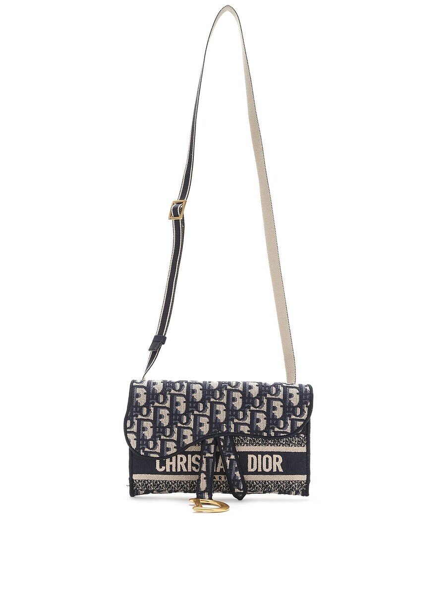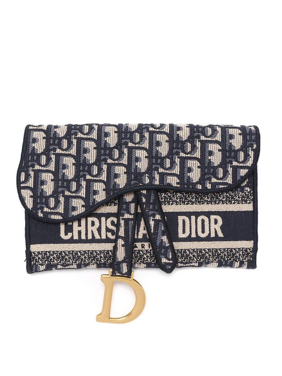 Oblique pattern saddle waist pouch in navy and cream. Features a magnetic flap closure and adjustable canvas strap. Gold-tone hardware.