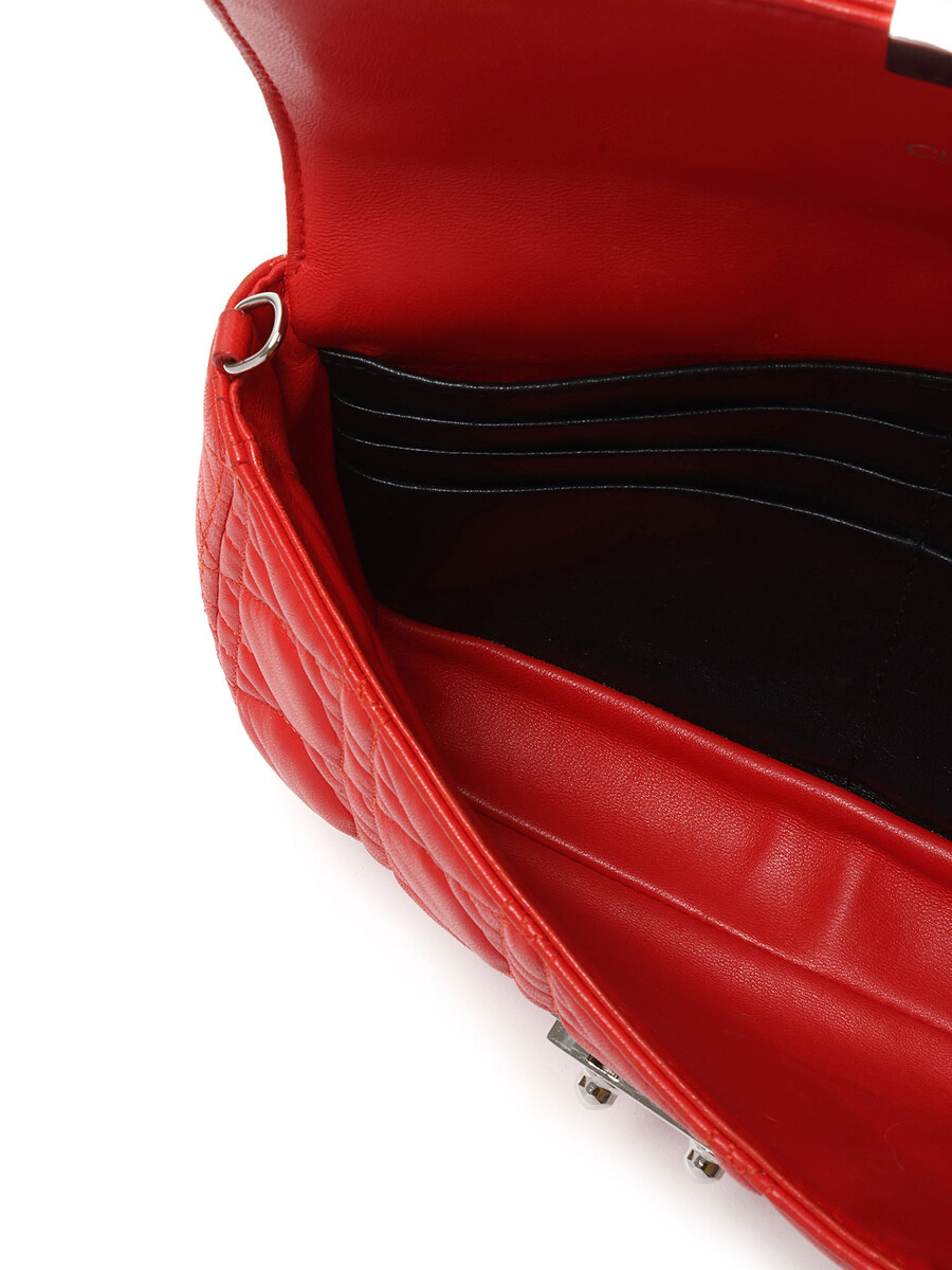 Red leather shoulder bag featuring Cannage quilting. Snap closure. Silver-tone chain strap. Comes with dust bag.