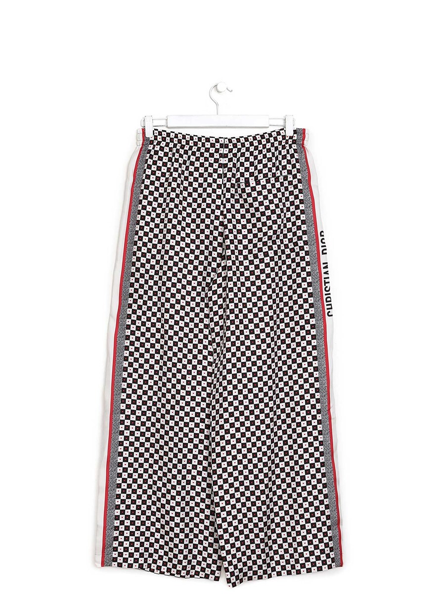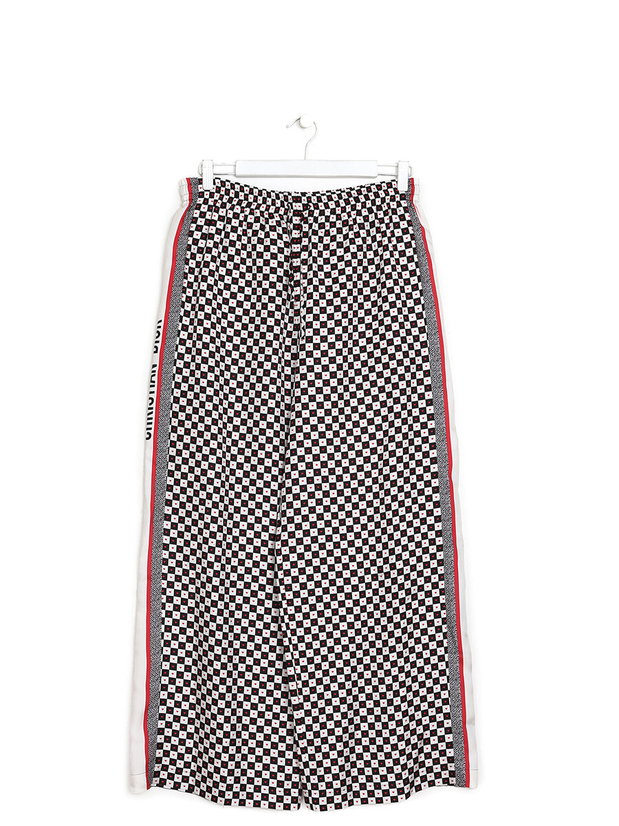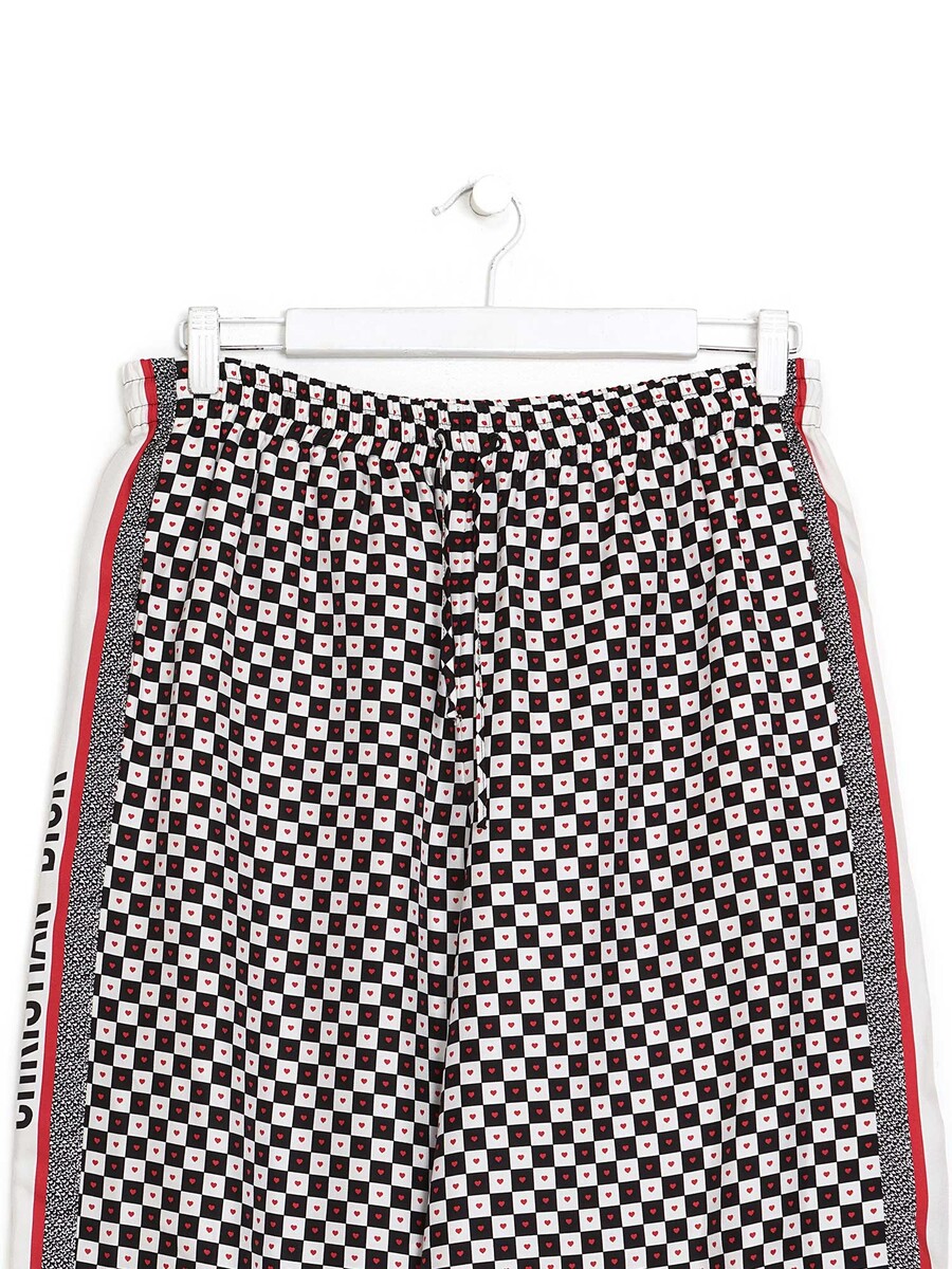 Silk plaid pants with black and white heart pattern accents in red. Elastic waistband with drawstring closure. Straight legs.