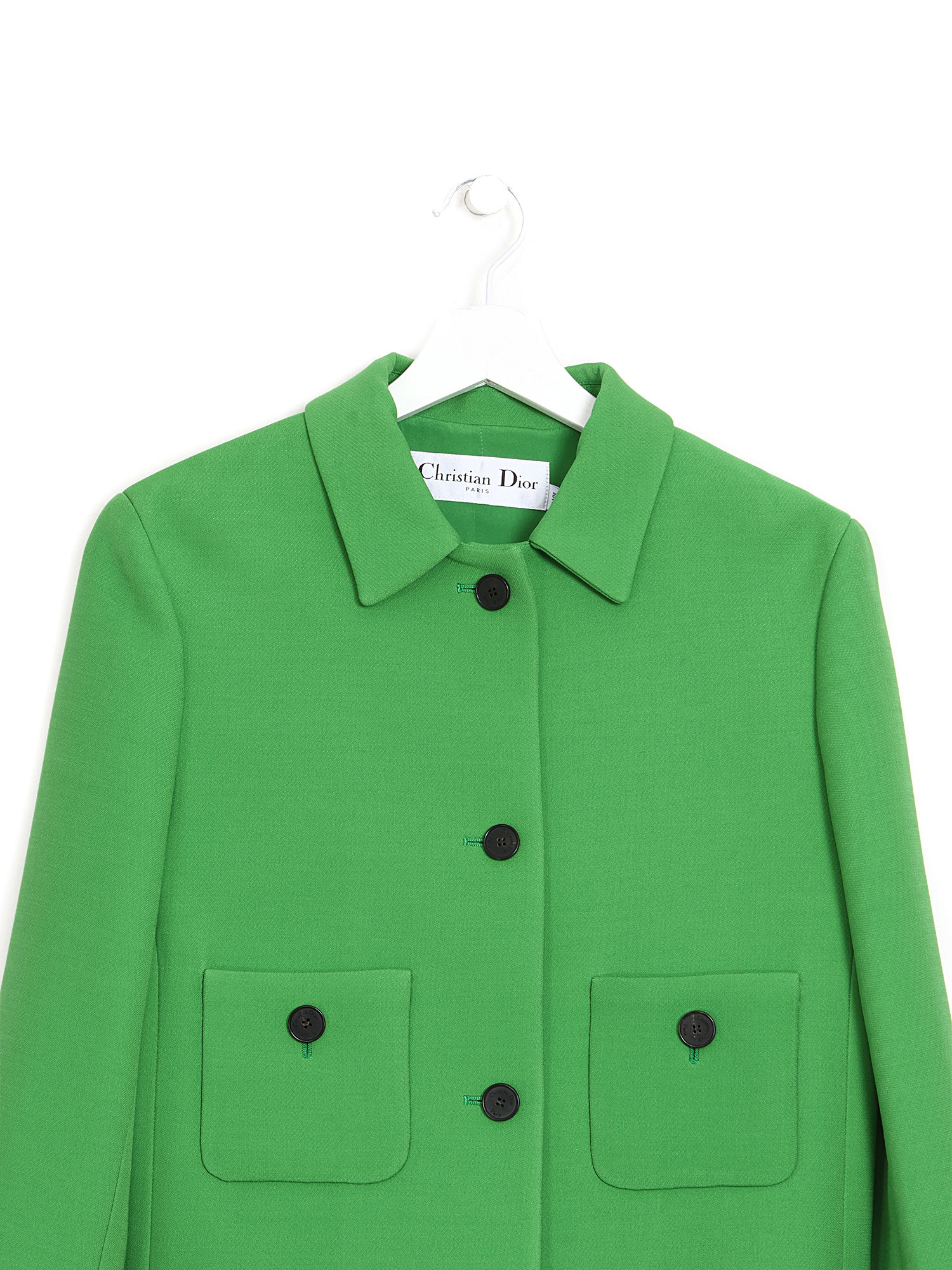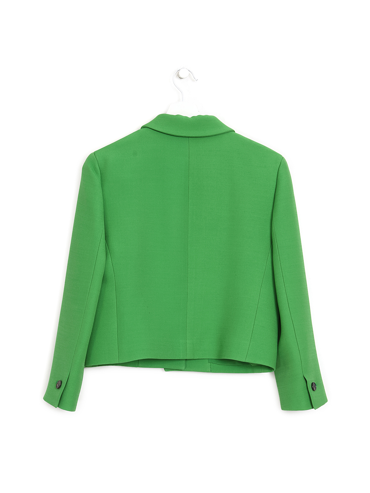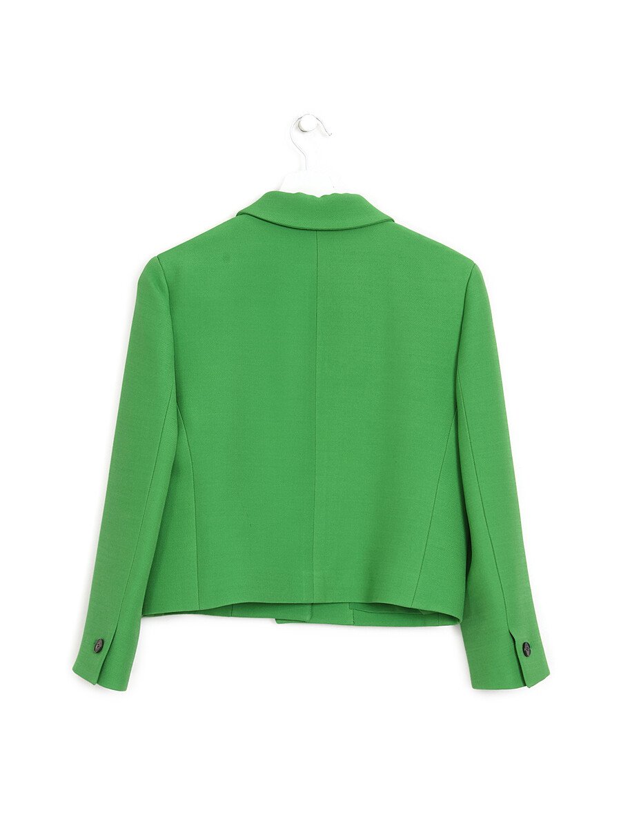 Long sleeve green blazer with notch lapel collar. Button-up closure. Patch pockets at front. Tailored fit.