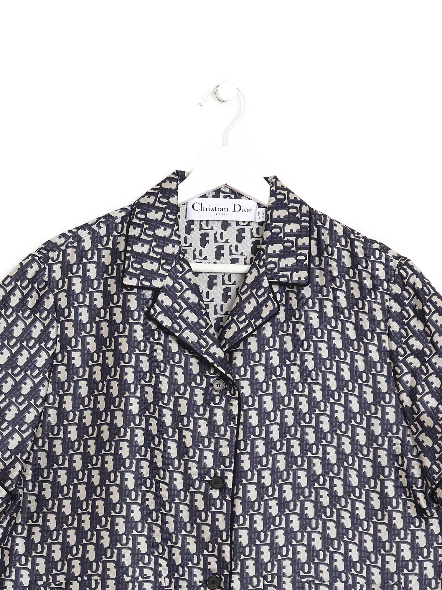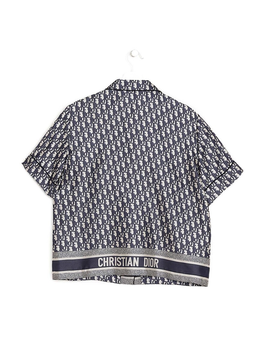 Short-sleeve geometric pattern shirt with a shirt collar.