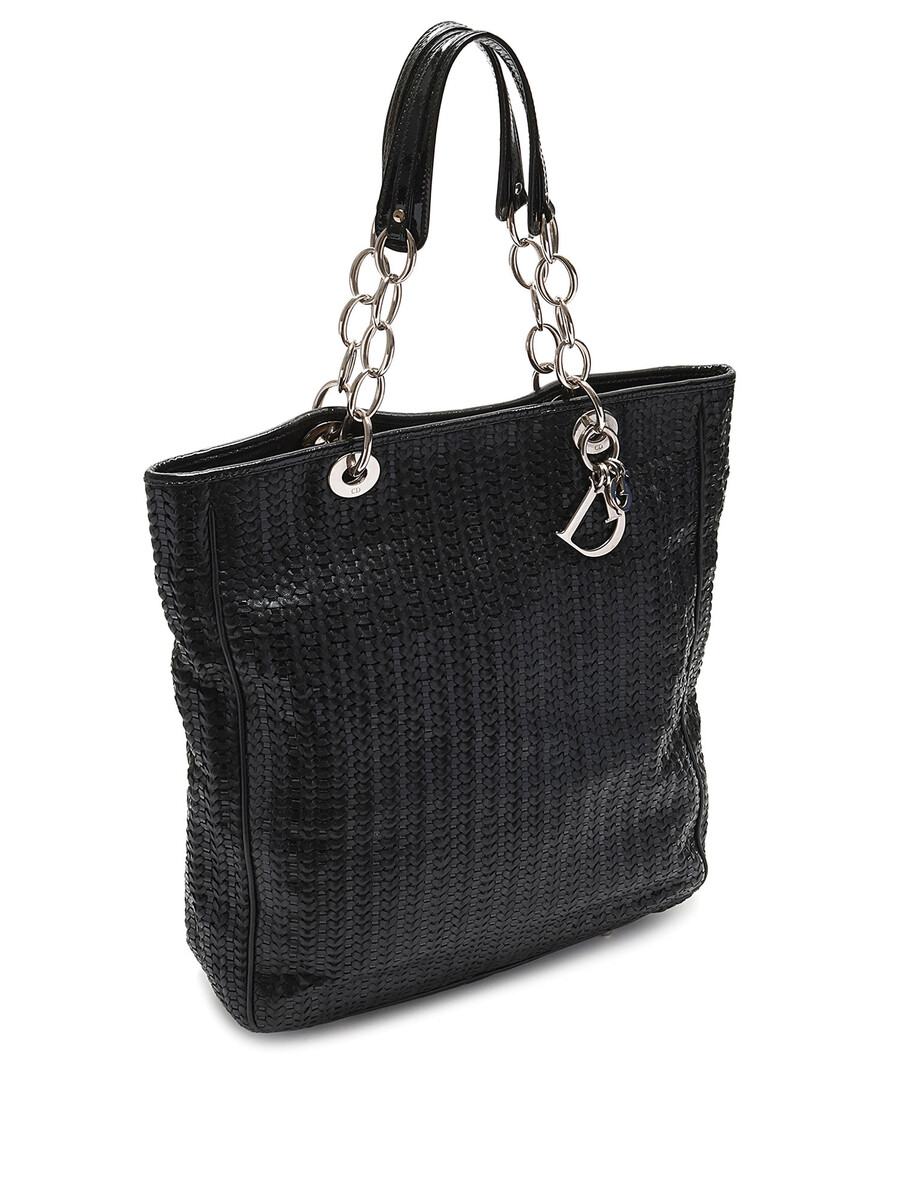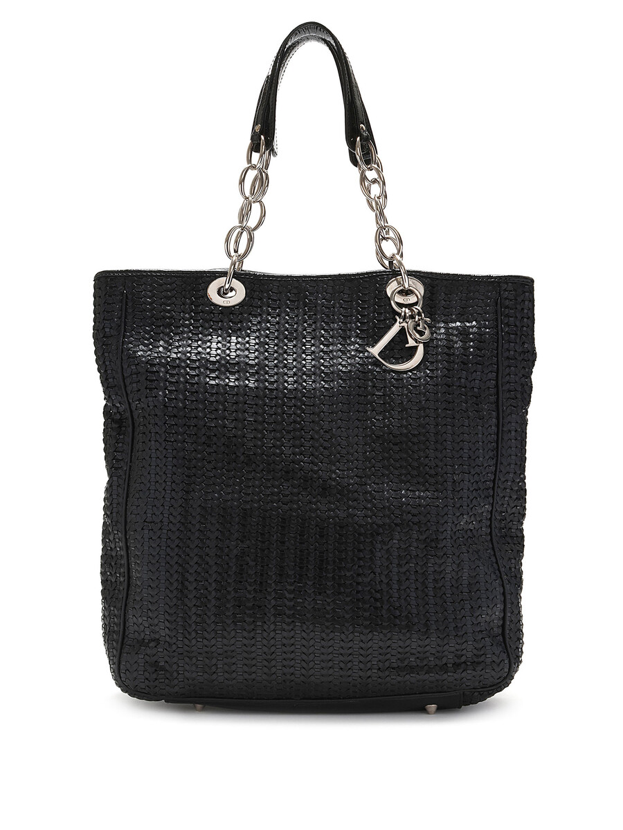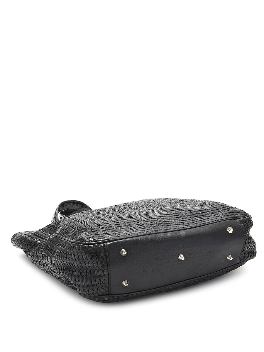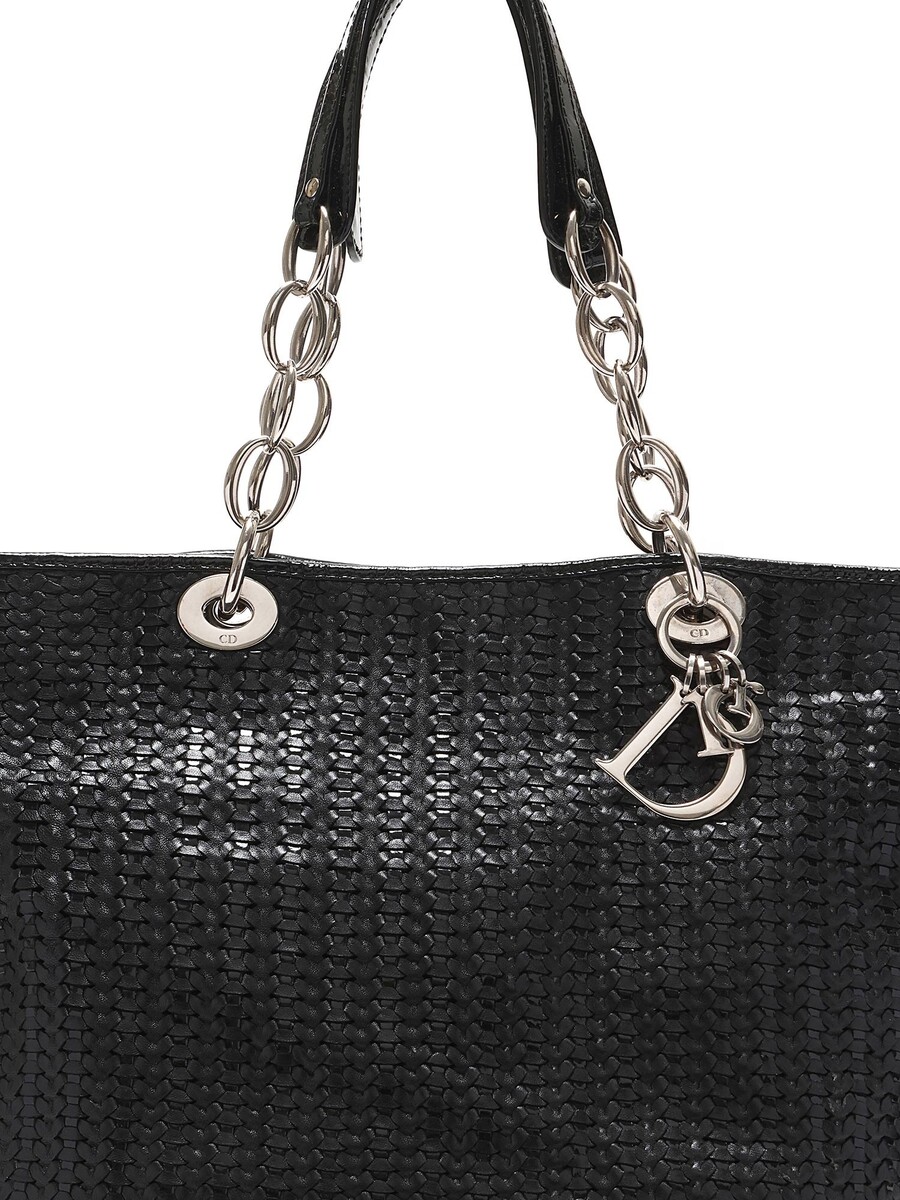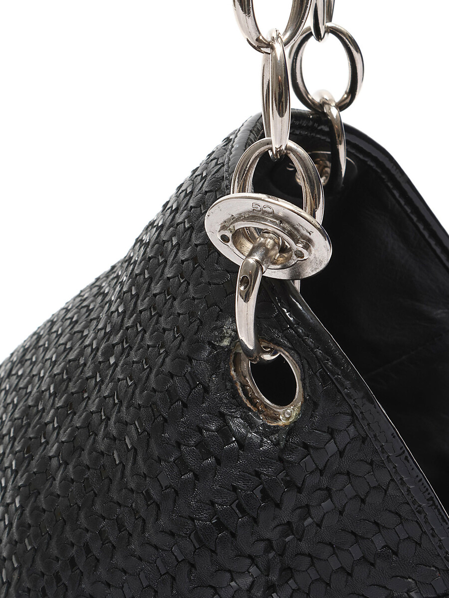 Woven leather tote in black with a magnetic snap closure. Features chain and leather strap with silver-tone hardware.