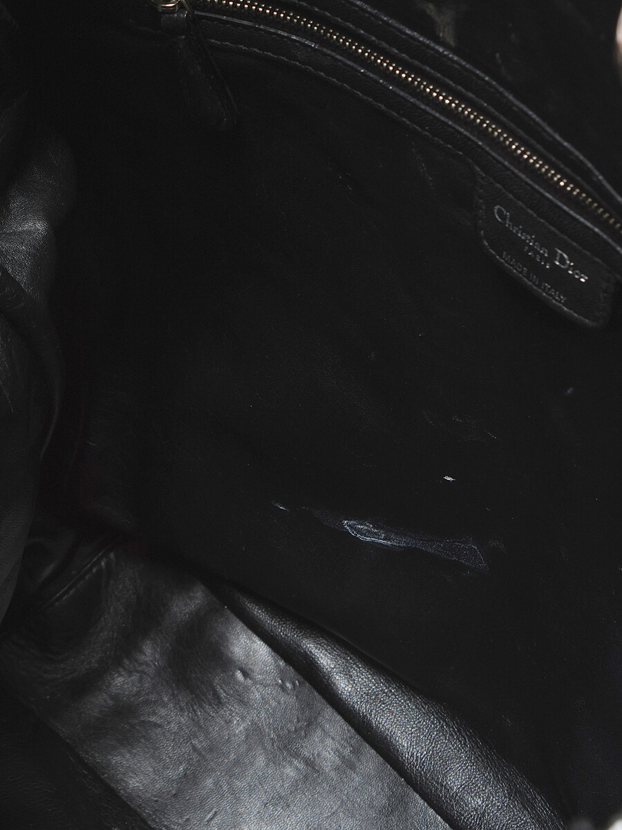 Signs of use. Wear to corners. Scuffs. Unglued grommet at strap base. Stains at lining.