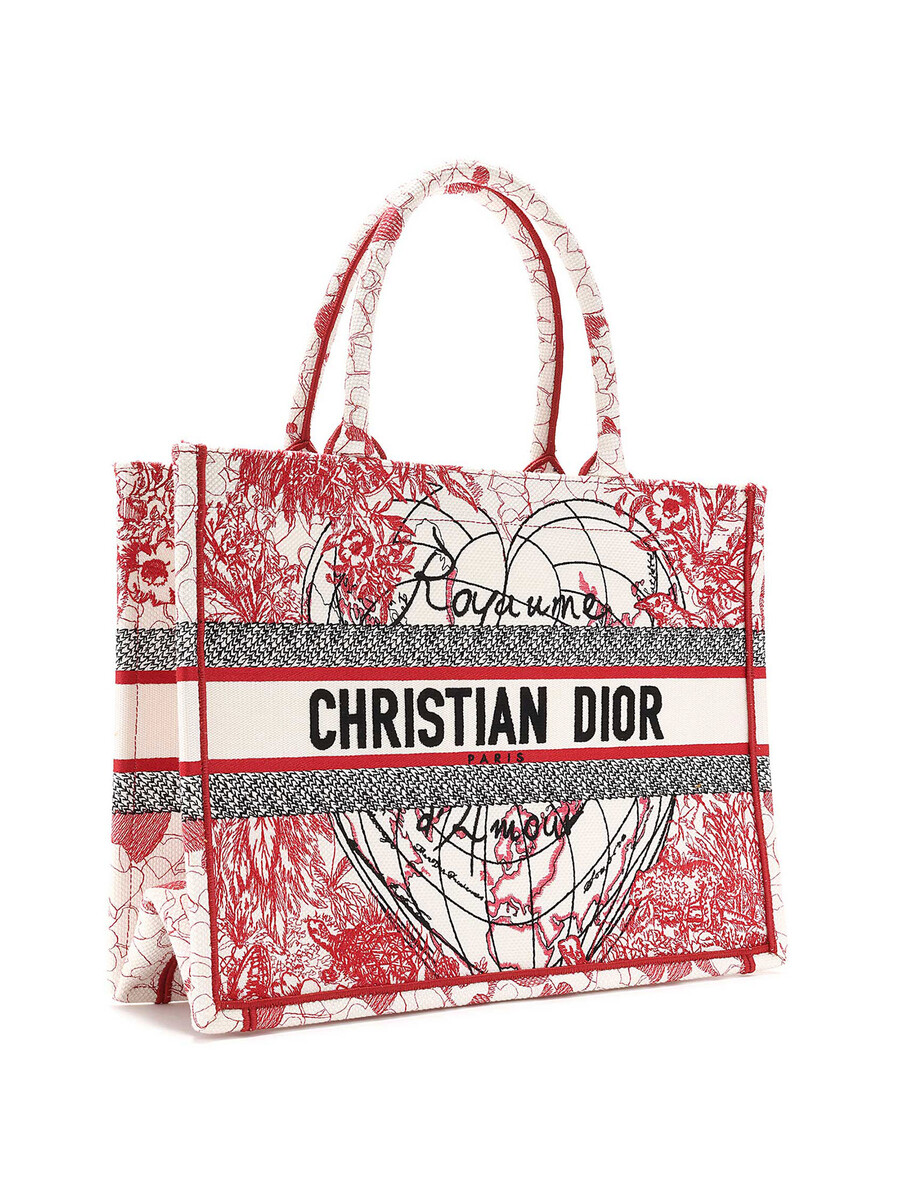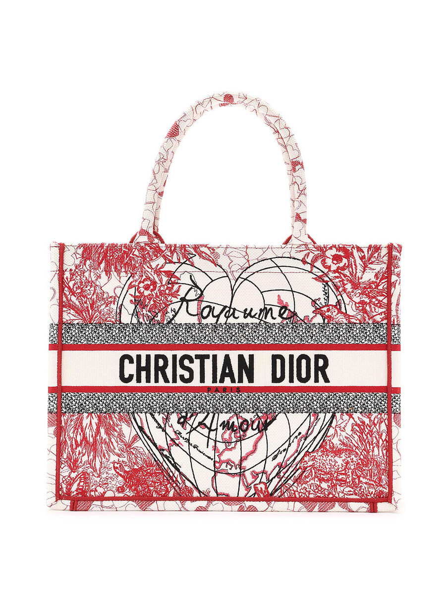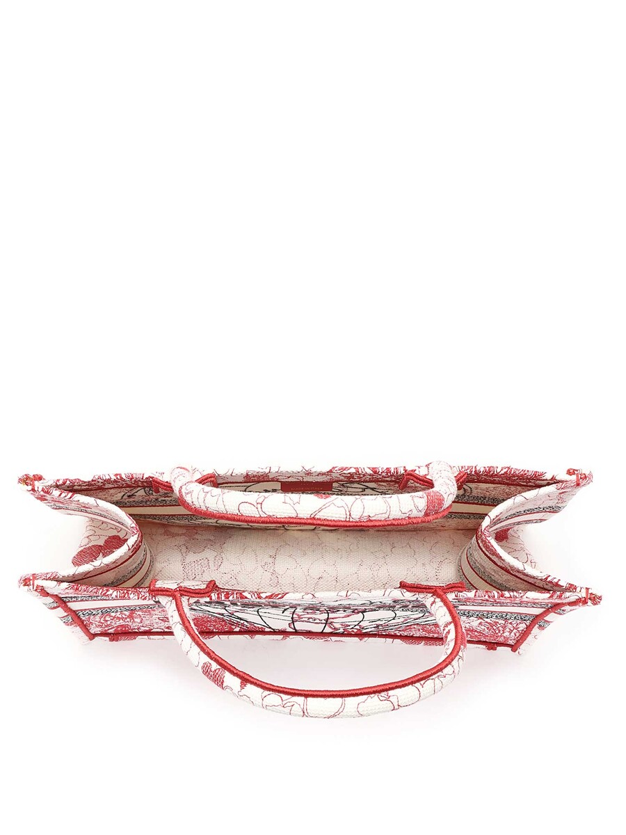 Embroidered canvas medium book tote featuring a world map and floral motifs in red, white, and black. Rolled top handles. Comes with a dust bag.
